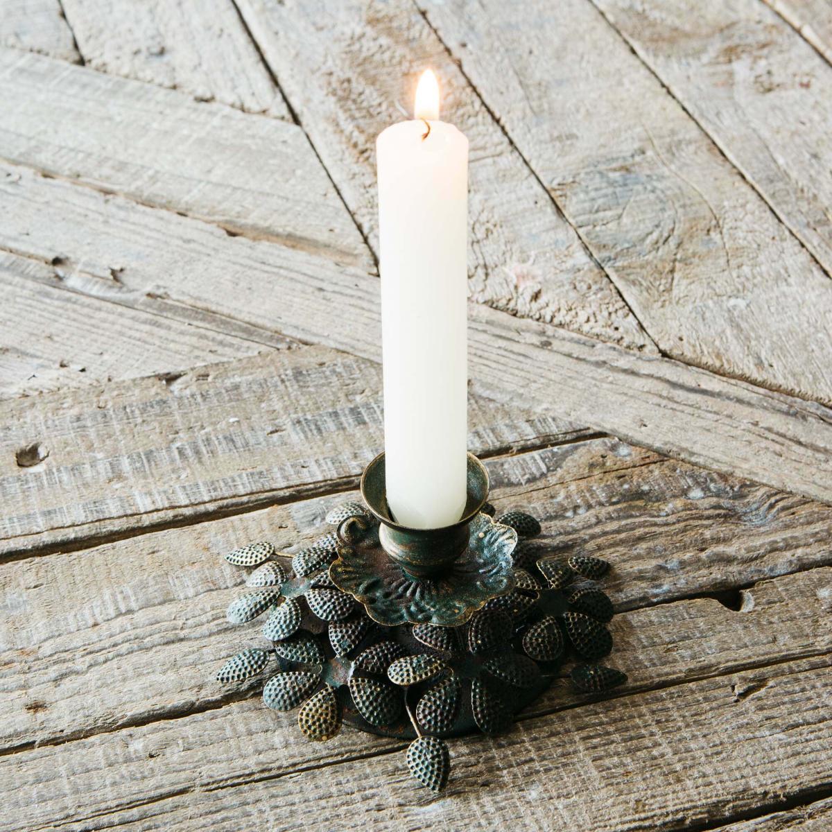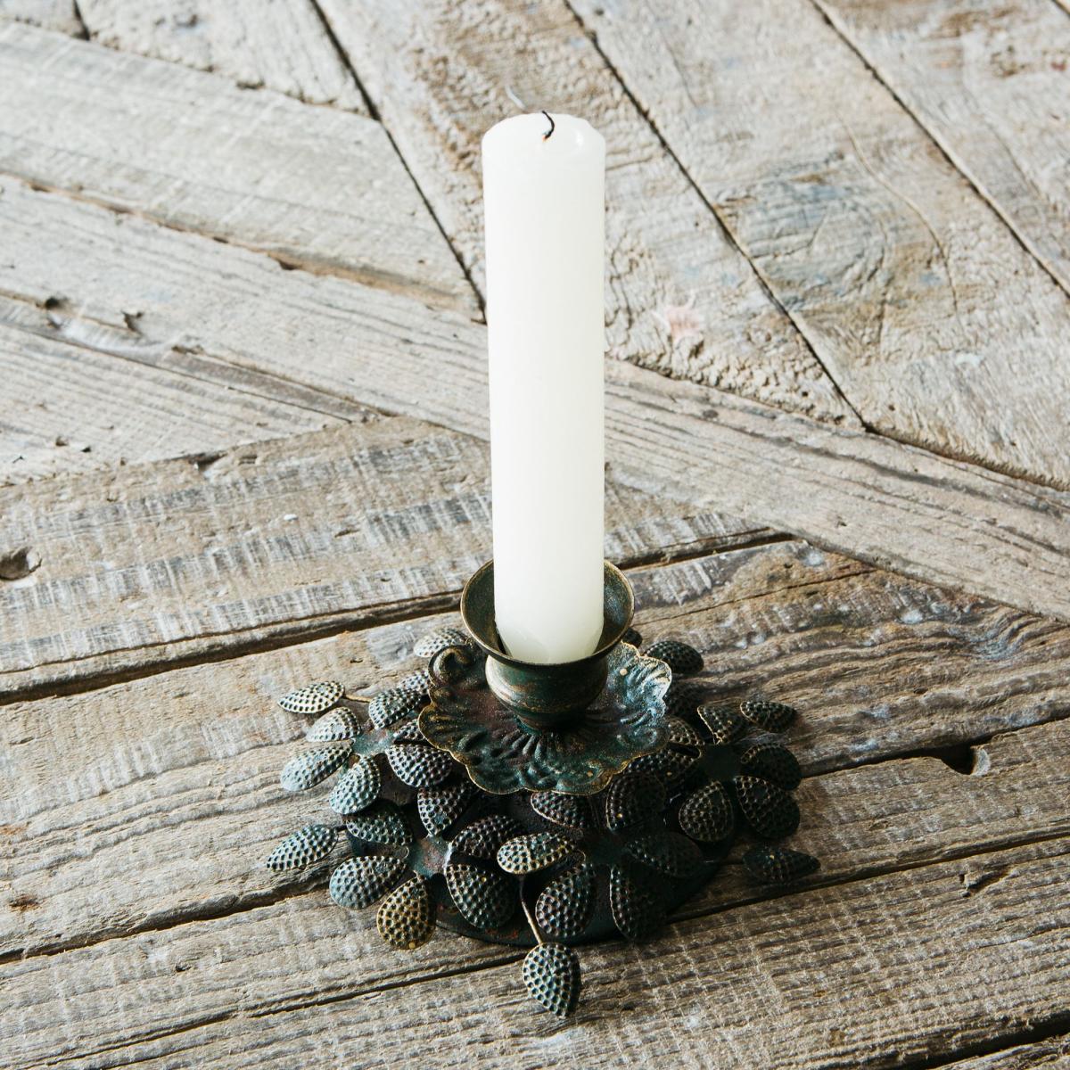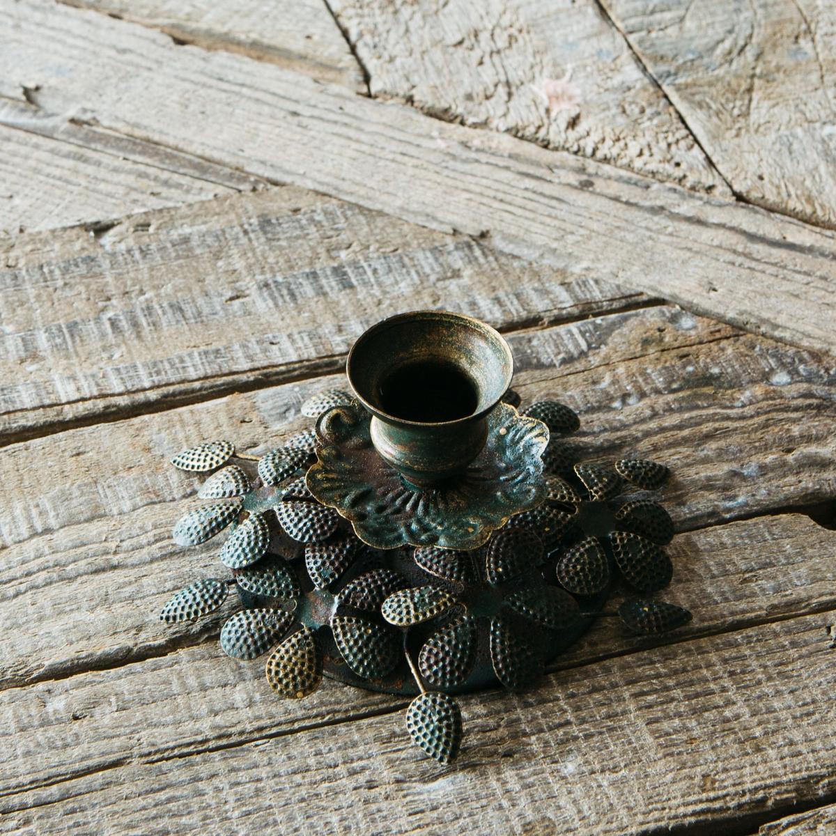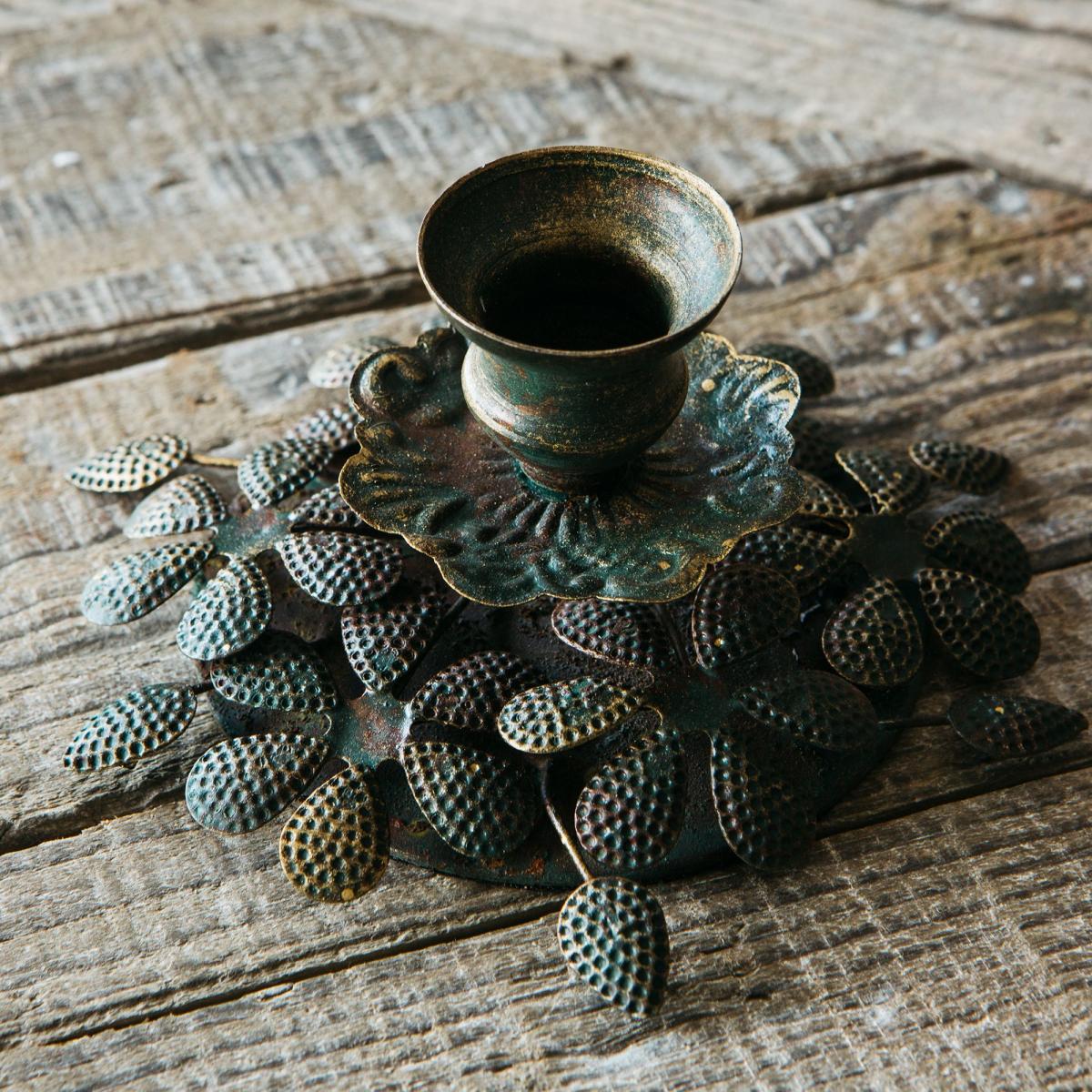 A romantic leaf candlestick for your mantlepiece or dining table made of iron with an antiqued finish.