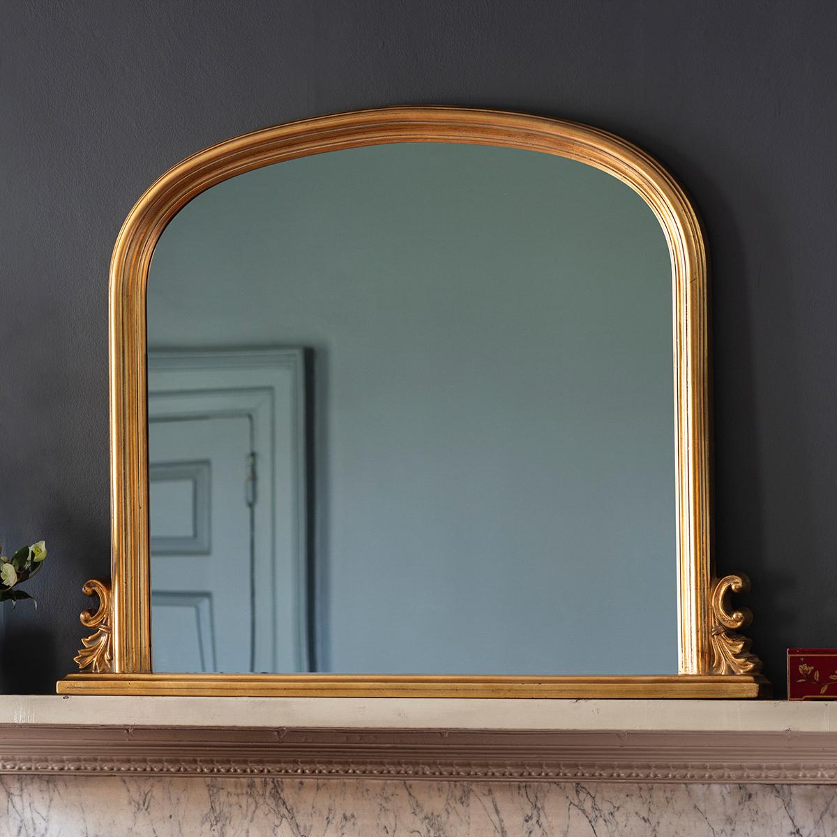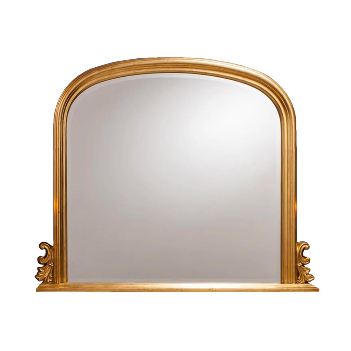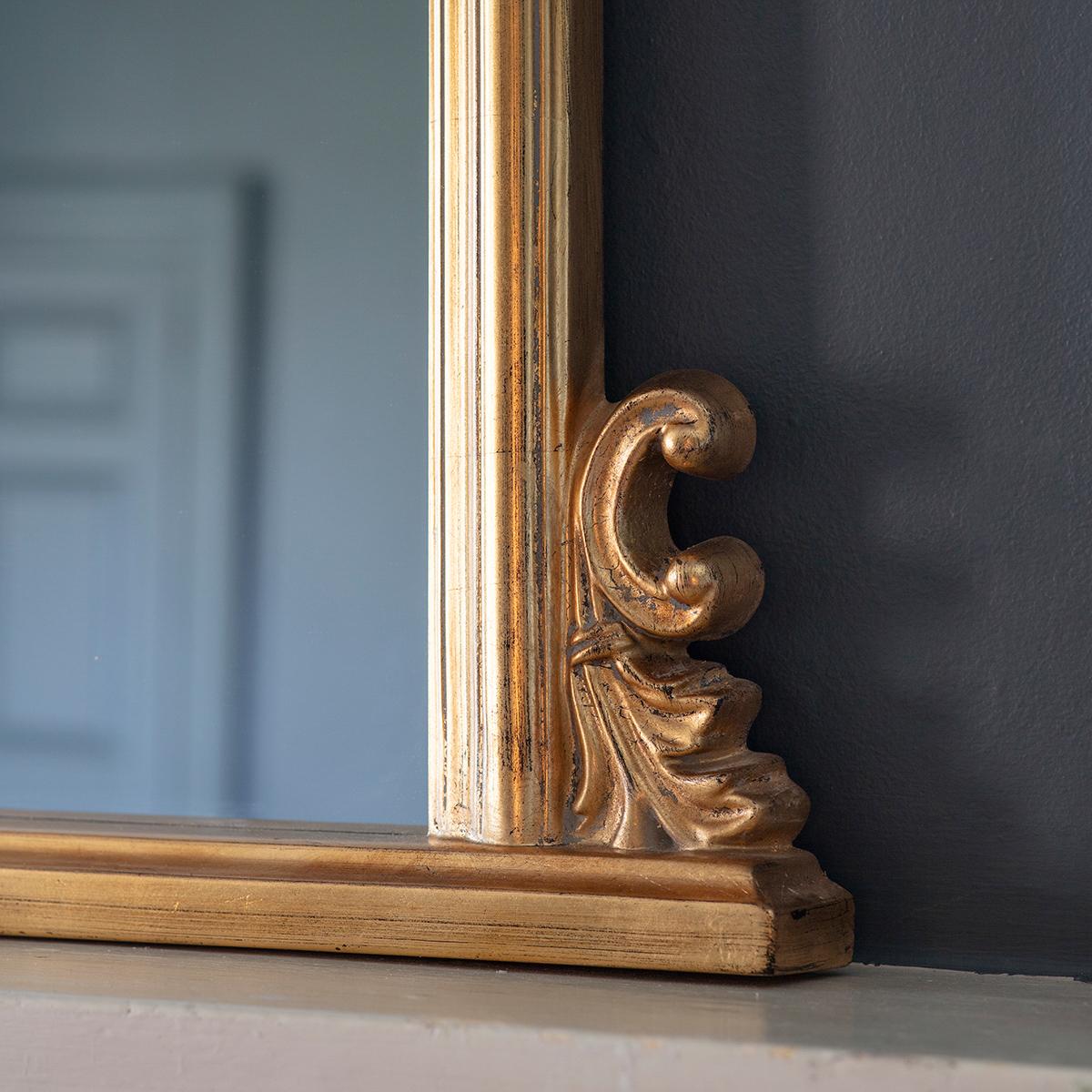 With its graceful curves and refined design, this over mantel mirror adds a touch of grandeur to any space. Adorned with intricate detailing and finished in a rich gold leaf, the Antique Mirror commands attention