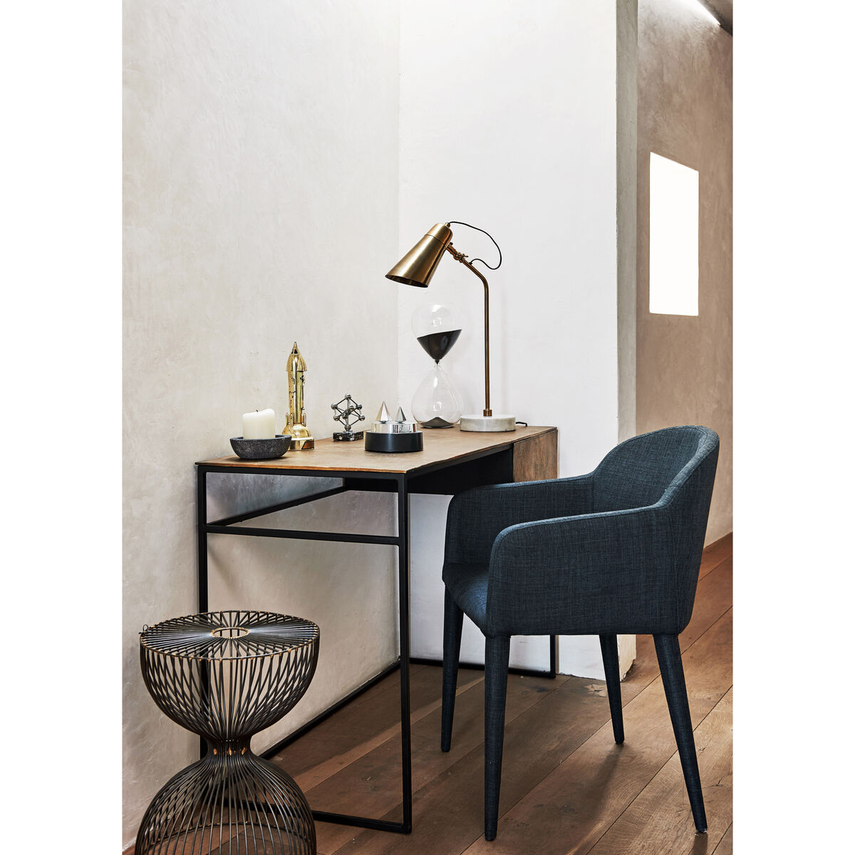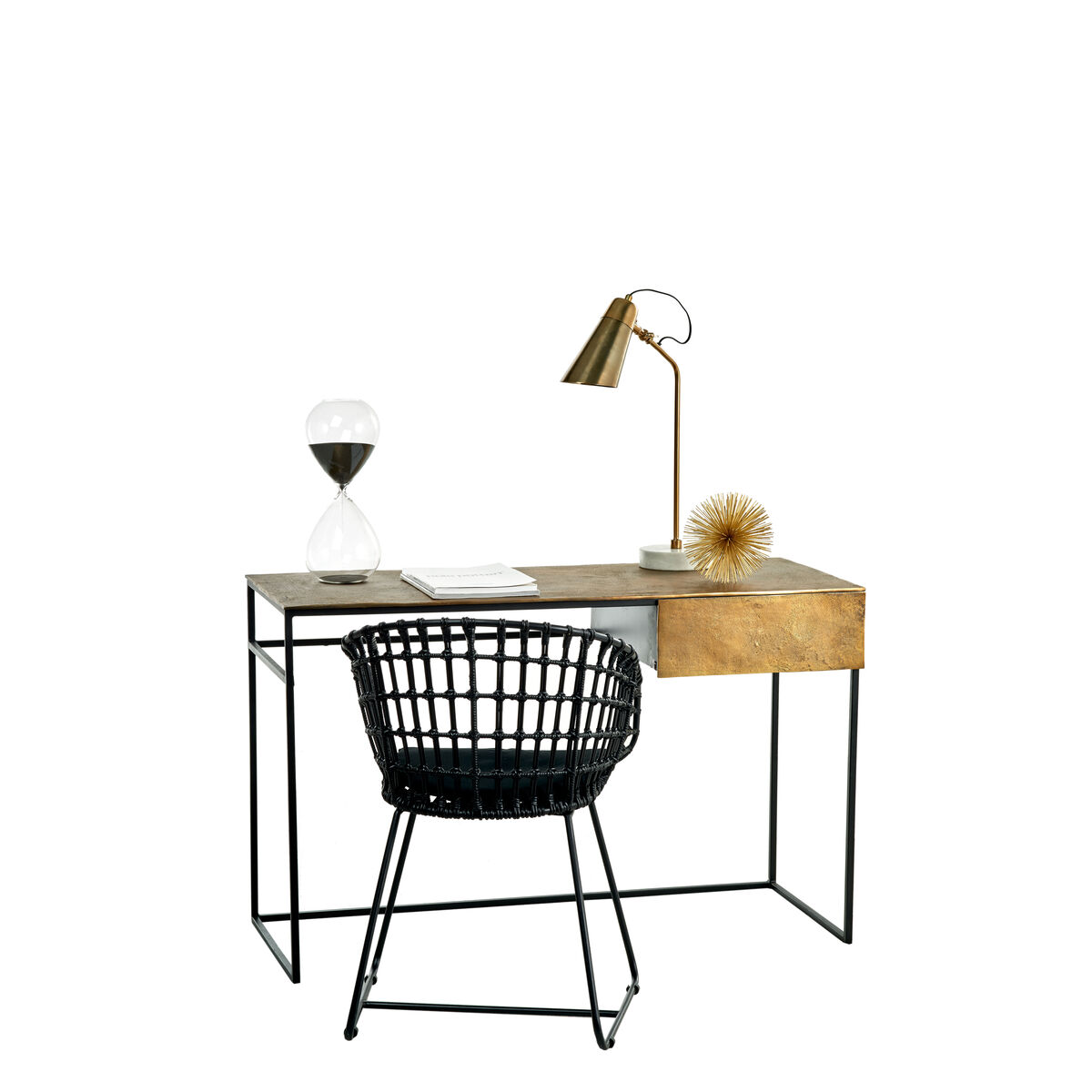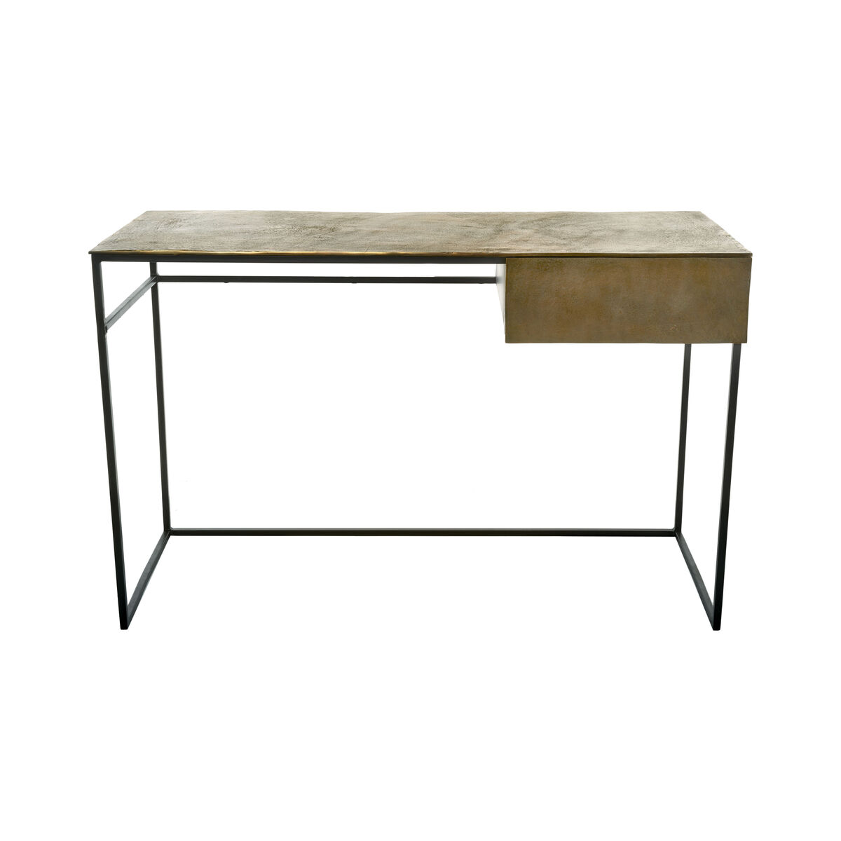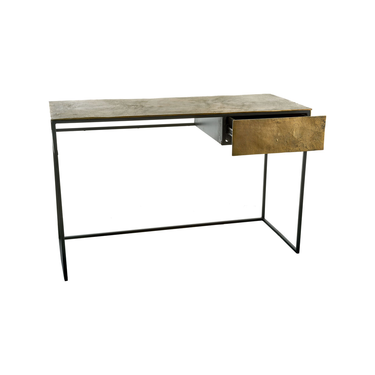 Chic and refined, this metal desk has a beautiful antique brass finish with a slightly irregular and textured surface. The black iron base has clean, rigorous lines that offer an astonishing harmony to the whole, a mix of modernity and tradition. This practical desk has a sliding drawer. Thanks to its small size (L 120 x Depth 51), the Antique Shine lets you create a functional, elegant office area wherever you want: in a living room, bedroom or entrance. It can also act as a console.