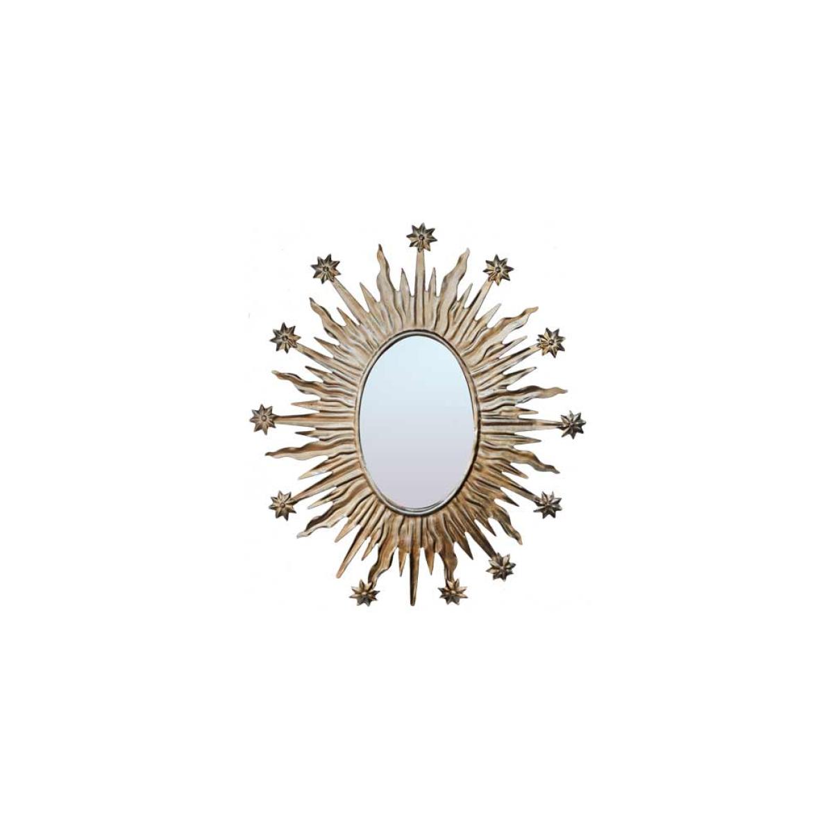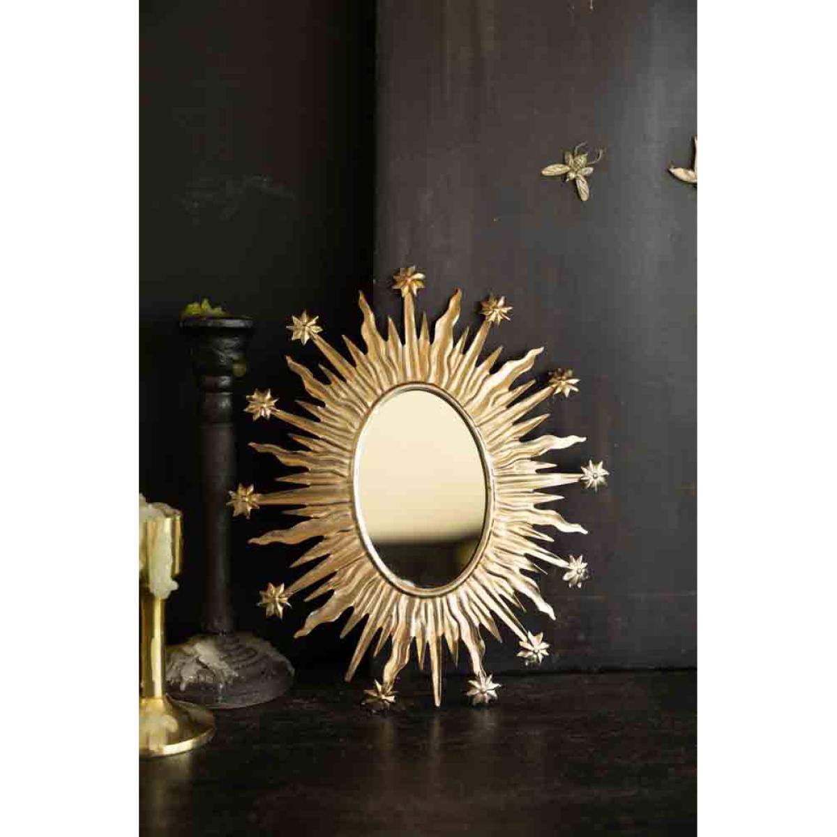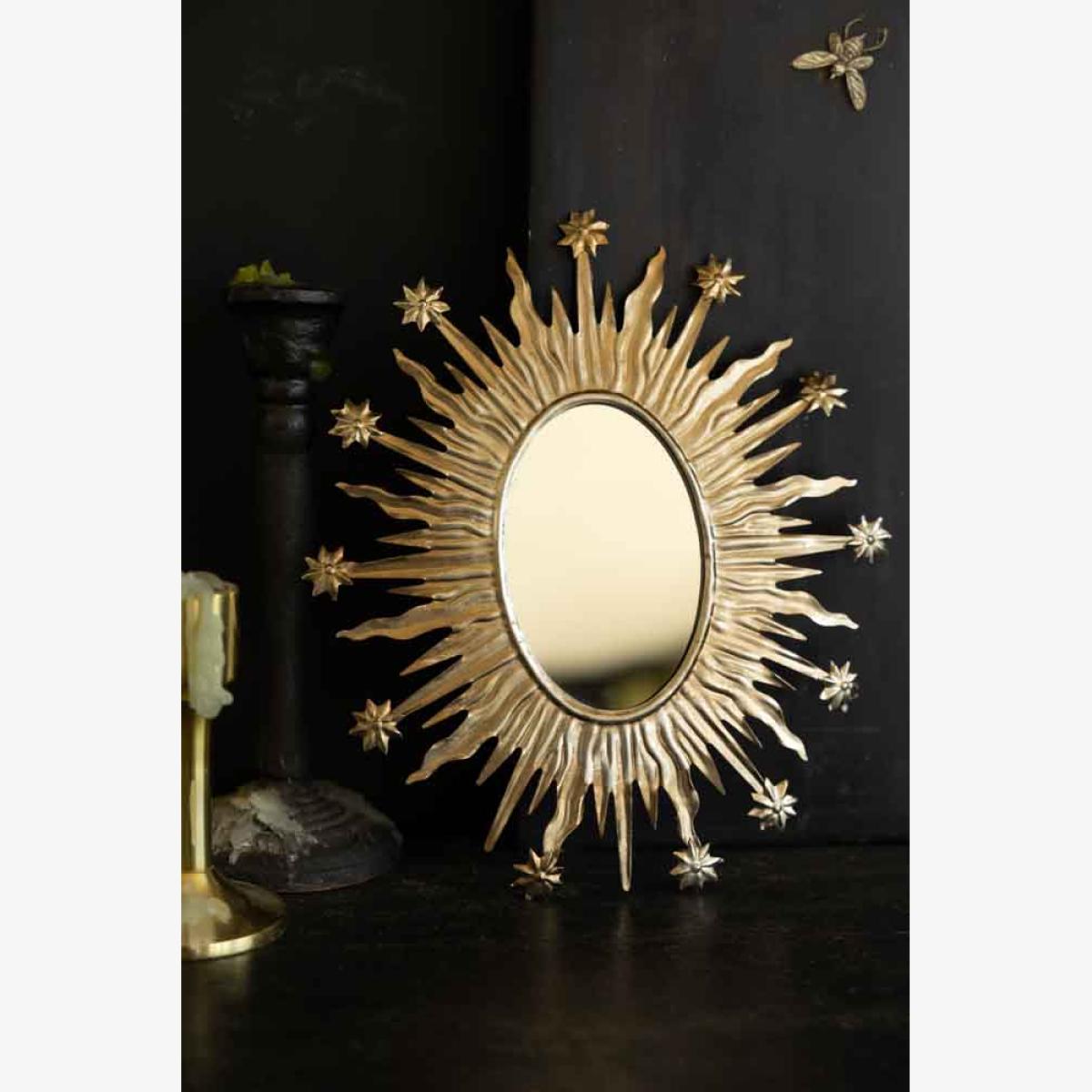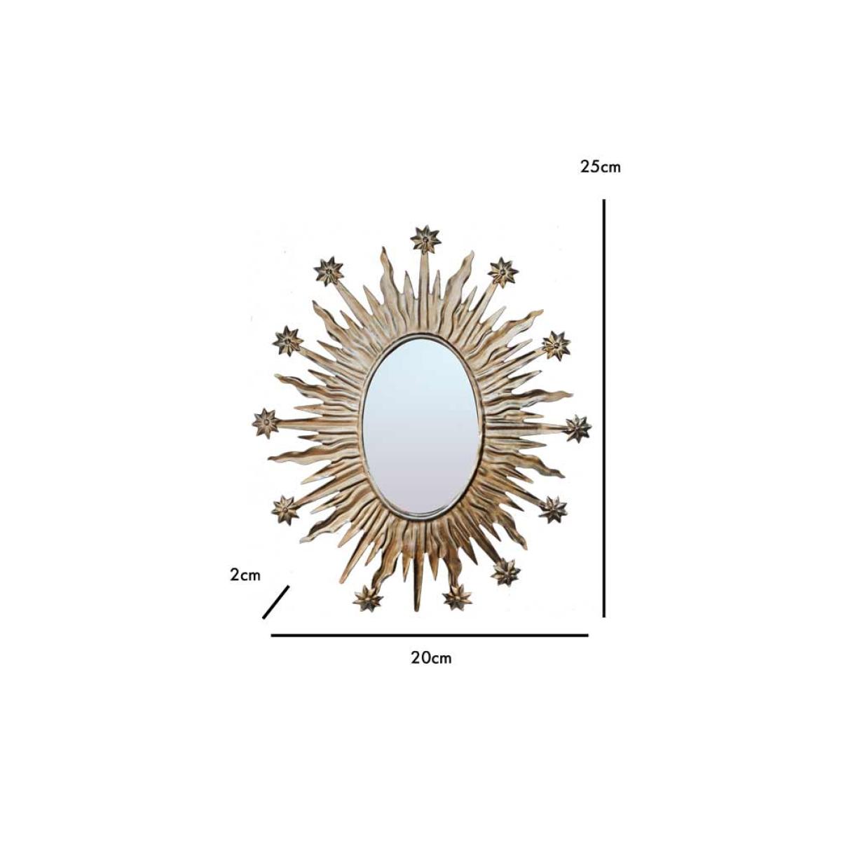 The Antique Silver Sunburst & Stars Mirror reveals the magical effect that a mirror can have in our homes. As the ultimate success story for where practicality and beautiful design combine, mirrors – large or small – reflect light back into the room and function as a piece of fabulous wall art. Proof that often it’s the smallest of objects that create the most impact, the sunburst and stars mirror reveals a beautiful decorative metal frame in an antique finish that brings together the best of gold and silver. Inspired by the captivating scenes of sunbeams and shooting, the wall mirror captures the magic of where nature meets emotion. A glamorous addition to your shelves or gallery wall, style the small oval mirror anywhere from your living room to the bedroom to elevate your everyday view.- Metal mirror with a sunbeam and star decorative frame - Measures: H24cm x W20.5cm- Includes a metal ring for hanging on the wall - Please take care when handling and unpacking, as the edges can be sharp