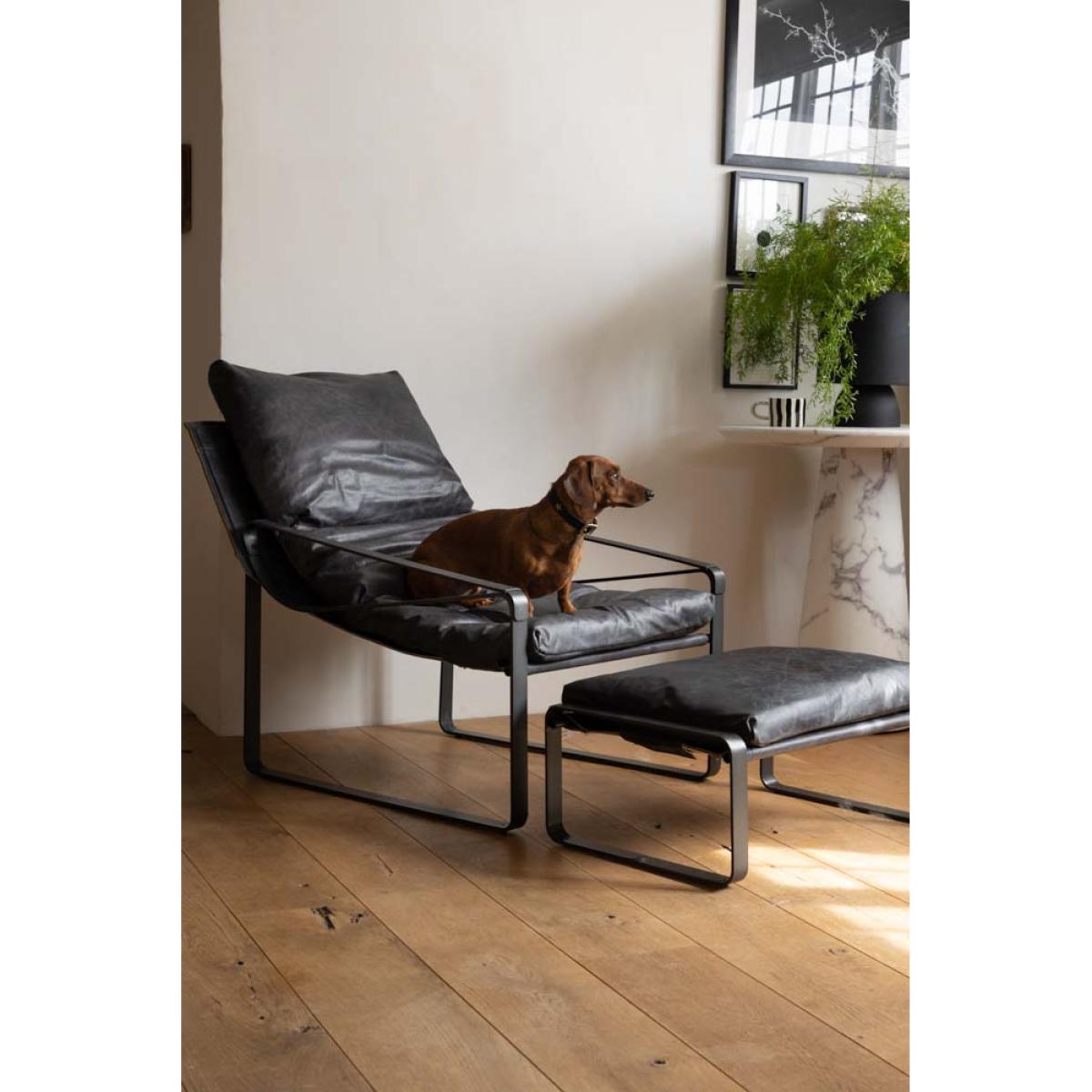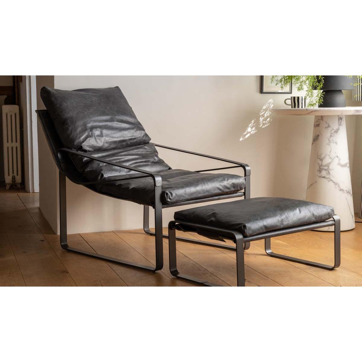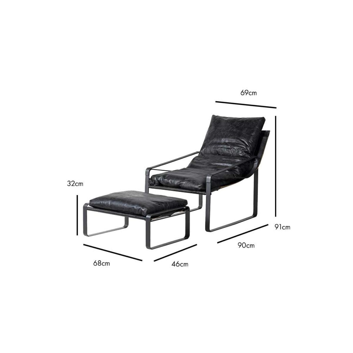 - Leather lounge chair & footstool with an iron metal frame- Leather lounger measures: H91cm x W69cm x D90cm- Leather footstool measures: H32cm x W68cm x D46cm- Care instructions: Please ensure that the room has good ventilation and do not place your Antique Slate Leather Lounger & Stool in direct sunlight or near to heat sources. Please avoid contact with sharp objects and avoid any liquids that might stain the surface, such as ink, nail polish etc. Please keep the leather surface dry, and in the event of a spillage, we recommend wiping the leather with a soft cloth to avoid damage. Please do not use alcohol wipes with this product, as it will cause the leather to fade. Leather should be cleaned/treated regularly using a professional leather cleaning cream/agent.