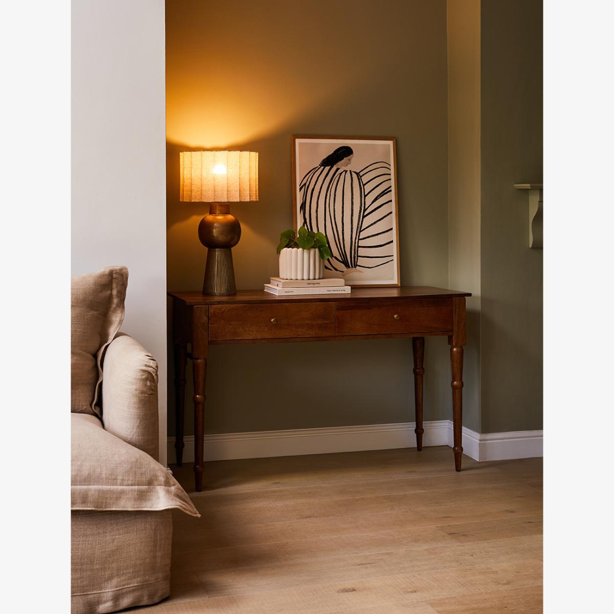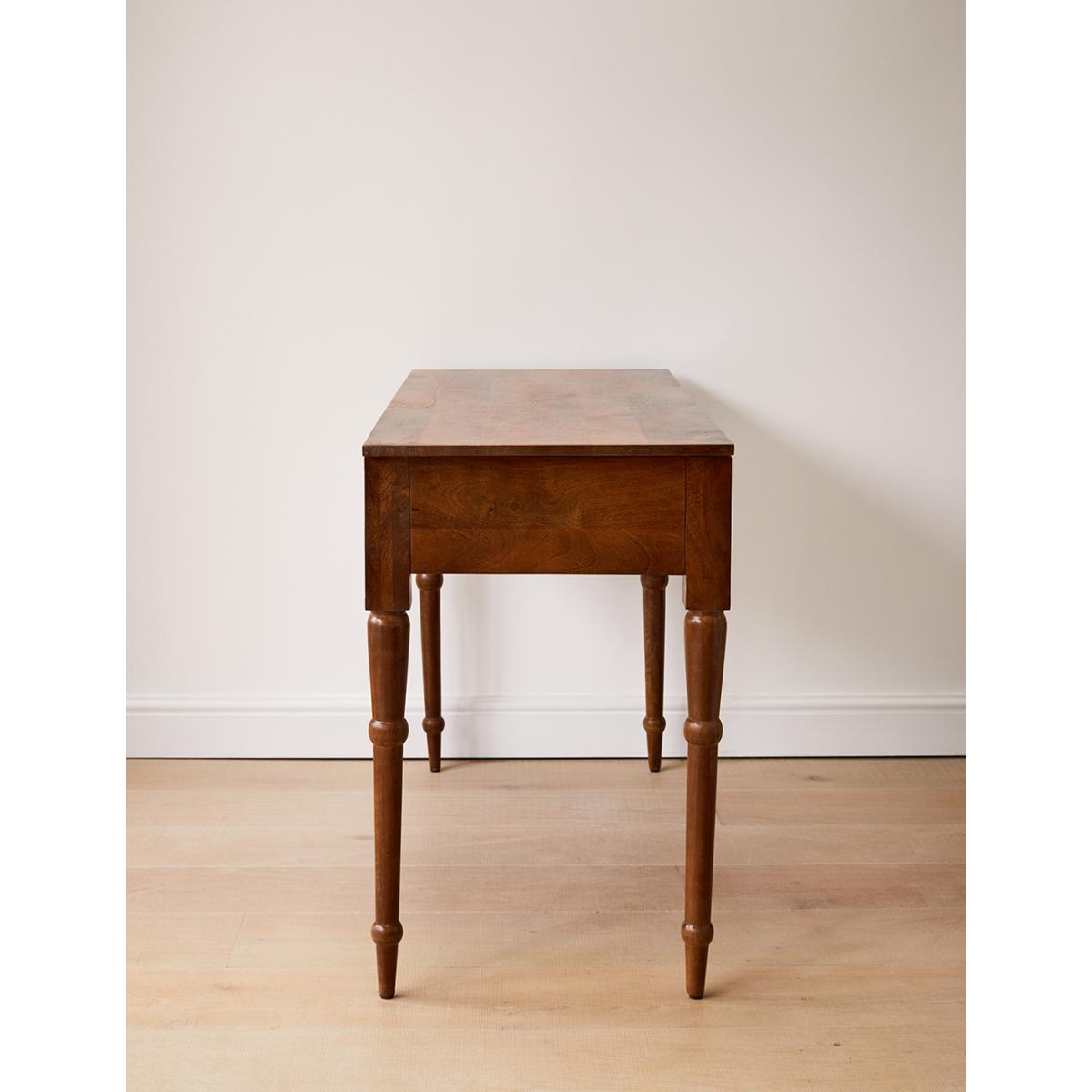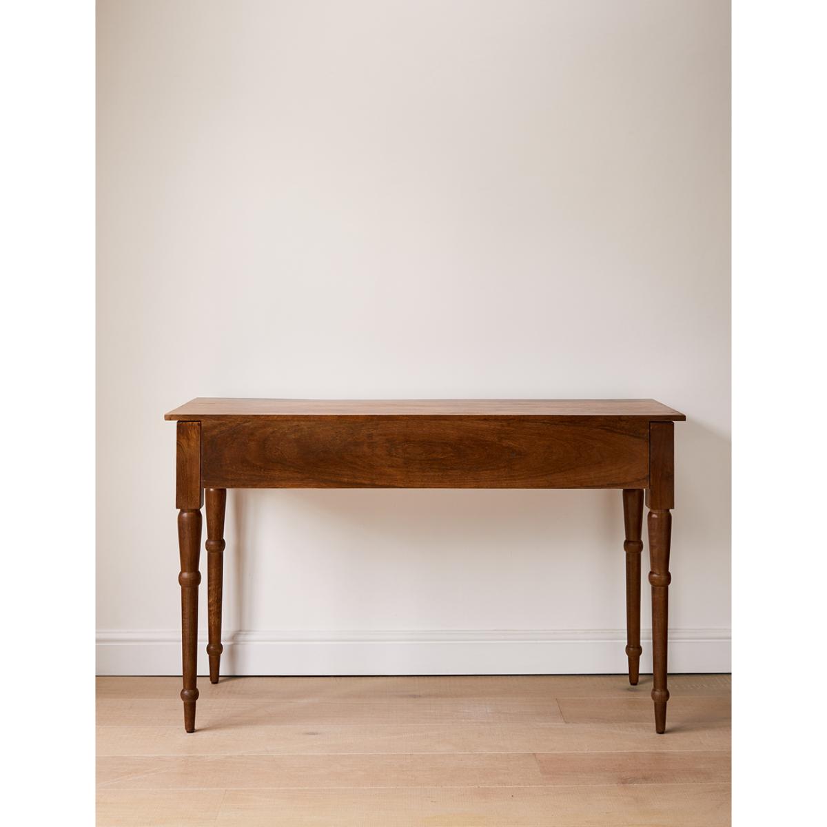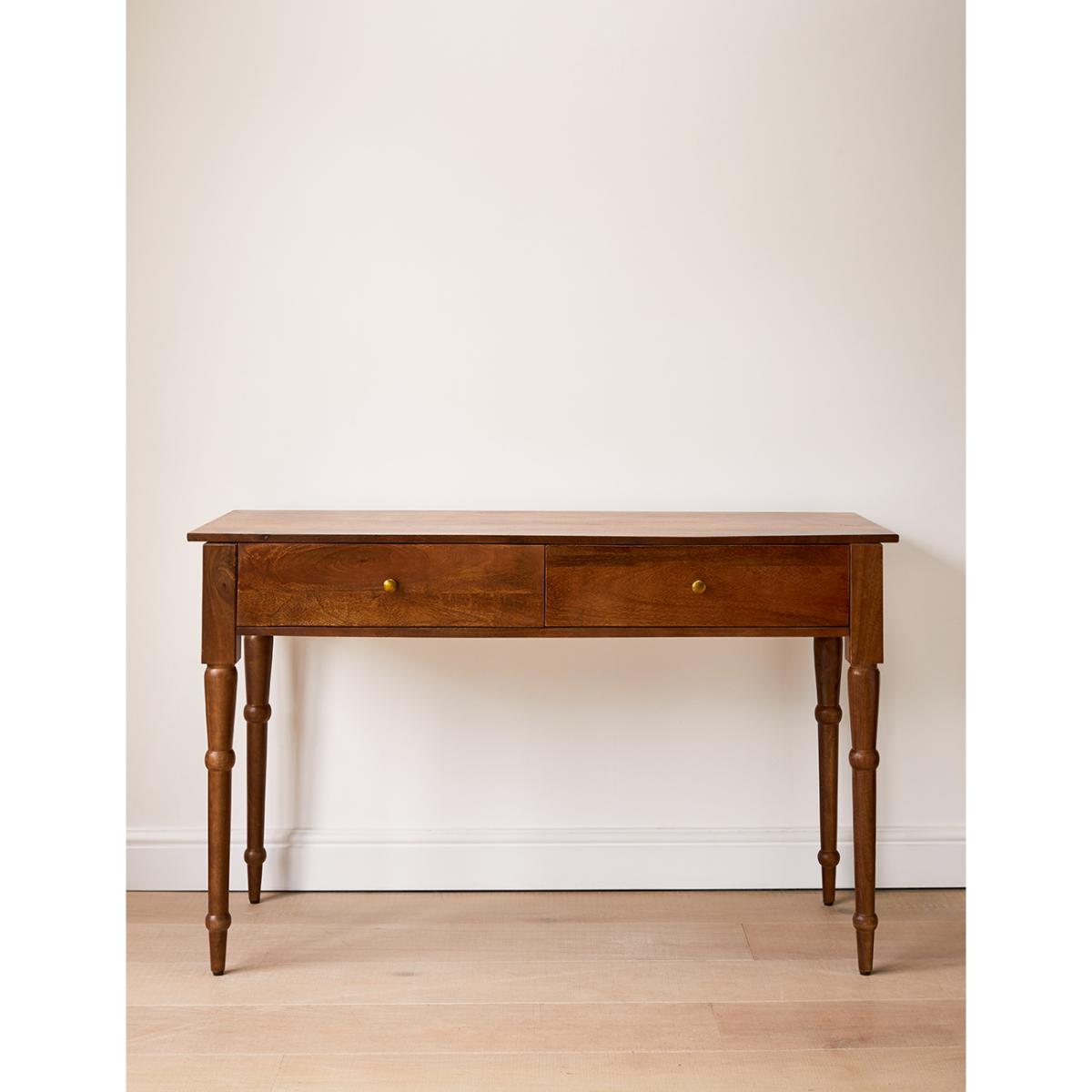 Embrace classic interior design with our Antique Style Mango Wood Console Table. Crafted from mango wood and adorned with elegant brass handles and spindle legs, this piece seamlessly merges rustic aesthetics with a modern twist. The large tabletop offers ample space for showcasing your favourite decor items, while the two spacious drawers provide plenty of storage space. This console table is completely versatile and can double up as a desk or dressing table whilst looking great in any room in the home.
