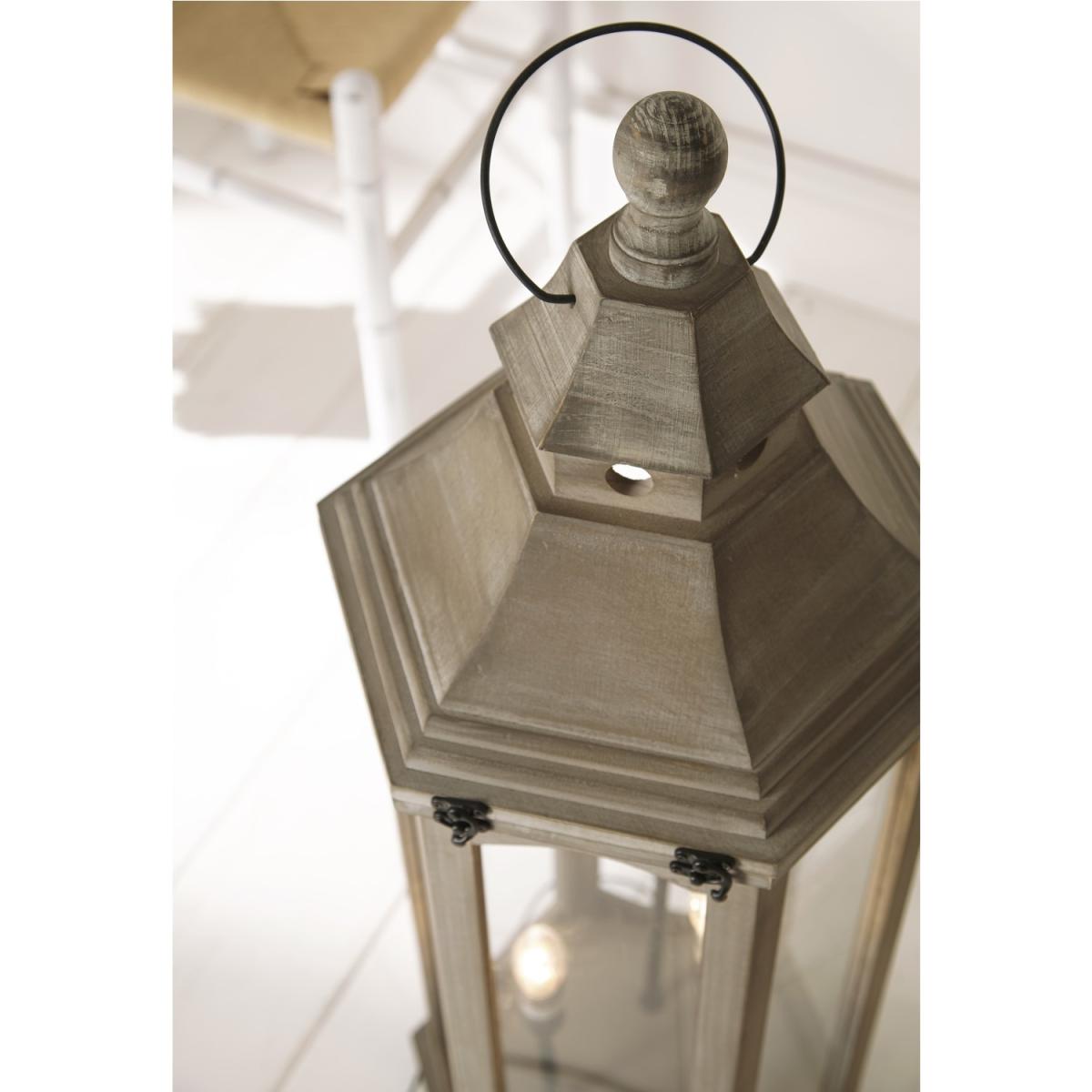 Bring outdoor styling into your home with this large striking wooden lantern floor lamp. Three bulbs are housed at varying heights within a tall glass and wooden frame, plus a flip-up top with two clasps makes it easy to switch them. The black pewter detailing with the grey wash finish gives it a modern antique touch that would look stunning in any interior setting. Also available in a table lamp FOL103648.