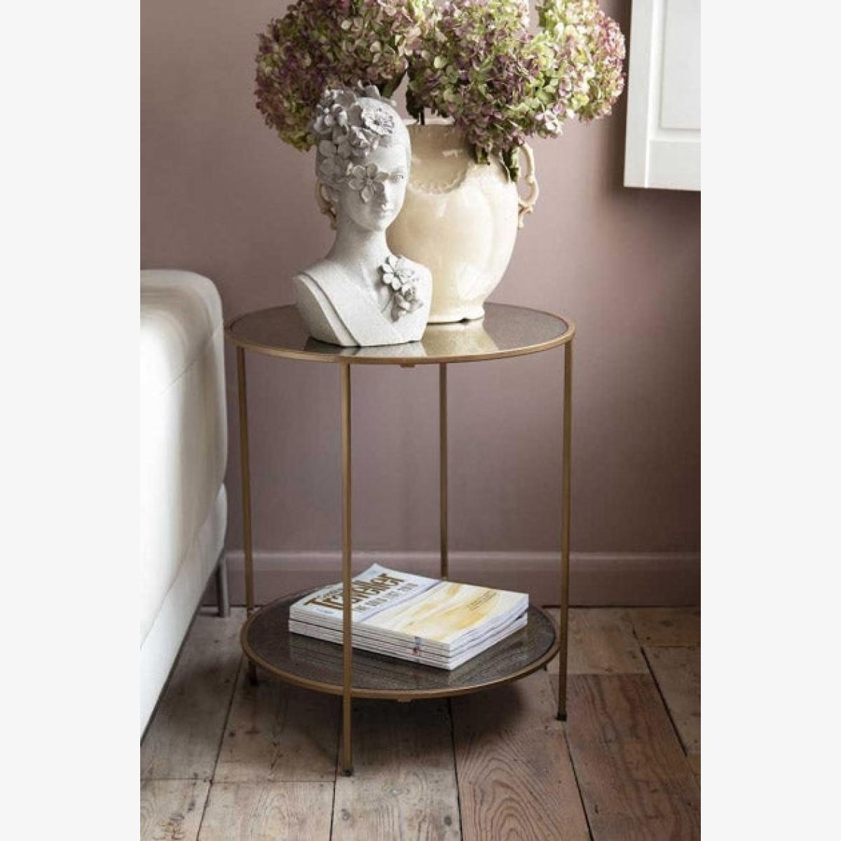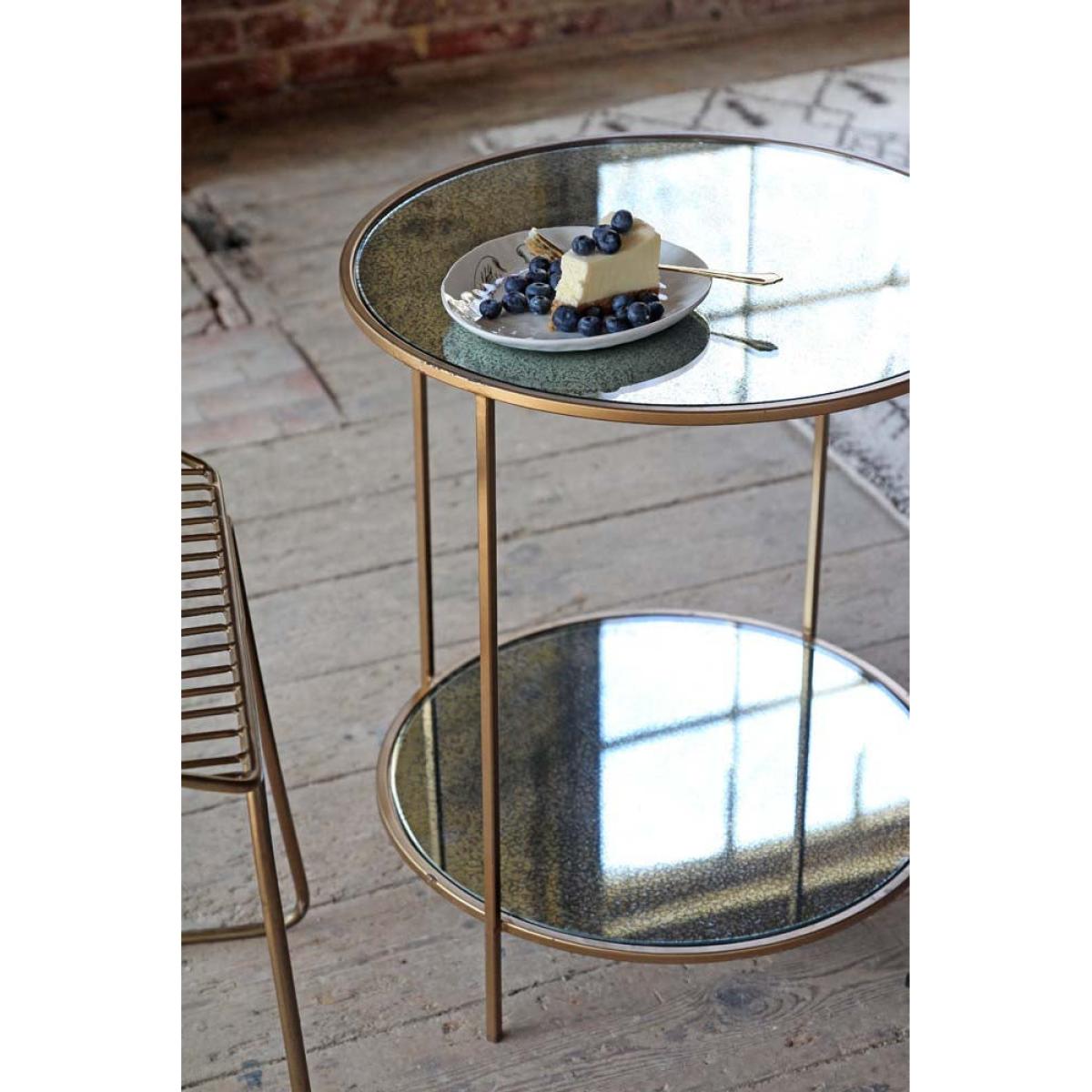 About The Antiqued Mirror Side TableA timeless design with a touch of elegance, the Antiqued Mirror Side Table is the perfect piece to store and display your household treasures in style. This Two Tier Side Table has a brass finish metal frame with a gorgeous rustic effect on the glass, creating a wonderful retro look in any corner of your home that can be paired with any interior. Why We Think You’ll Love The Round Side TableThis Gold Side Table is tinted gold and black with glorious speckles on the glass, adding an interesting feature to any room that you choose to place it in. A Glass Side Table with a vintage feel, this piece combines practical use with delightful design to create a statement retro look amongst your existing scheme, providing your space with a simply show stopping piece that is oozing with charm. Where To Style The Side Table With StorageStyle this Side Coffee Table in your living area with a pile of books on the lower level and a collection or ornamental pieces on its surface, pair with the ravishing Rockett St George Armchair Bespoke Oyster Shell Armchair to elevate the luxurious art deco look that this table encapsulates to beautifully. Alternatively, why not use this Retro Side Table in any corner of your bedroom to create a sophisticated style spot that adds a delightful character to the space and display the Gold Dome Table Lamp for fabulous mood lighting, bringing a marvellous detail to the room.