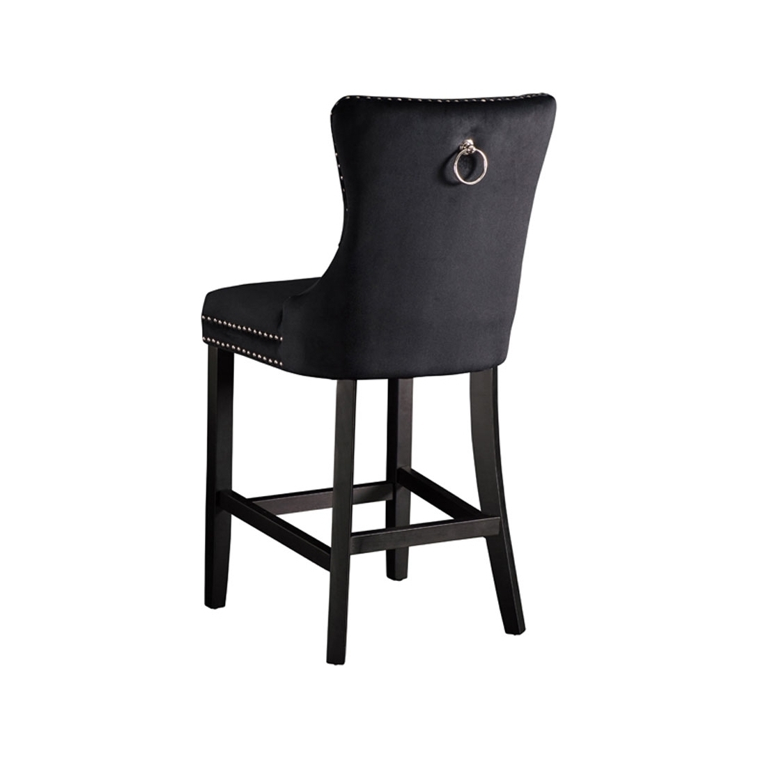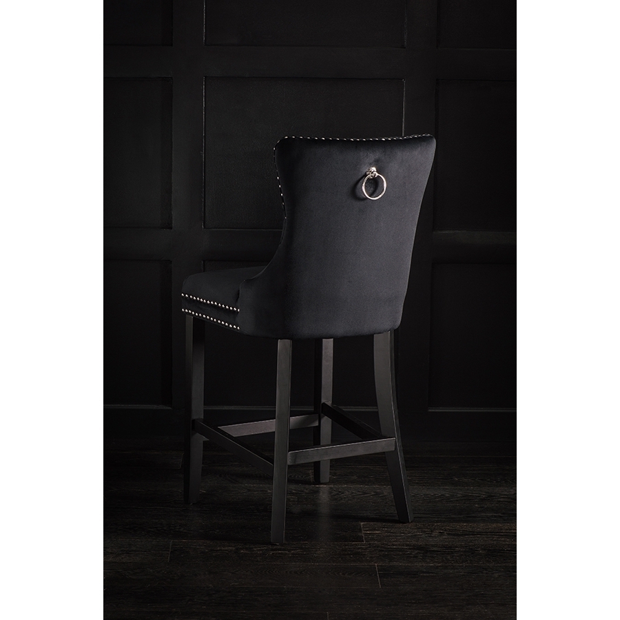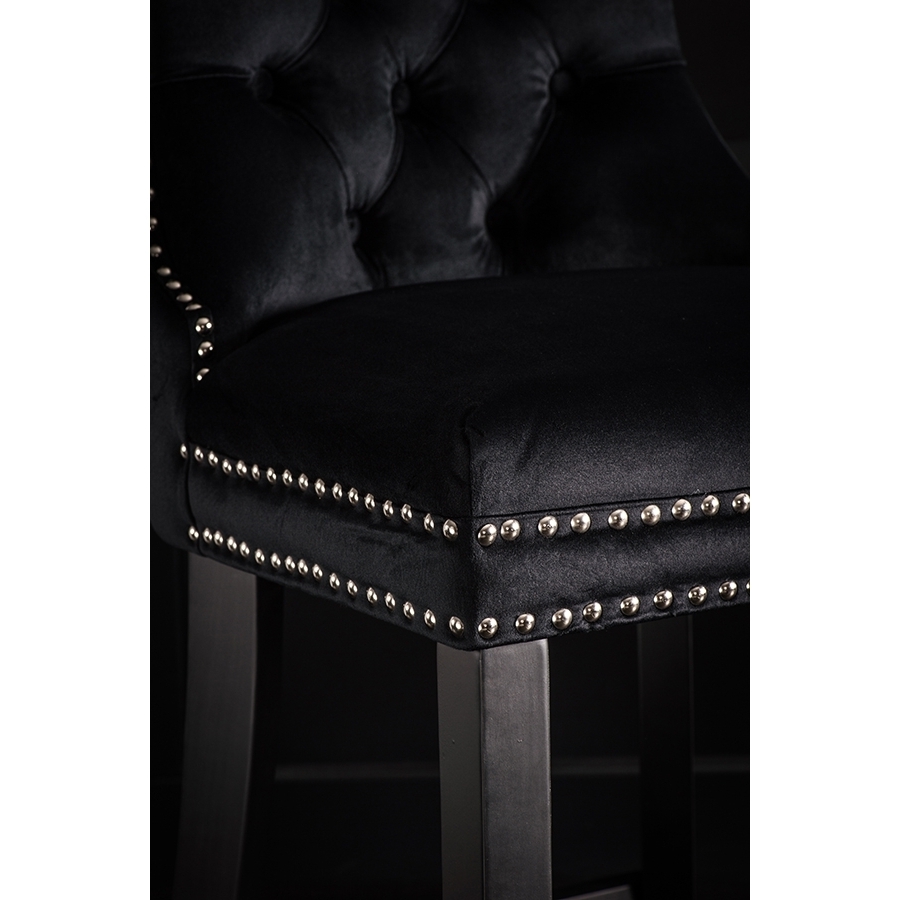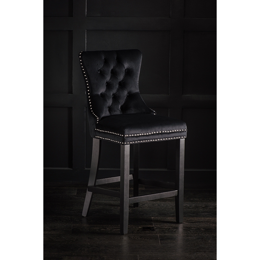 A distinctive, elegant bar stool Deep buttoned design Velvet upholstery fabric Ring handle to back Chrome upholstery tacks Black stained solid ash legs Simple assembly required