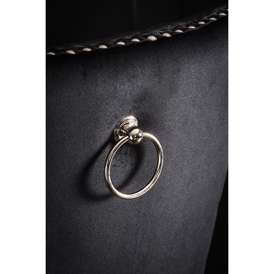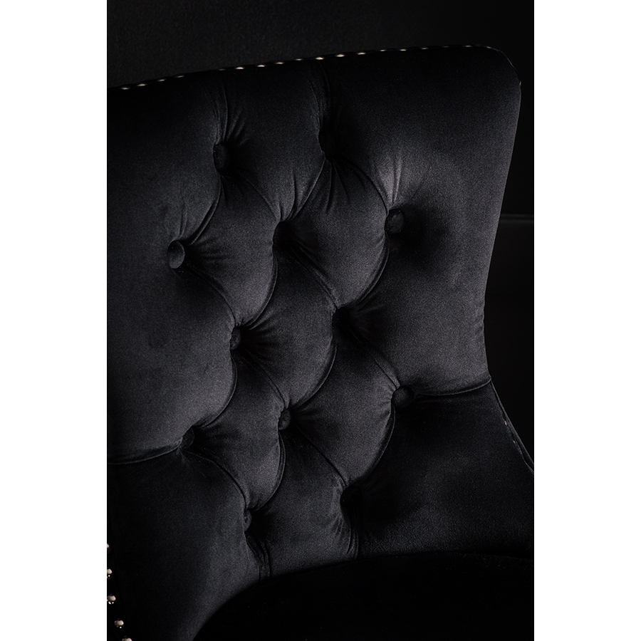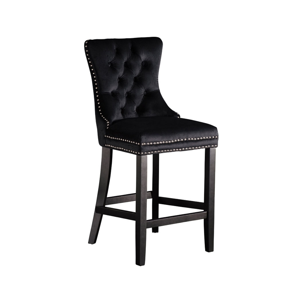 A distinctive, elegant bar stool Deep buttoned design Velvet upholstery fabric Ring handle to back Chrome upholstery tacks Black stained solid ash legs Simple assembly required