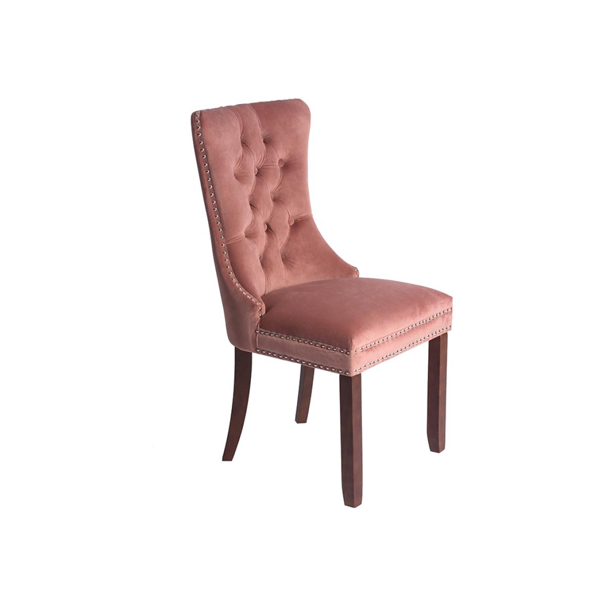 A distinctive, elegant dining chair. Deep buttoned design. Velvet upholstery fabric. Ring handle to back. Chrome upholstery tacks. Walnut stained solid ash legs. Simple assembly required.