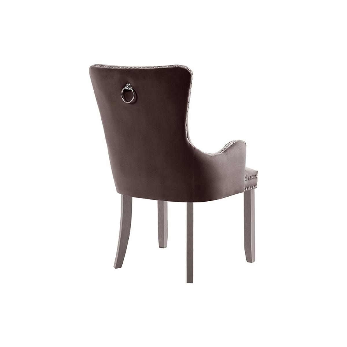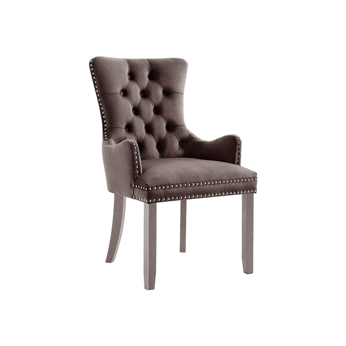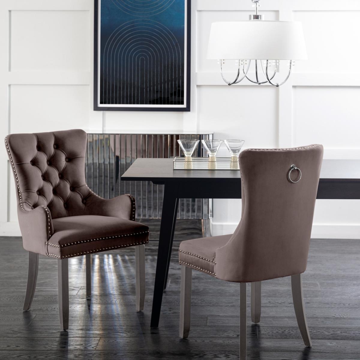 I love this armchair because it combines timeless elegance with a touch of luxury, thanks to its plush mink upholstery and classic button-tufted design. It works beautifully in traditional or transitional dining rooms where a sophisticated, vintage-inspired detail is desired. For practical styling tips, consider pairing it with a marble or dark wood table to highlight its refined look, and add contrasting cushions or throws in muted or jewel tones for added comfort and visual interest. Its versatile colour and shape make it adaptable for both formal dining areas and more cosy, intimate kitchens, making it a real statement piece that still feels welcoming.