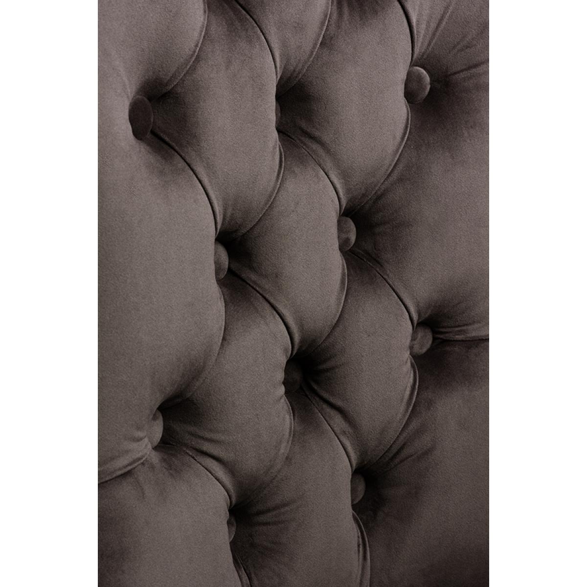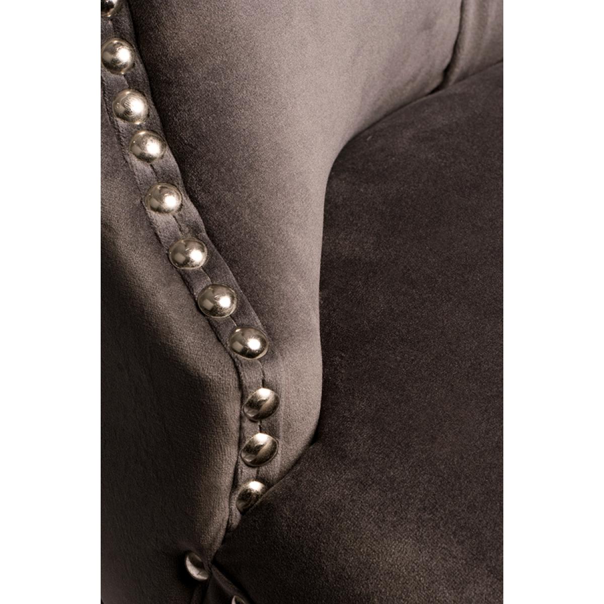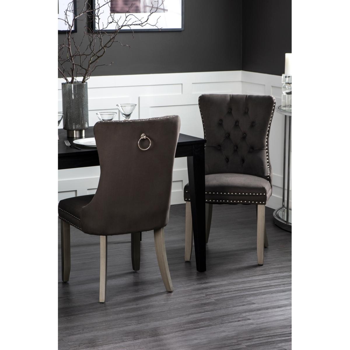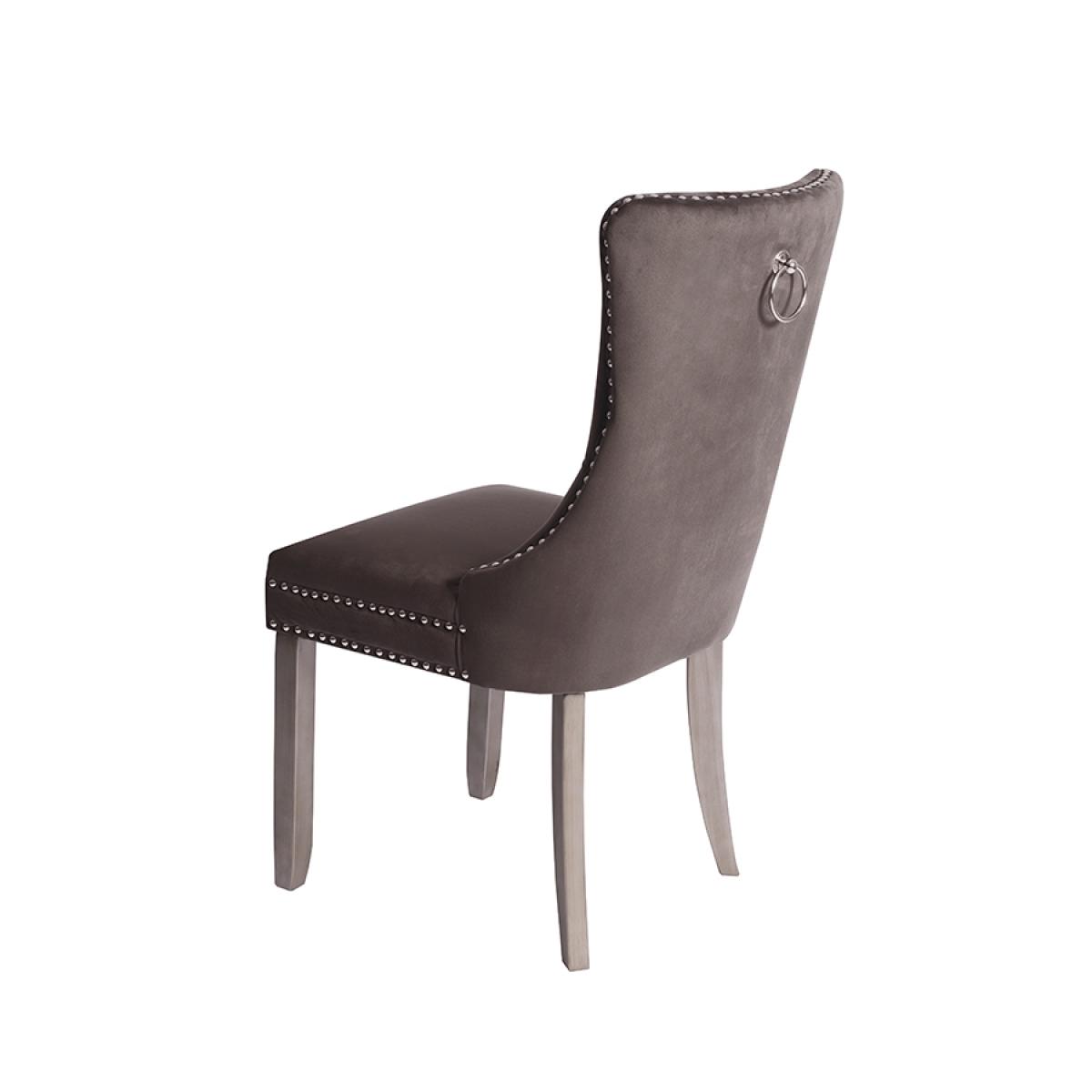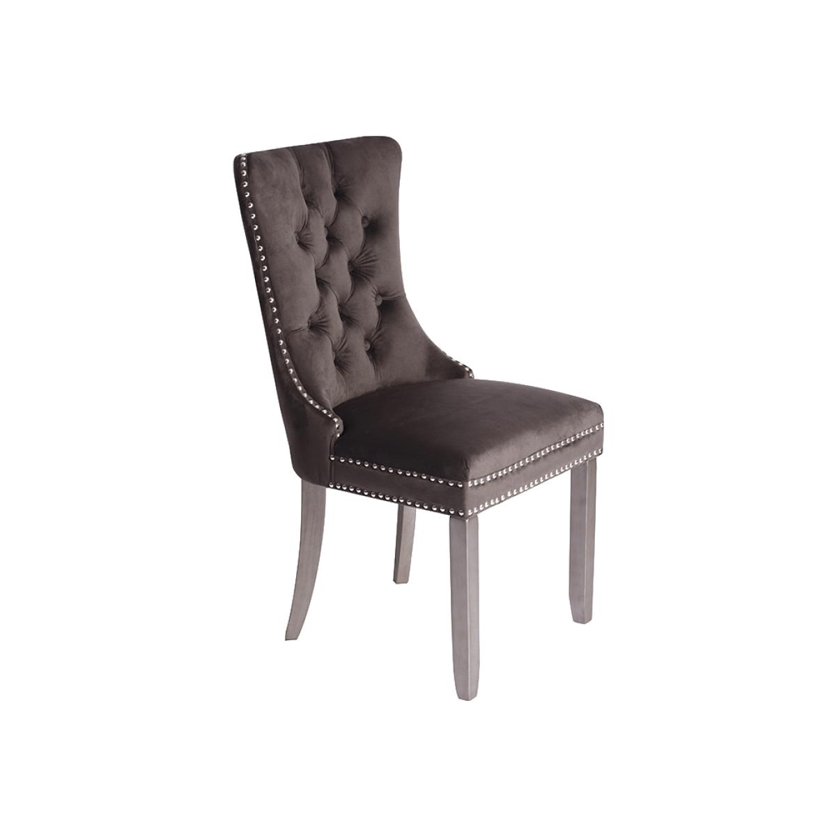 A distinctive, elegant dining chair. Deep buttoned design. Velvet upholstery fabric. Ring handle to back. Chrome upholstery tacks. Pewter painted solid ash legs. Matches our Antoinette Dining Table. Simple assembly required.