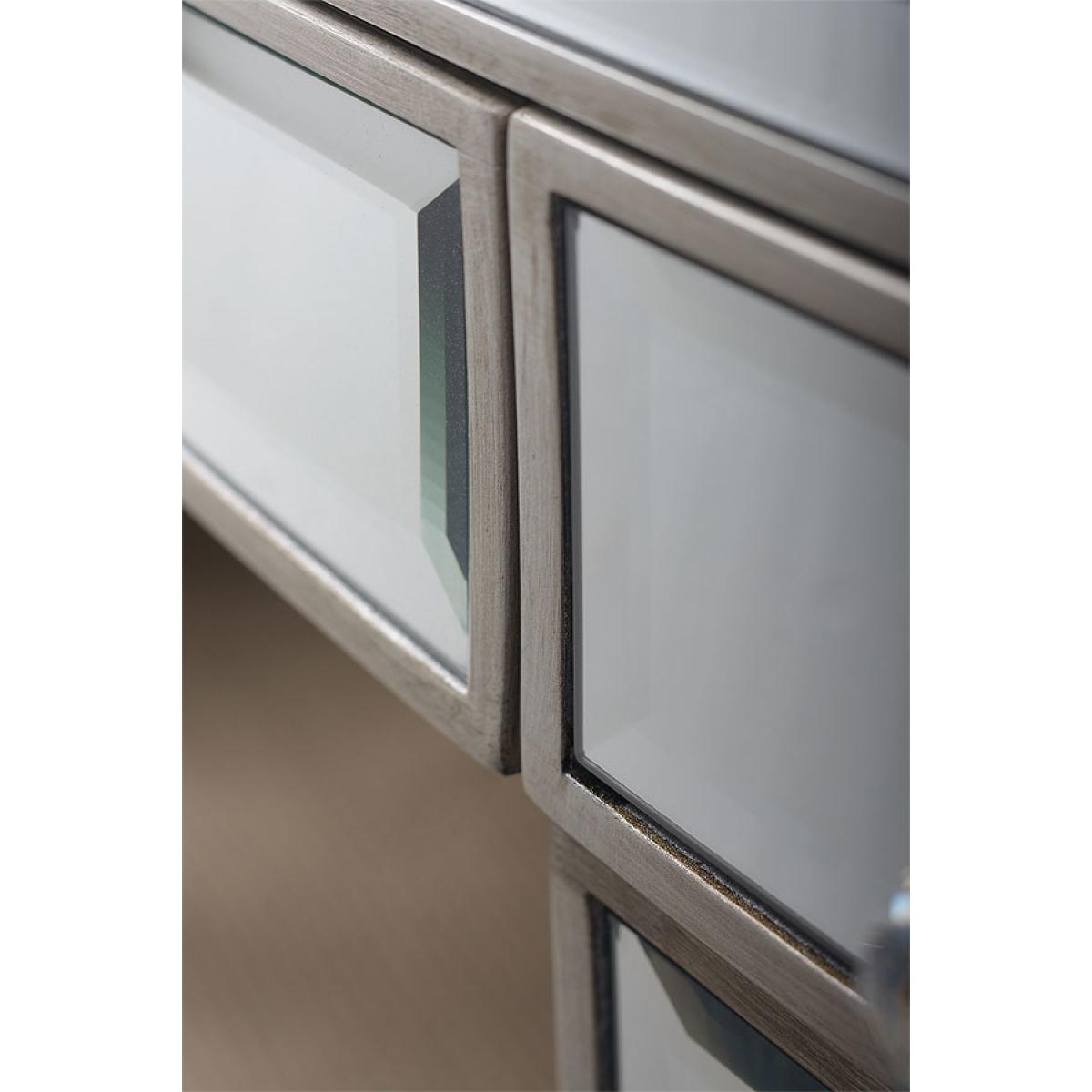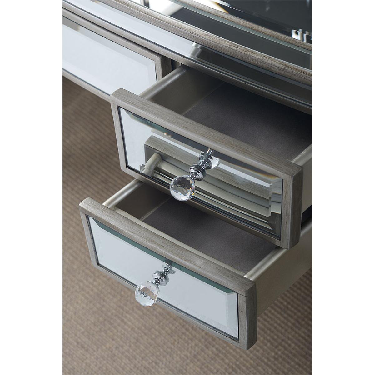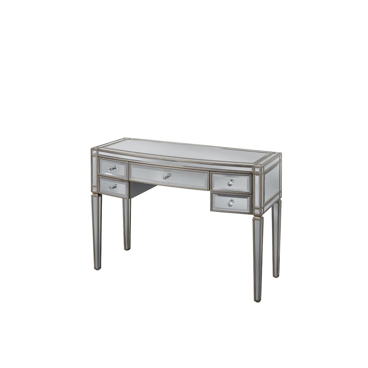 A stunning mirrored dressing table with a distinctive and unusual curved front. Featuring bevelled toughened mirrored panels inlaid into an antique pewter effect wooden frame. Five velvet-lined drawers complete with soft-close mechanism and crystal handles, providing ample storage for your jewellery, make up and grooming products. Part of our comprehensive Antoinette bedroom furniture collection. Assembly required. Console unit only, stool and wall mirror sold separately.