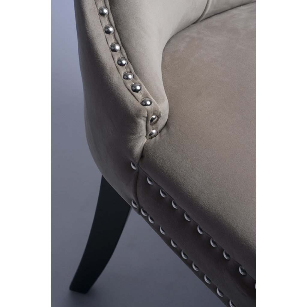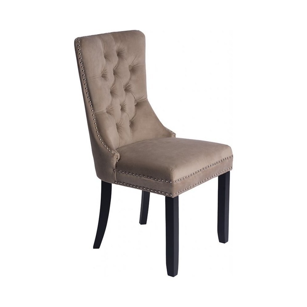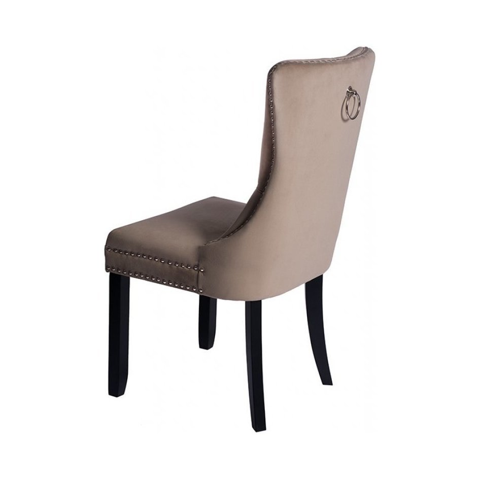 A distinctive, elegant dining chair Deep buttoned design Velvet upholstery fabric Ring handle to back Chrome upholstery tacks Black stained solid ash legs Simple assembly required