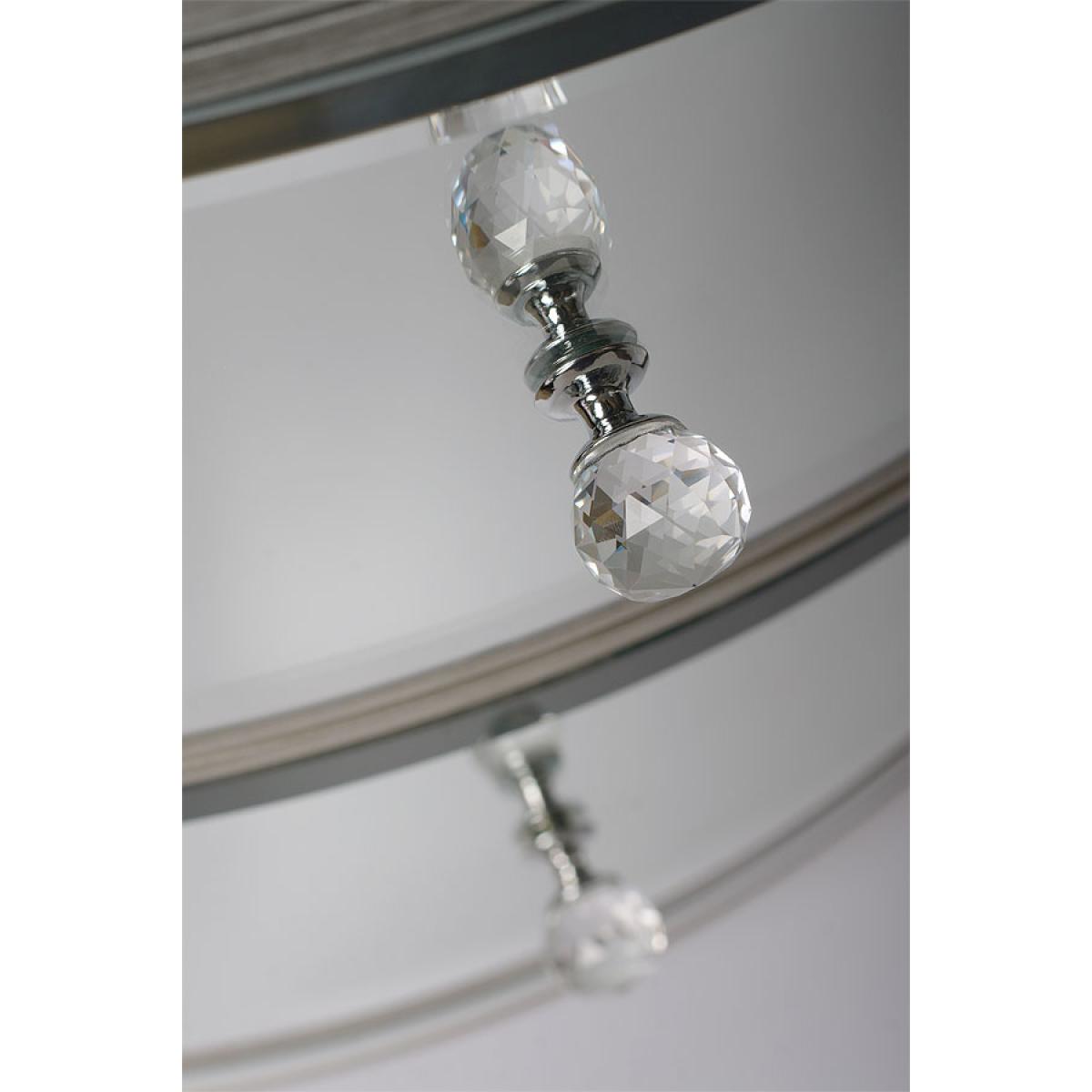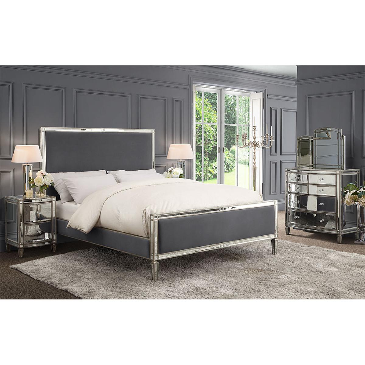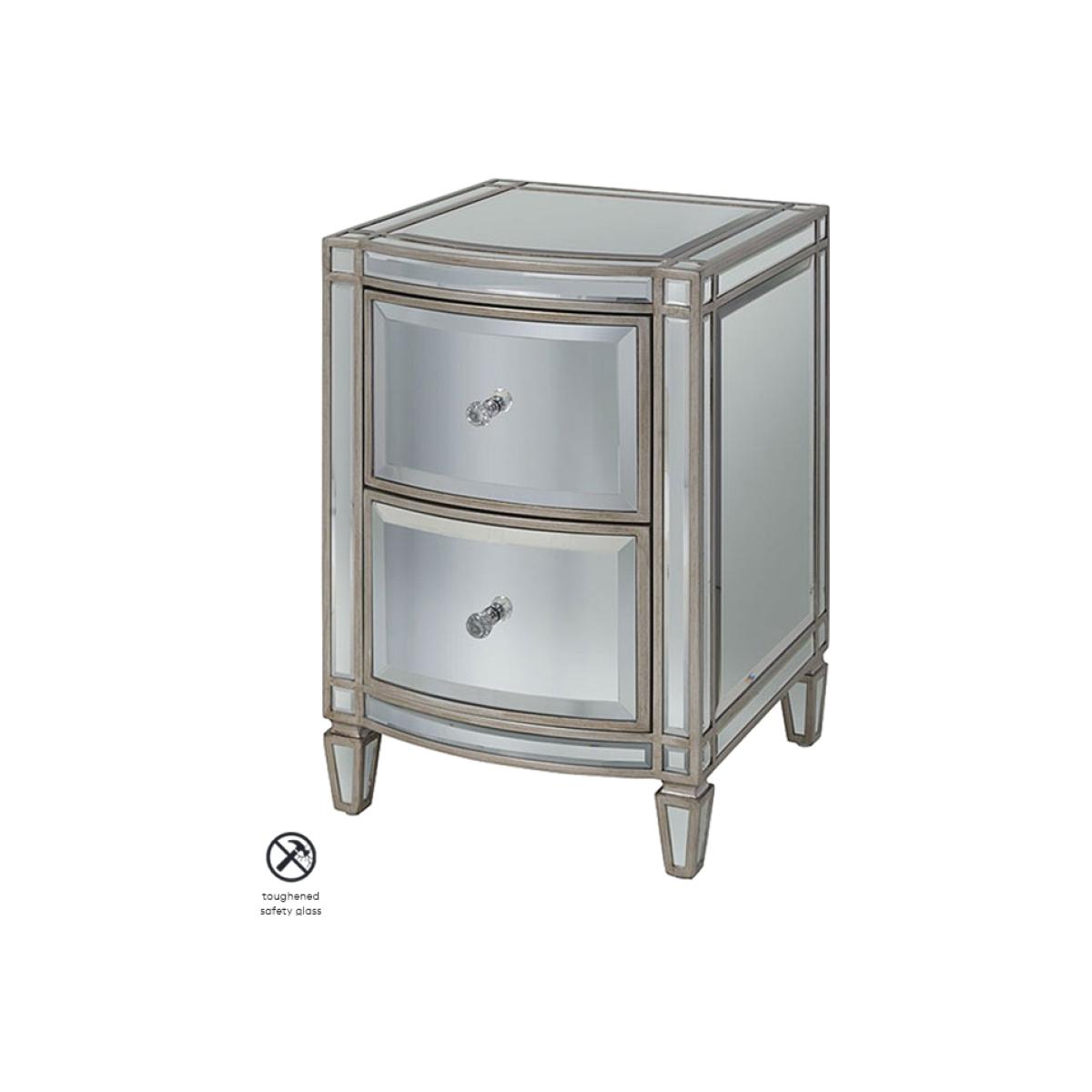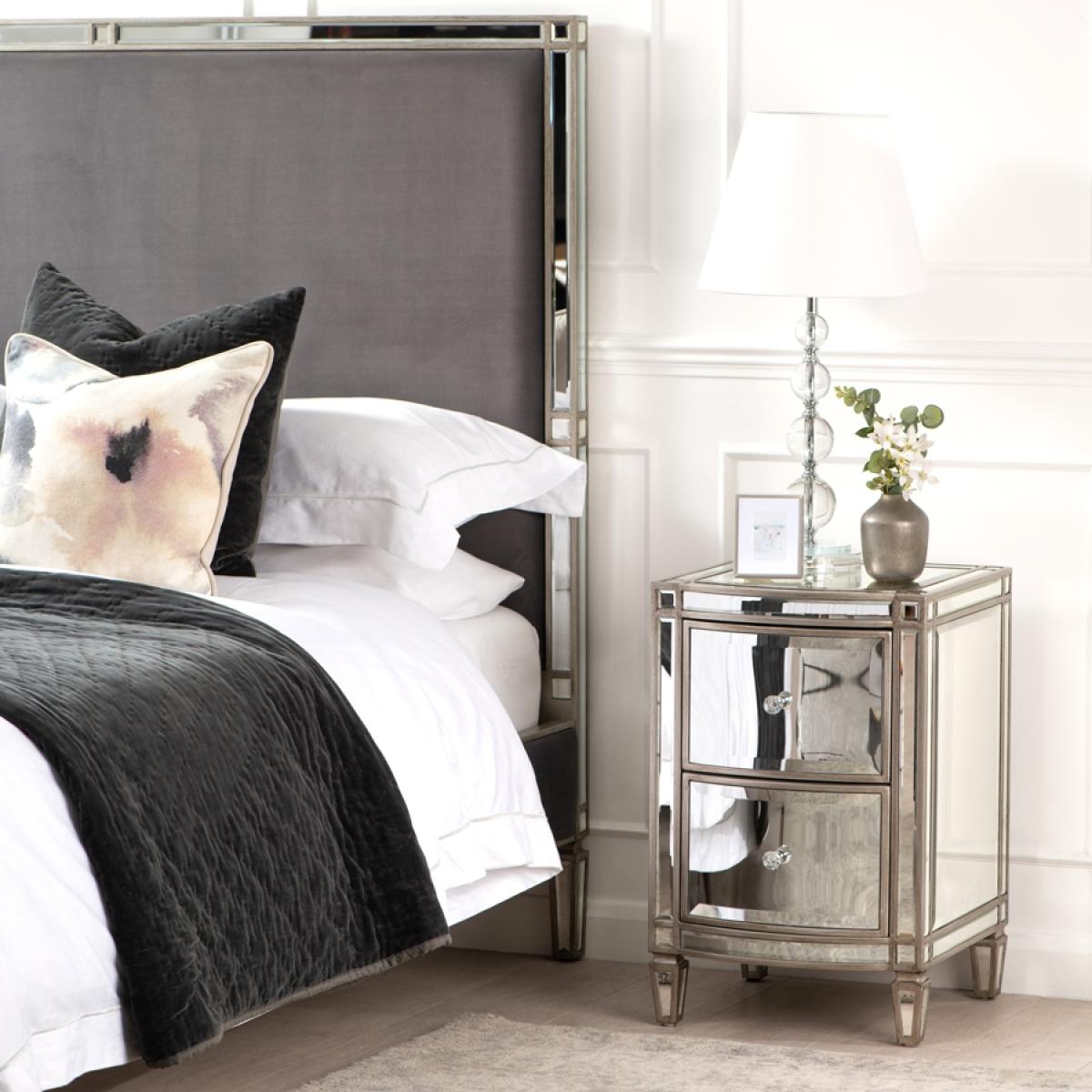 Antoinette is a stunning mirrored bedside table with a distinctive and unusual curved front. Constructed with especially treated toughened mirror - nearly. Featuring handcrafted bevelled mirrored panels inlaid into an antique pewter effect wooden frame. The large velvet lined drawers are complete with soft close mechanism and crystal handles, providing ample storage for your personal belongings. Part of our comprehensive Antoinette bedroom furniture collection. Supplied fully assembled.