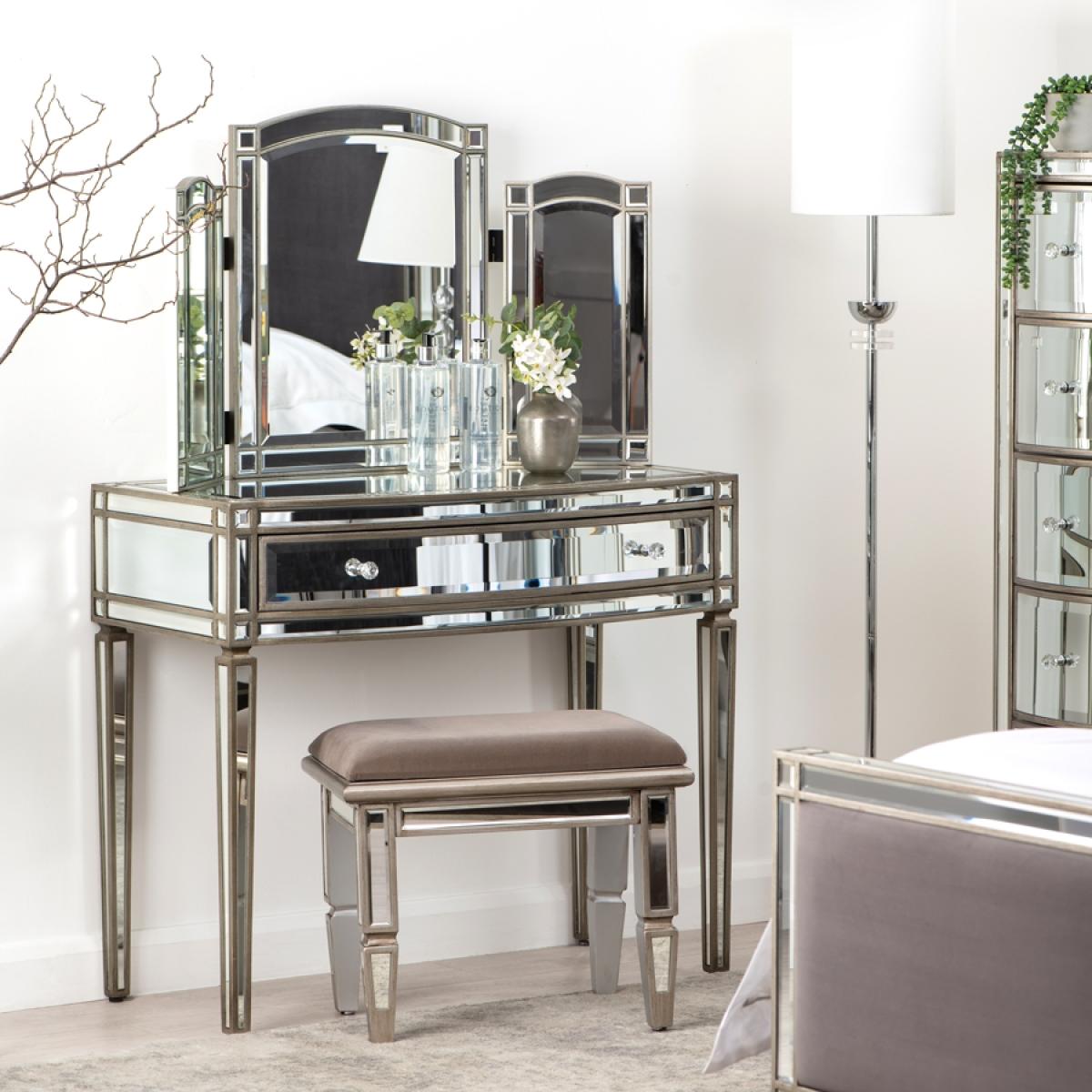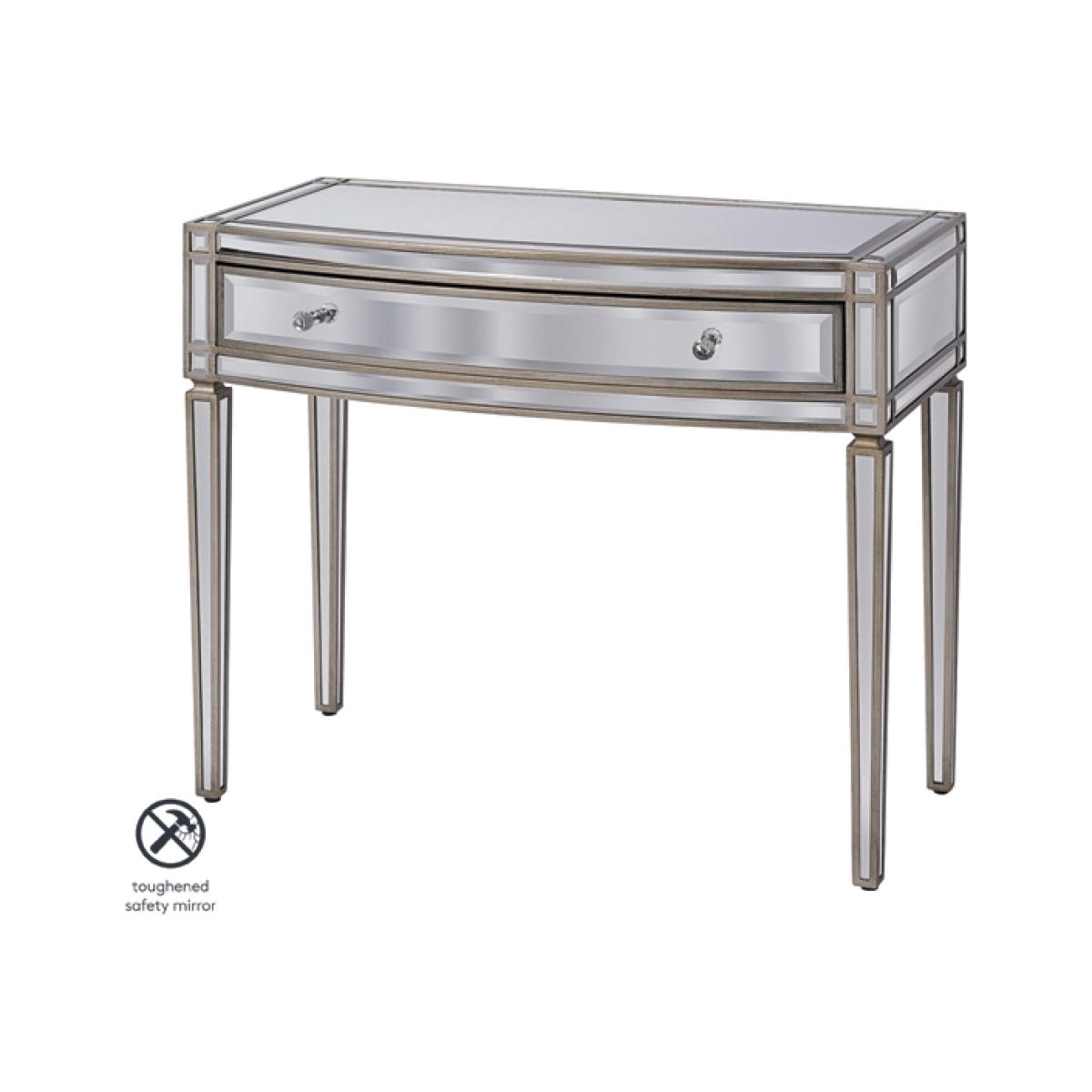 Antoinette is a stunning mirrored console table with a distinctive and unusual curved front. Featuring handcrafted bevelled mirrored panels inlaid into an antique pewter effect wooden frame. Velvet lined drawer with soft close mechanism and crystal handles. Part of our comprehensive Antoinette furniture collection. Assembly required, simply attach the legs. Console unit only, stool and wall mirror sold separately.