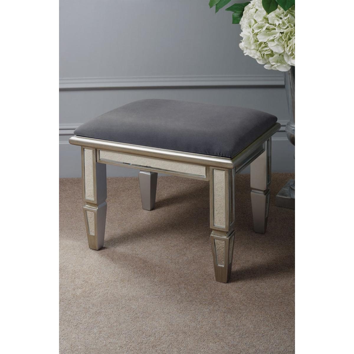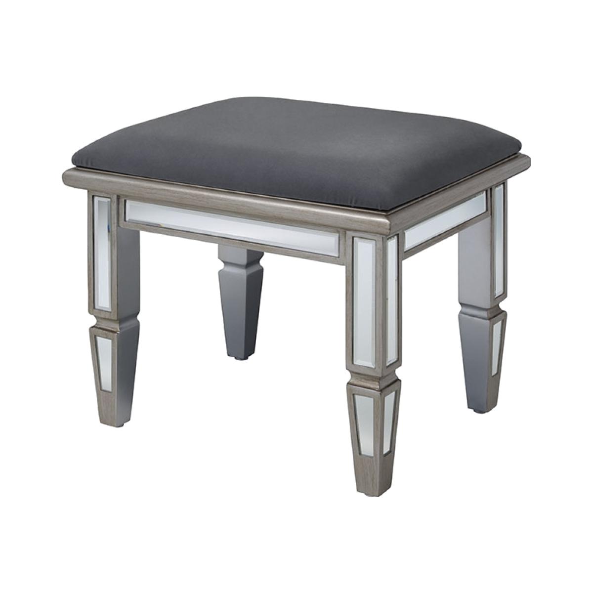 Antionette is a stunning dressing stool designed to be used with our Antionette Dressing Table and Mirror. Featuring handcrafted bevelled mirrored panels inlaid into an antique pewter effect wooden frame. Upholstered in Storm Grey velvet fabric, which matches our Storm Grey Antoinette Mirrored Bed. Part of our comprehensive Antionette bedroom furniture collection. Supplied fully assembled.