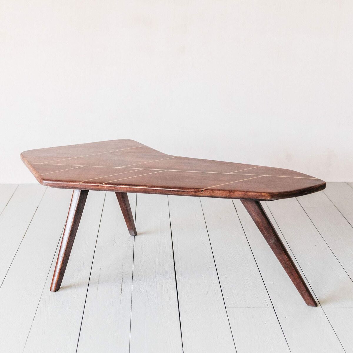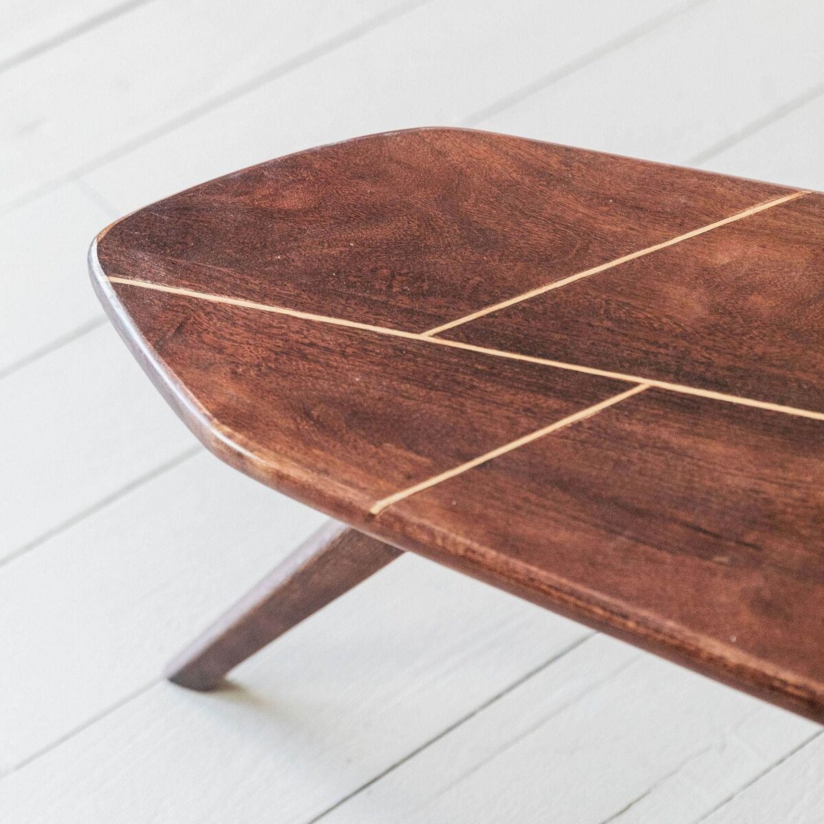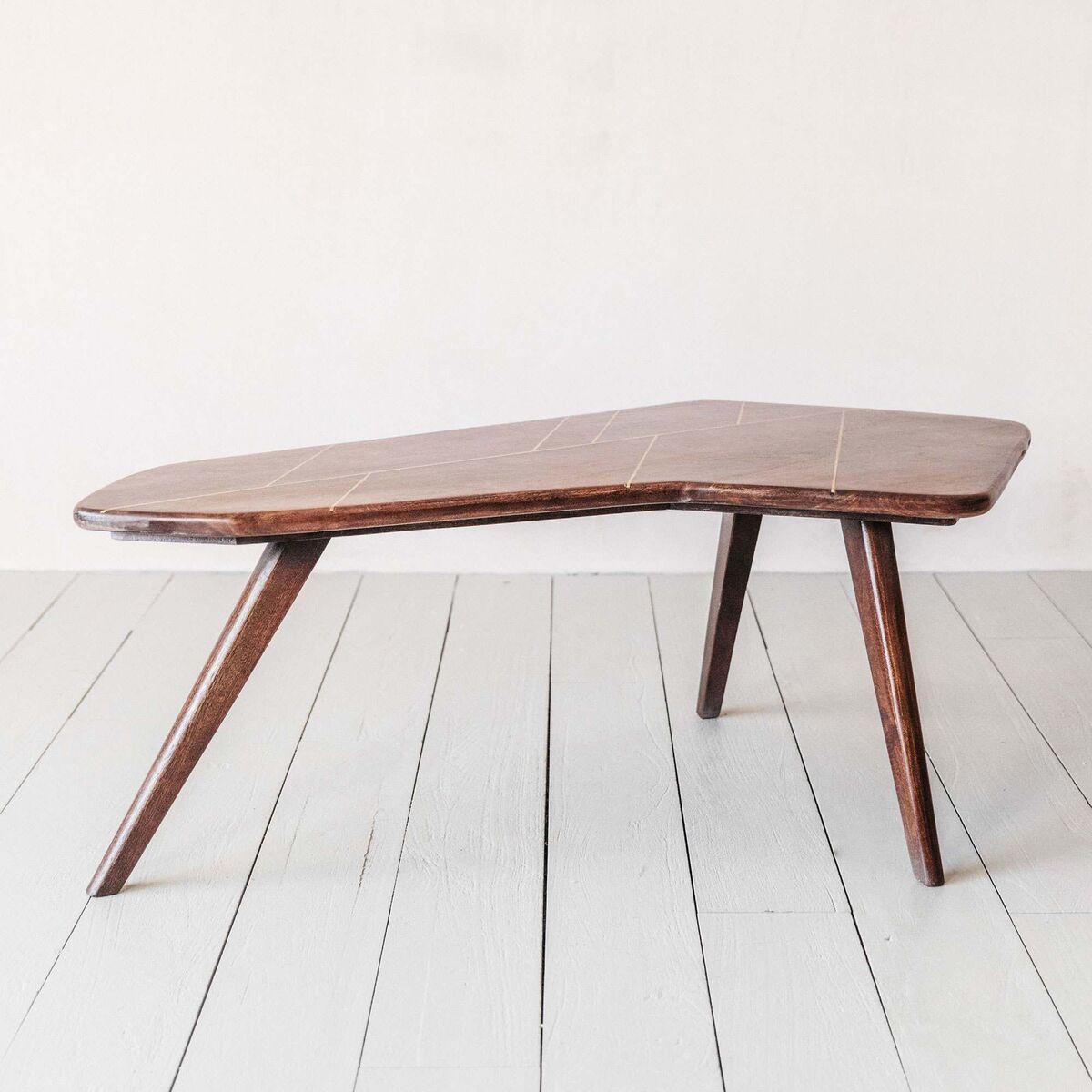 A mid-century inspired coffee table handcrafted from solid mango wood with a smooth mahogany stain finish. Featuring a striking asymmetric tabletop with a linear brass inlay design supported by three angled legs, our Anton coffee table will make the perfect centrepiece to your living space.