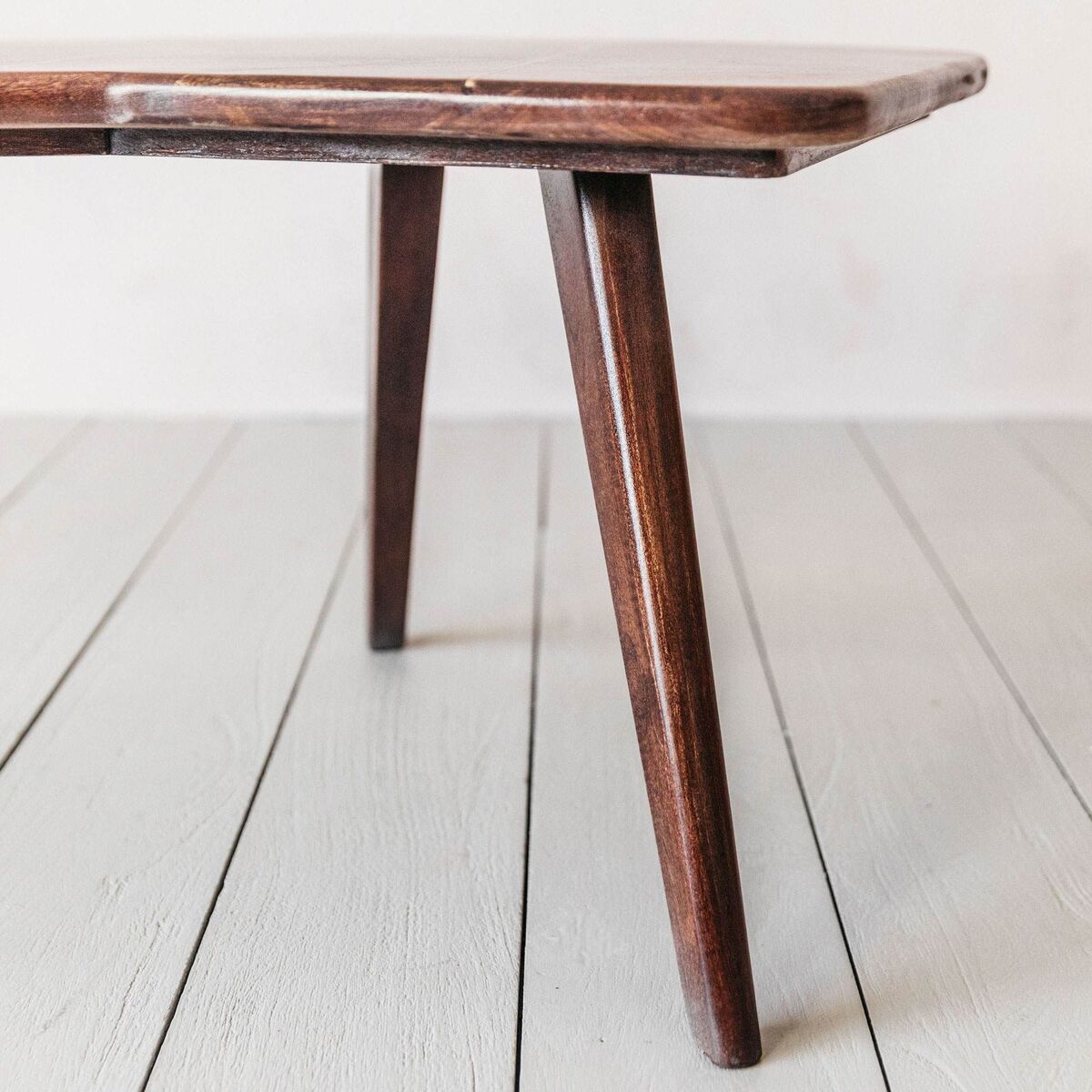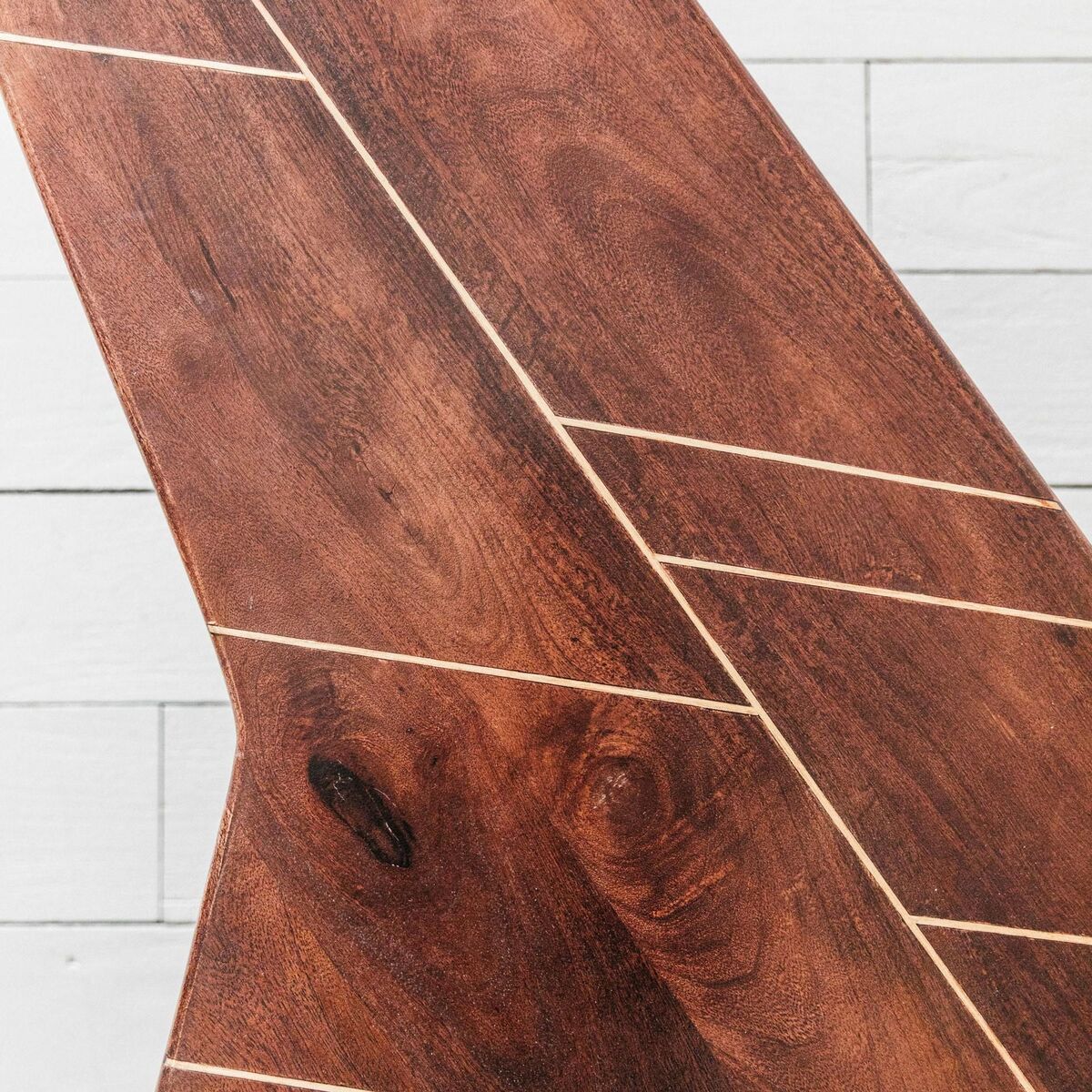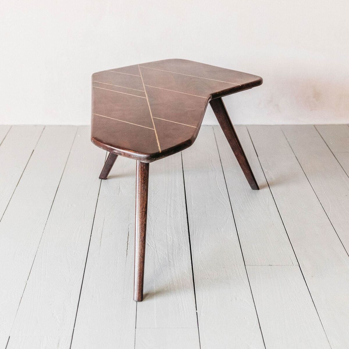 A mid-century inspired coffee table handcrafted from solid mango wood with a smooth mahogany stain finish. Featuring a striking asymmetric tabletop with a linear brass inlay design supported by three angled legs, our Anton coffee table will make the perfect centrepiece to your living space.