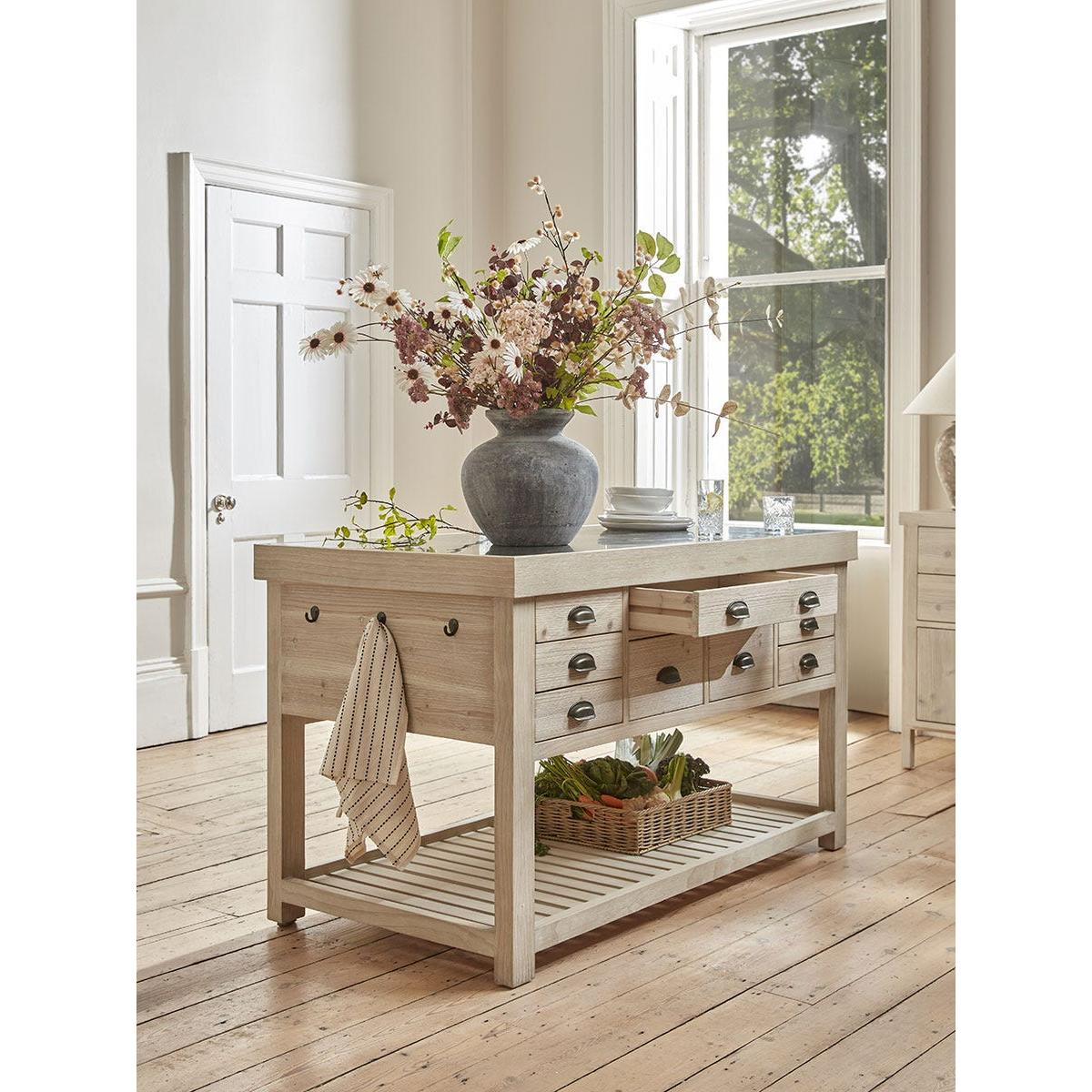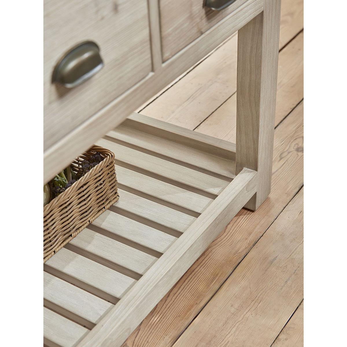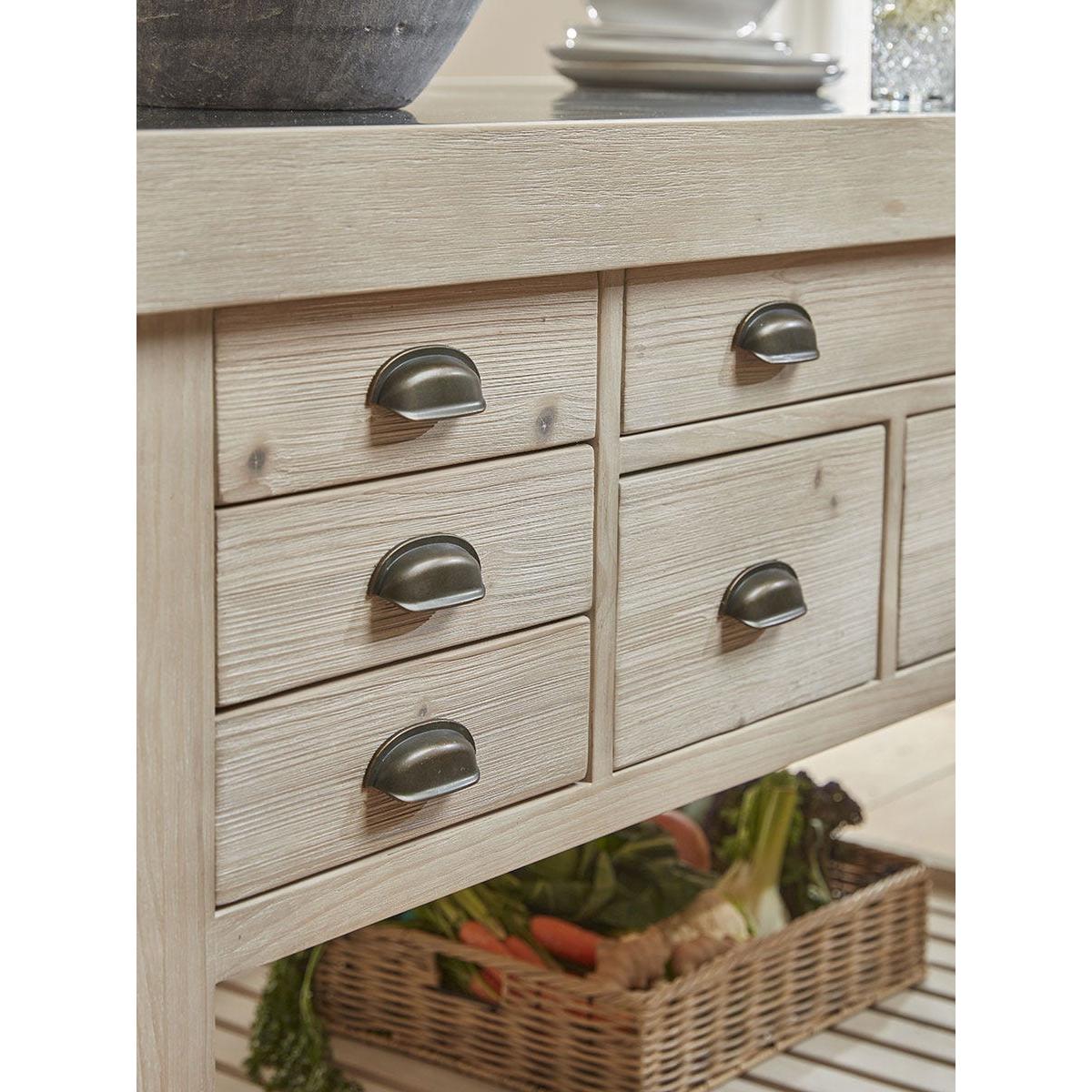 Full of country charm, our handmade Antonia Kitchen Island Unit is a statement piece that will transform any kitchen. The robust island features a beautiful blue stone top and a wealth of drawers of various sizes on both sides in which to store all your kitchen essentials. The drawers have smart cup handles with an antique brass finish. The base includes a slatted shelf ideal for holding heavier casseroles and kitchenware and a set of three pegs on the end offer an accessible place to hang tea towels and oven gloves. Made from recycled pine which shows all the beauty of the woodgrain, this lovely island will become central to everyday life.