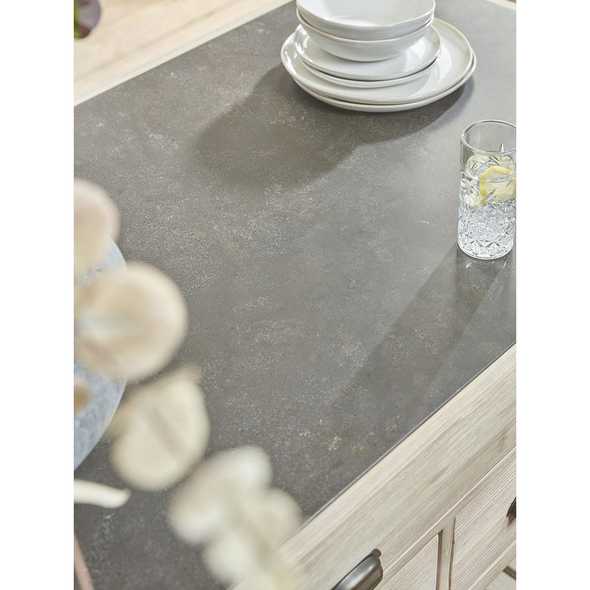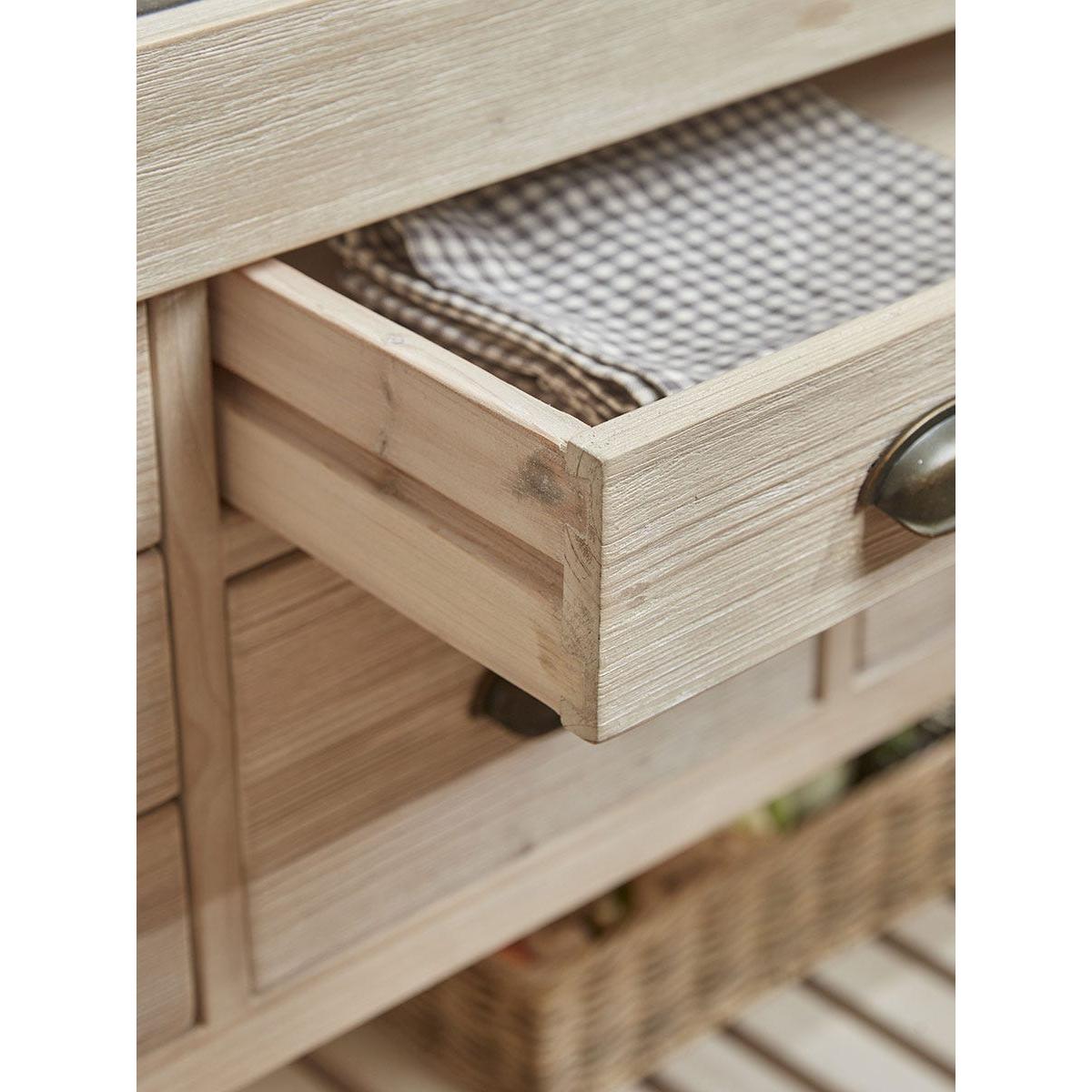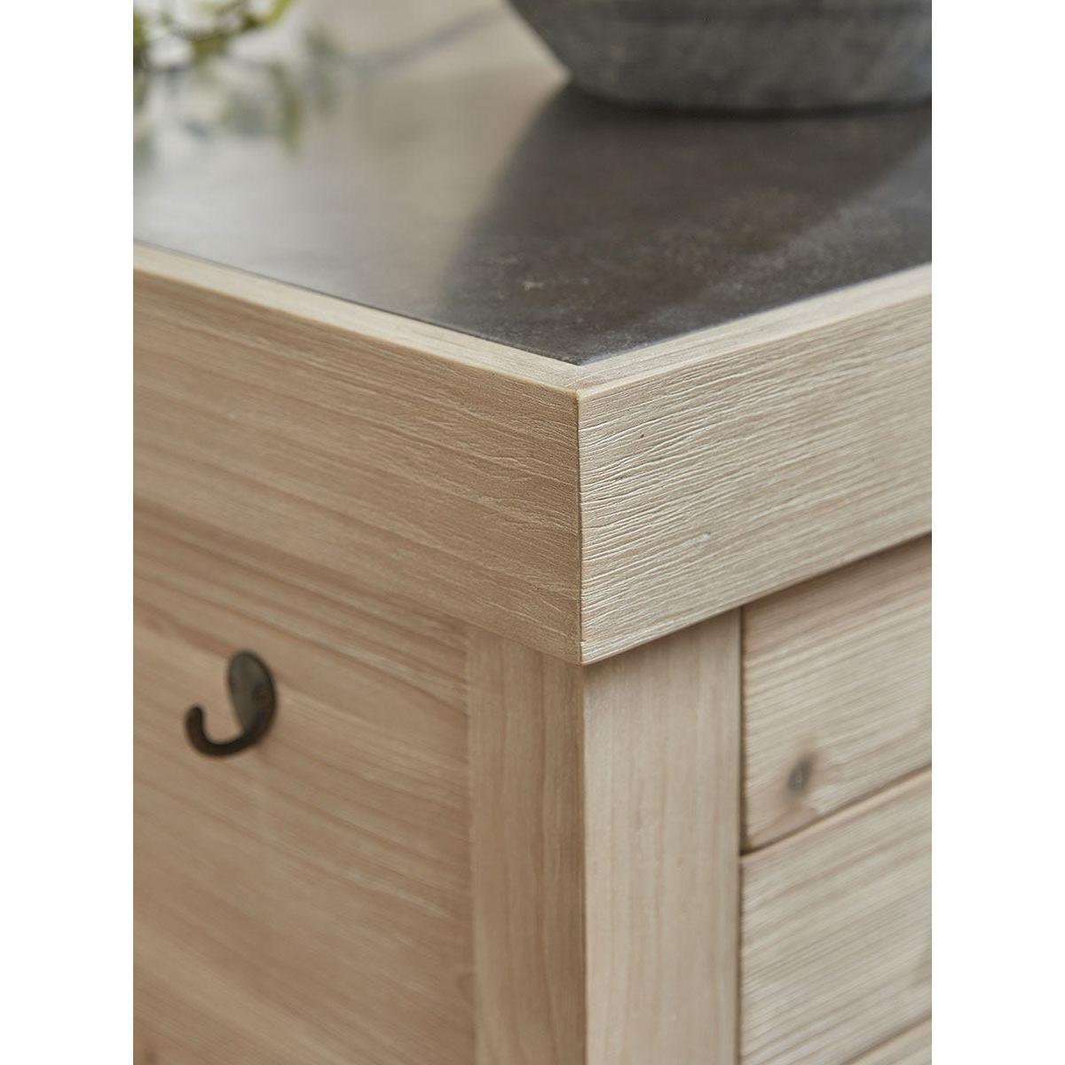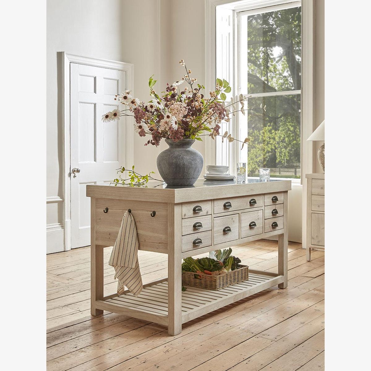 Full of country charm, our handmade Antonia Kitchen Island Unit is a statement piece that will transform any kitchen. The robust island features a beautiful blue stone top and a wealth of drawers of various sizes on both sides in which to store all your kitchen essentials. The drawers have smart cup handles with an antique brass finish. The base includes a slatted shelf ideal for holding heavier casseroles and kitchenware and a set of three pegs on the end offer an accessible place to hang tea towels and oven gloves. Made from recycled pine which shows all the beauty of the woodgrain, this lovely island will become central to everyday life.