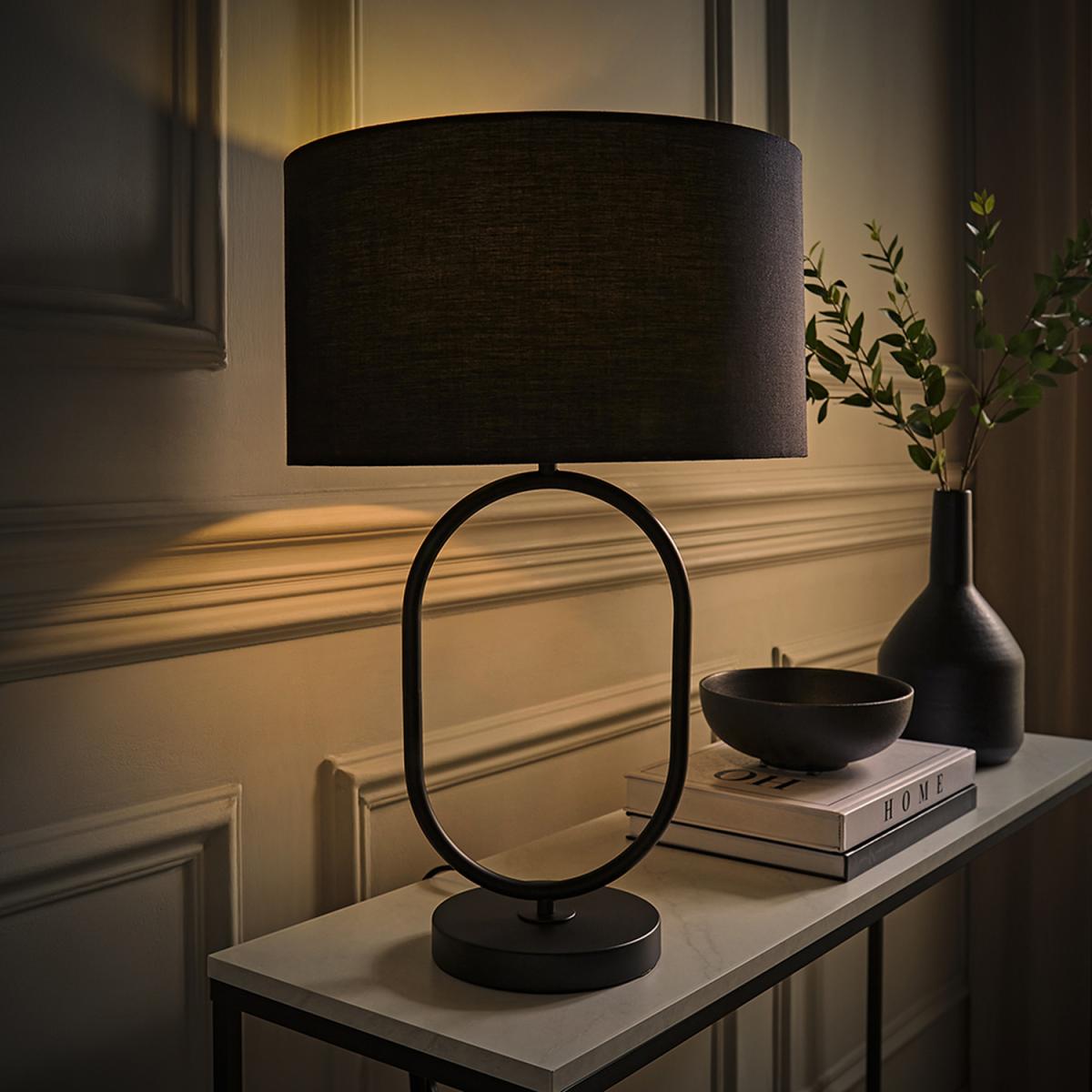 I love this lamp for its sleek, contemporary look that easily elevates both modern and minimalist interiors. The matte black finish and fabric drum shade give it a sophisticated edge, making it versatile enough for living rooms, bedrooms, or even a stylish home office. Practical styling tips include pairing it with other black or neutral-toned accessories to create a cohesive, understated aesthetic. It also works well on sideboards, bedside tables, or within a decorative vignette to bring a touch of elegance while providing functional lighting. The oval shape and understated design allow it to blend seamlessly without dominating the space, making it a clever choice for those wanting a modern but timeless addition to their decor.