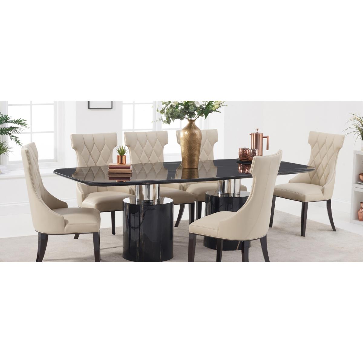 The Antonio 180cm Marble Dining Table With Sophia faux leather chairs features a durable marble table top makes this set both elegant and practical.