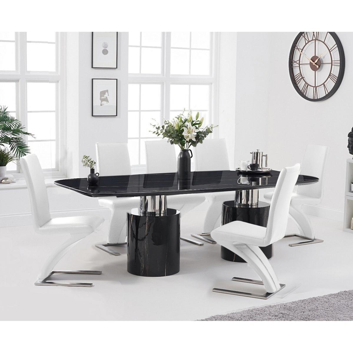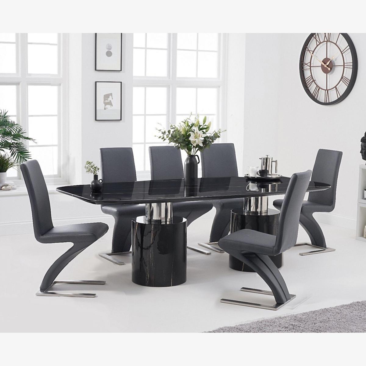 Stylish Antonio 180cm Marble Dining Table With Hampstead Chairs Stylish marble dining table with matching legs and tabletops. Durable and practical for everyday use.