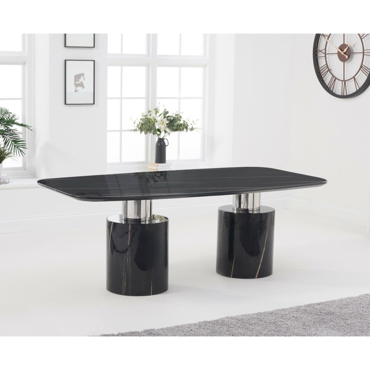 I love how the black marble dining table instantly lifts a scheme with its bold veining and sleek silhouette. Its dark, glossy surface works brilliantly in modern, industrial or minimalist interiors, but equally complements softer textures in a more transitional dining room. For styling, keep accessories simple - a low-profile vase of greenery or a pair of brass candlesticks will add warmth without cluttering the tabletop. Pair it with velvet-upholstered chairs or streamlined metal frames, and hang a statement pendant above to emphasise the table’s length and create an inviting focal point.