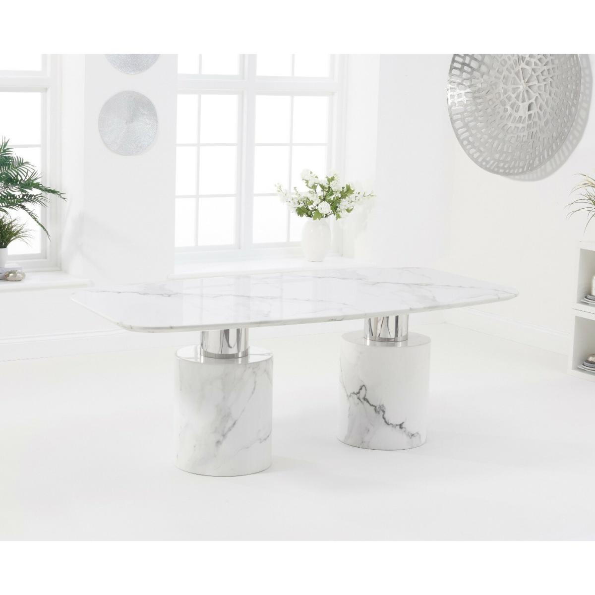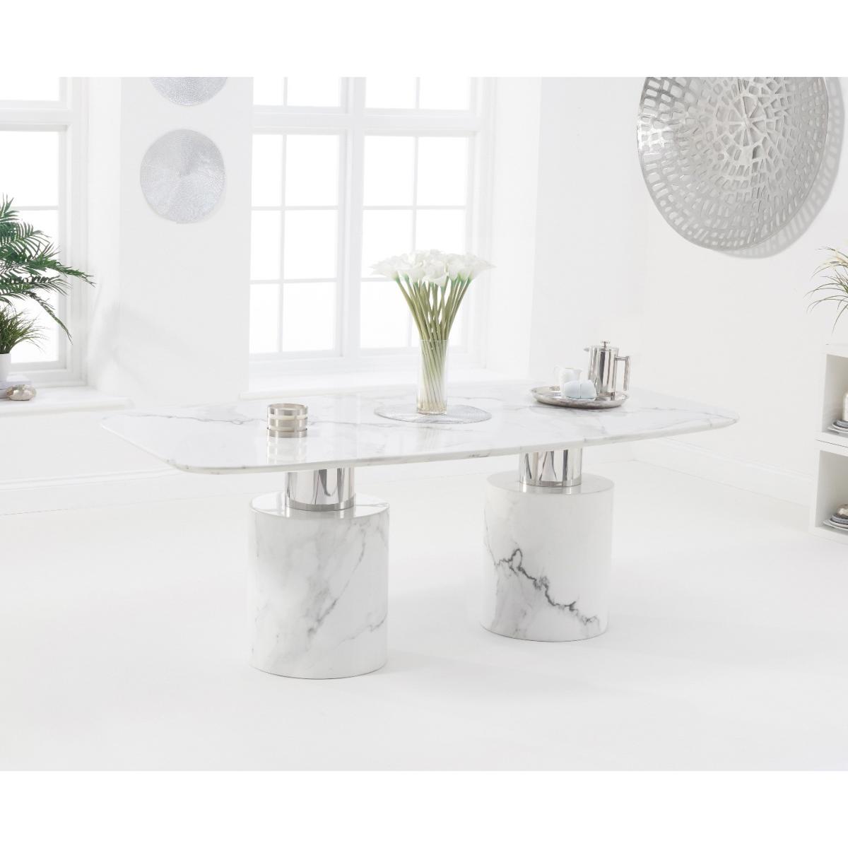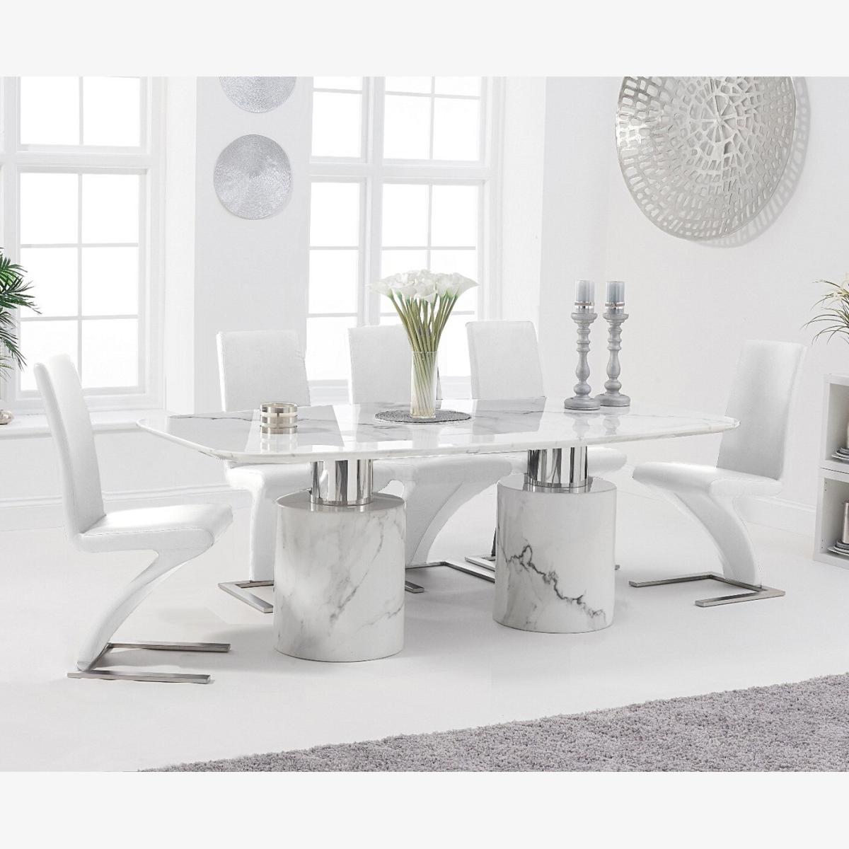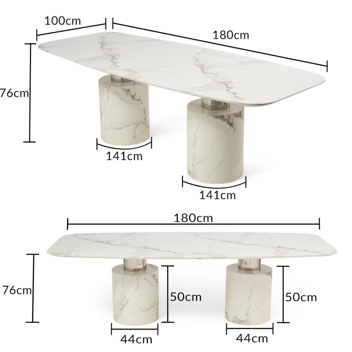 I really like this set for its clean, modern aesthetic. The white marble top adds an element of elegance, making it a striking centrepiece that works well in contemporary, minimalist, or Scandi-inspired interiors. The matching white chairs keep the look cohesive and light, which is ideal for brighter spaces. For styling tips, consider adding a pop of colour through accessories like placemats, vases, or chargers to prevent the set from looking too clinical. It's also versatile enough to pair with both soft textiles and metallic accents, making it suitable for both casual everyday dining and more formal occasions. When positioning the table, make sure to allow enough space for easy movement around it, especially if you opt for larger, comfortable chairs.