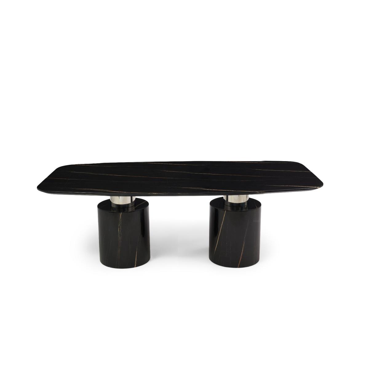 I’m particularly drawn to the Antonio table for its generous 220 cm span and sleek black marble top set on bold cylindrical bases - it makes a strong focal point without feeling over-busy. It sits naturally in contemporary or art-decó schemes, but equally lifts a muted Scandi palette when paired with lighter woods and soft textiles. For styling, keep centrepieces minimal - a low ceramic vase or pair of sculptural candleholders works well - and introduce contrast with velvet or leather dining chairs in charcoal, emerald or warm tan. Underfoot, a low-pile rug helps define the seating zone, while a statement pendant above ensures the marble surface catches the light without glare.