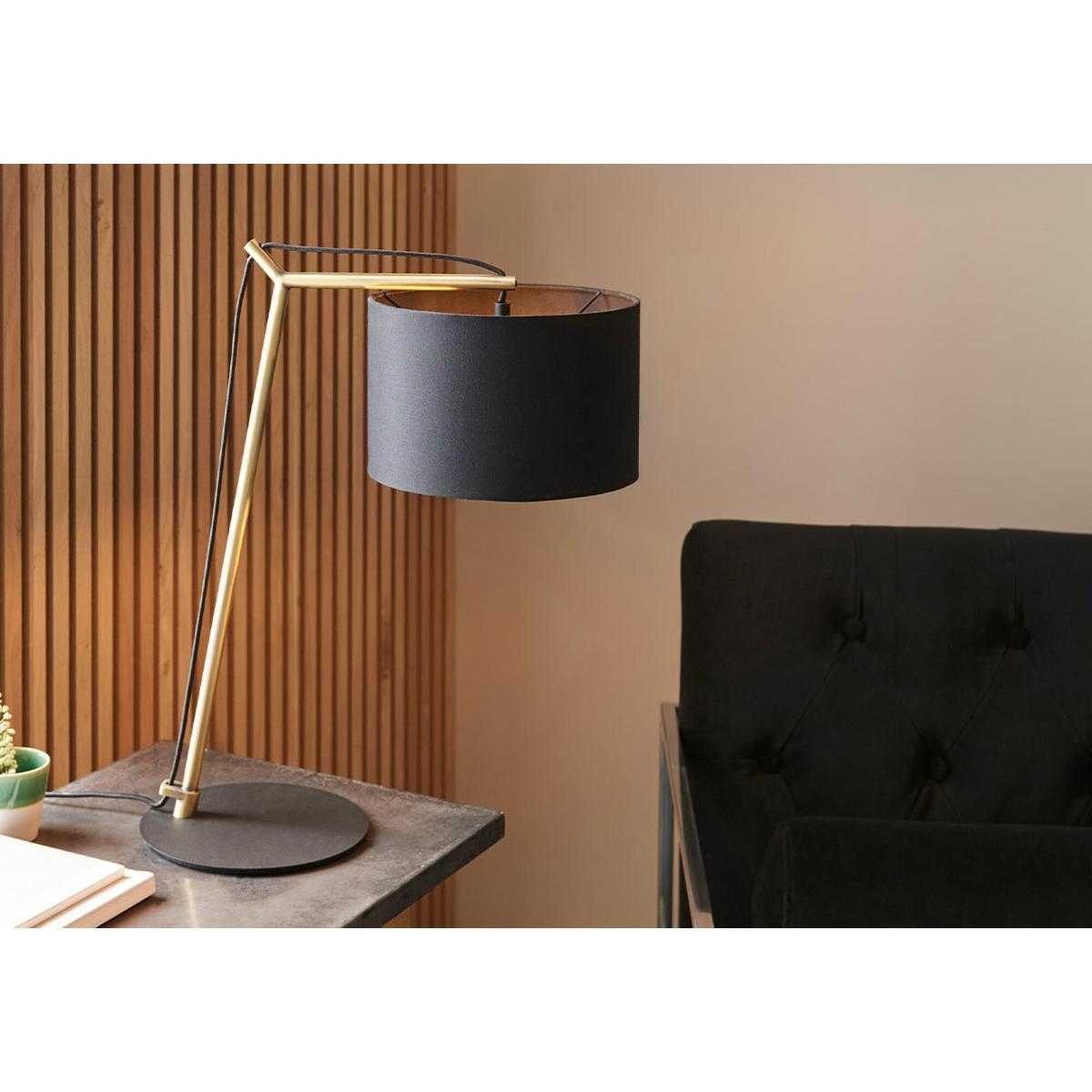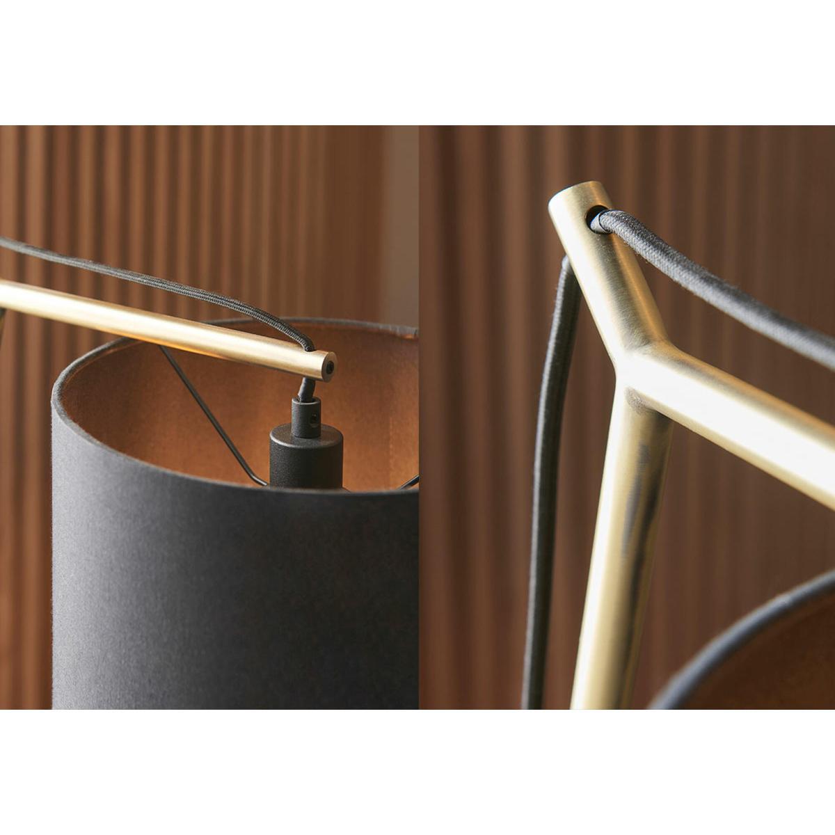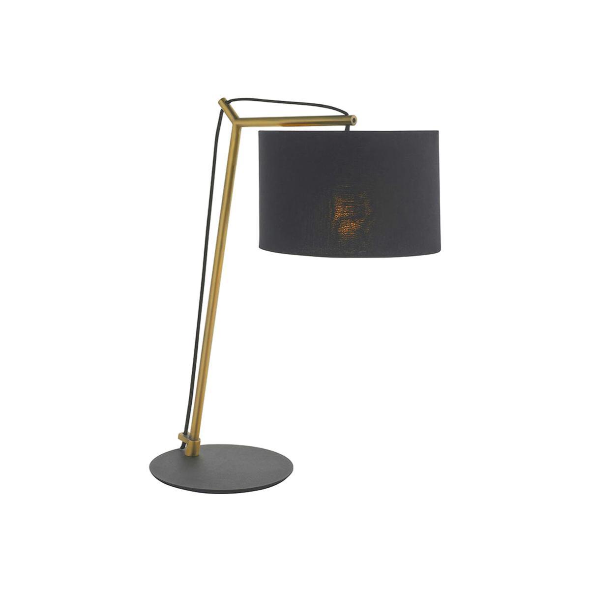 Kit out your home with the modern black accents of our Antonios range. Clean structured lines and soft black fabric shades define this range, and its versatility should not be underestimated. Whether you have a light space in need of some contrast, or a dramatic interior craving extra richness, this range provides floor lamps, table lamps and wall lights for every crevice of the room. This table lamp, finished in matt brass with an exposed fabric flex, is a striking option for desk and table lighting, easily complementing other geometric features in the room, natural woods and monochrome colour palettes.