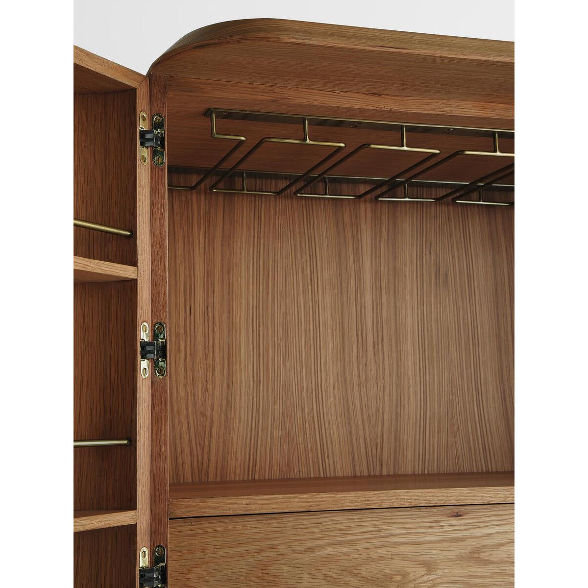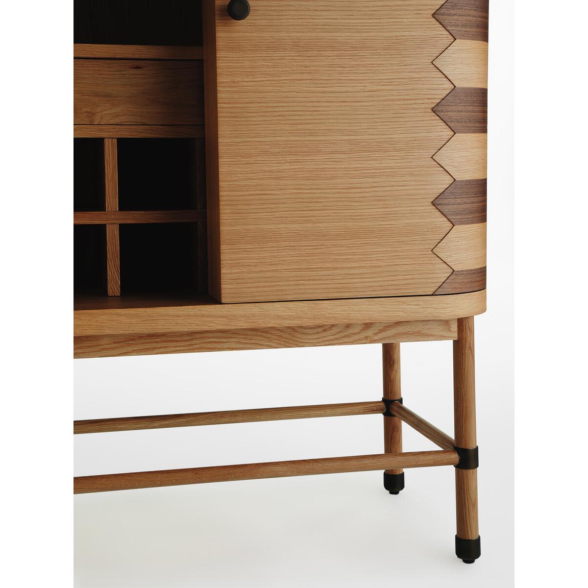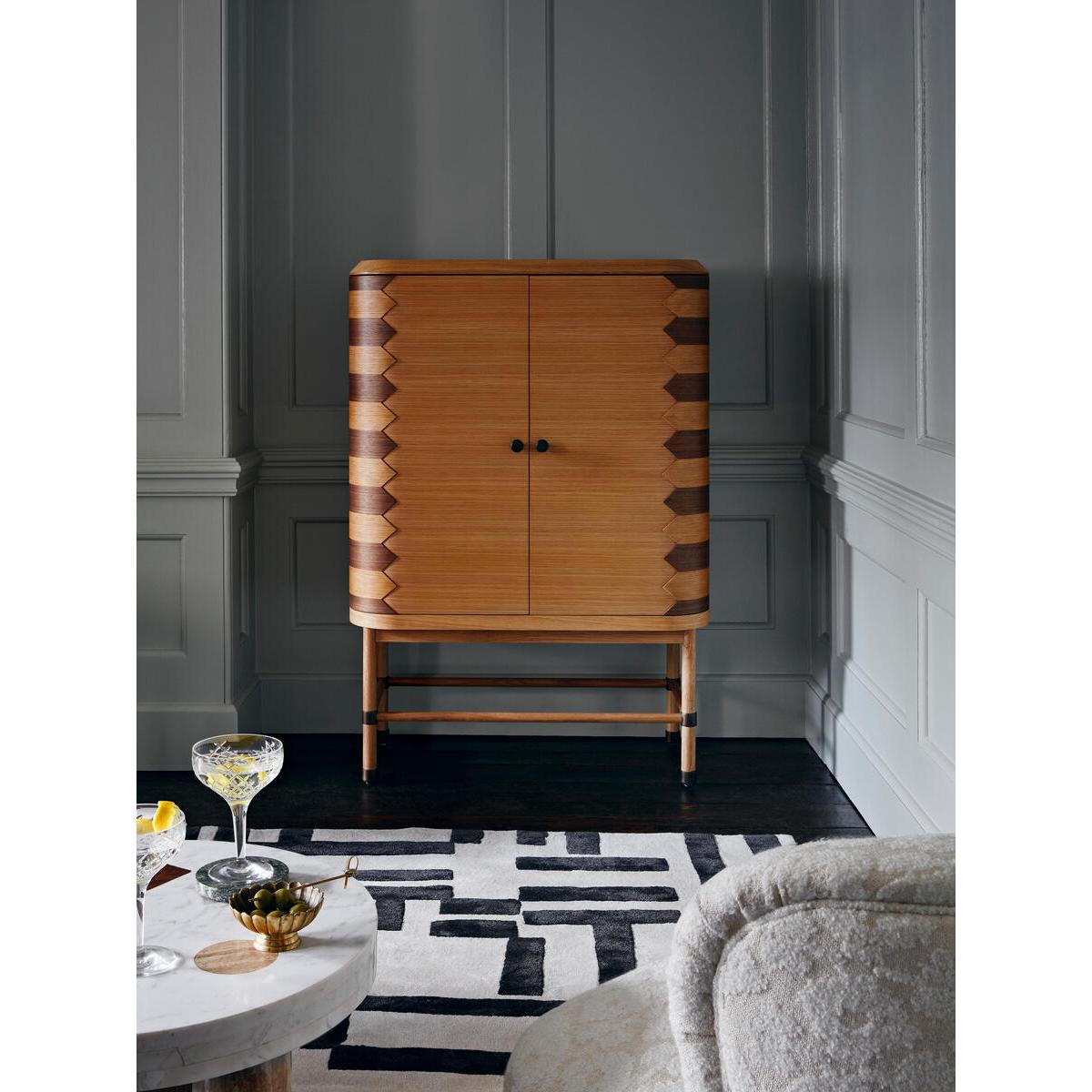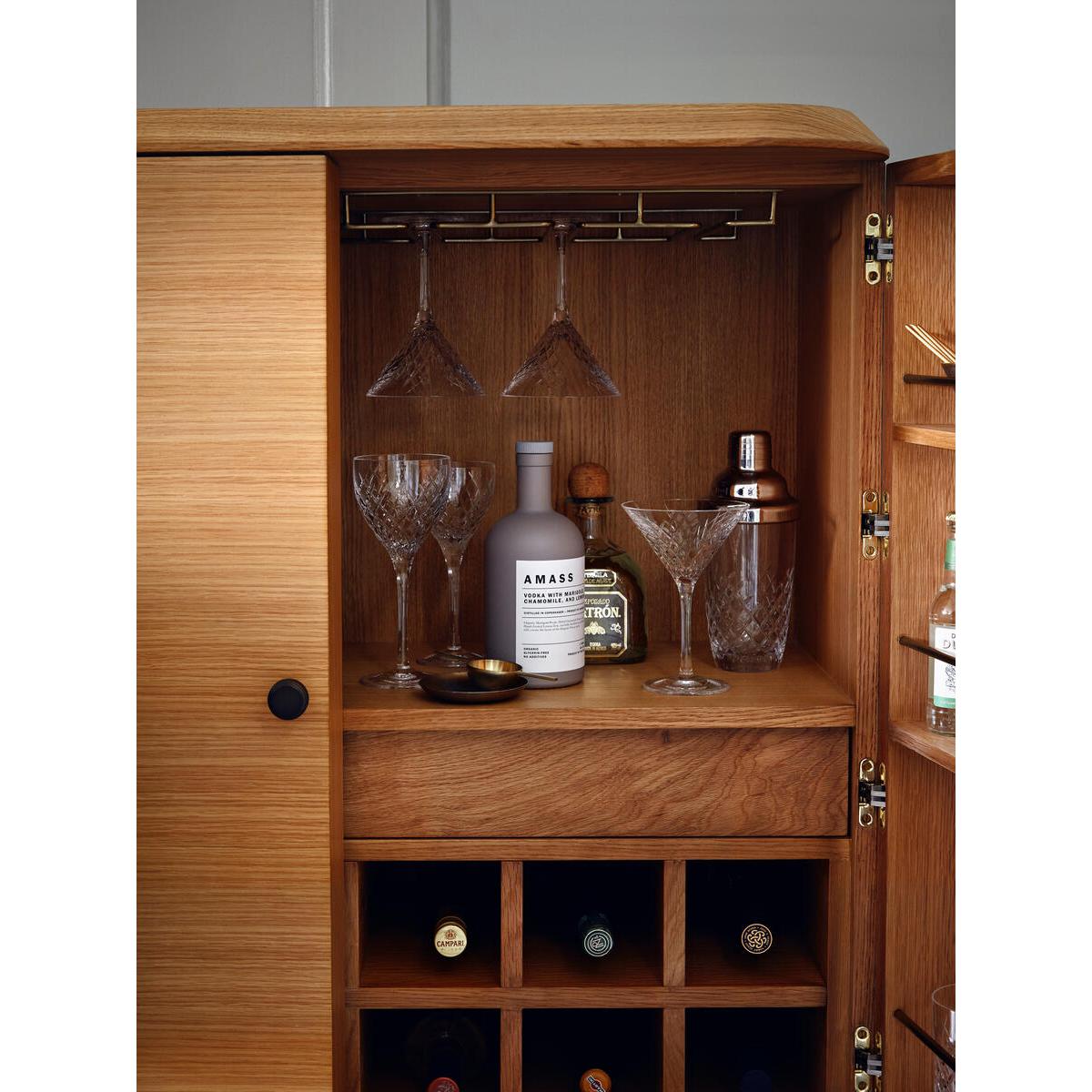 The Anuel drinks cabinet showcases the appeal of mixed materialsin a functional design. The oak and walnut wooden body is accentedwith blackened brass hardware. Providing a practical storage space,it opens with sleek handles to reveal an organised interior,complete with wine storage, a wineglass hanging rack and draw anddoor storage. Blackened brass handles. Solid oak and ash. Inspired by Soho House Rome.