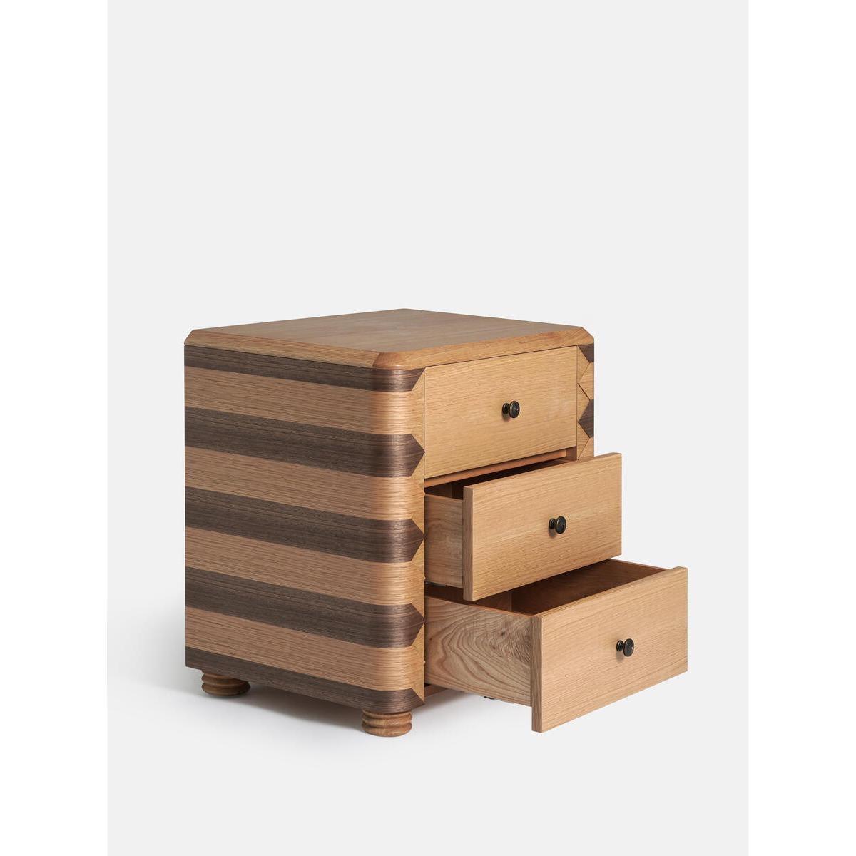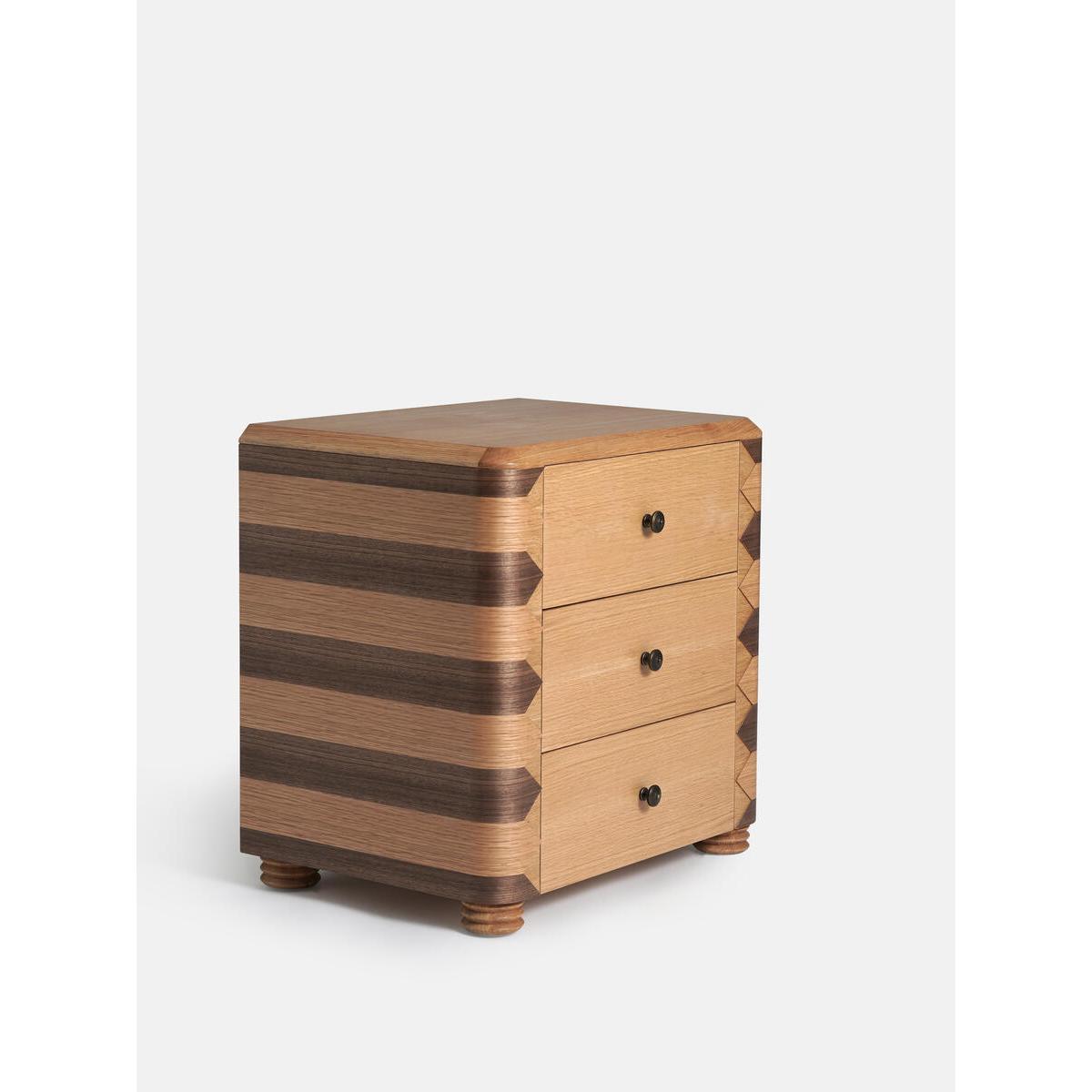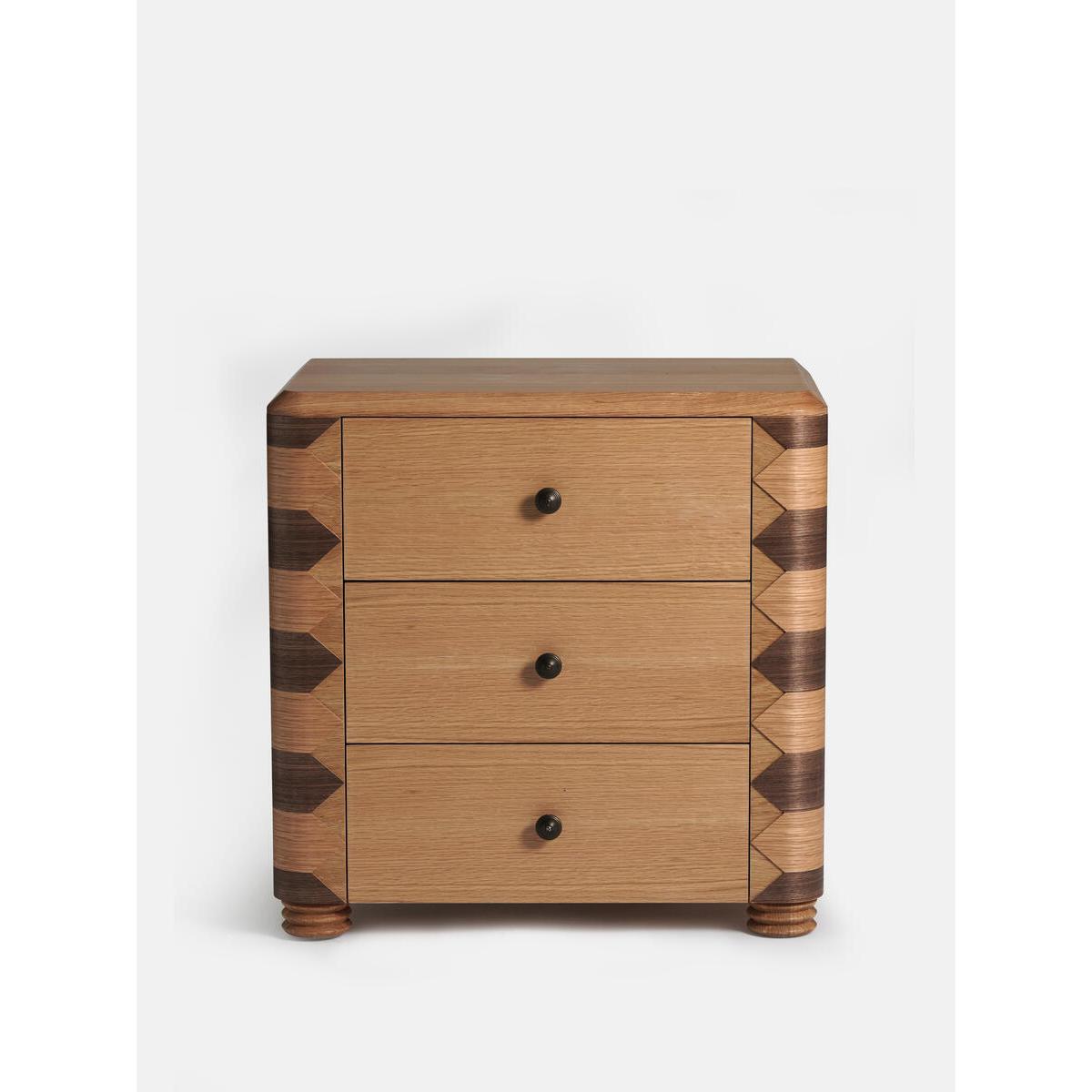 Inspired by our House in Rome, this bedside cabinet is crafted from solid oak and walnut with blackened brass handles for a streamlined shape. Its tactile, natural oak finish lends itself to a variety of interior settings, be they classic or contemporary. • Three drawer side cabinet • Blackened brass handles • Solid oak and walnut • Inspired by Soho House Rome