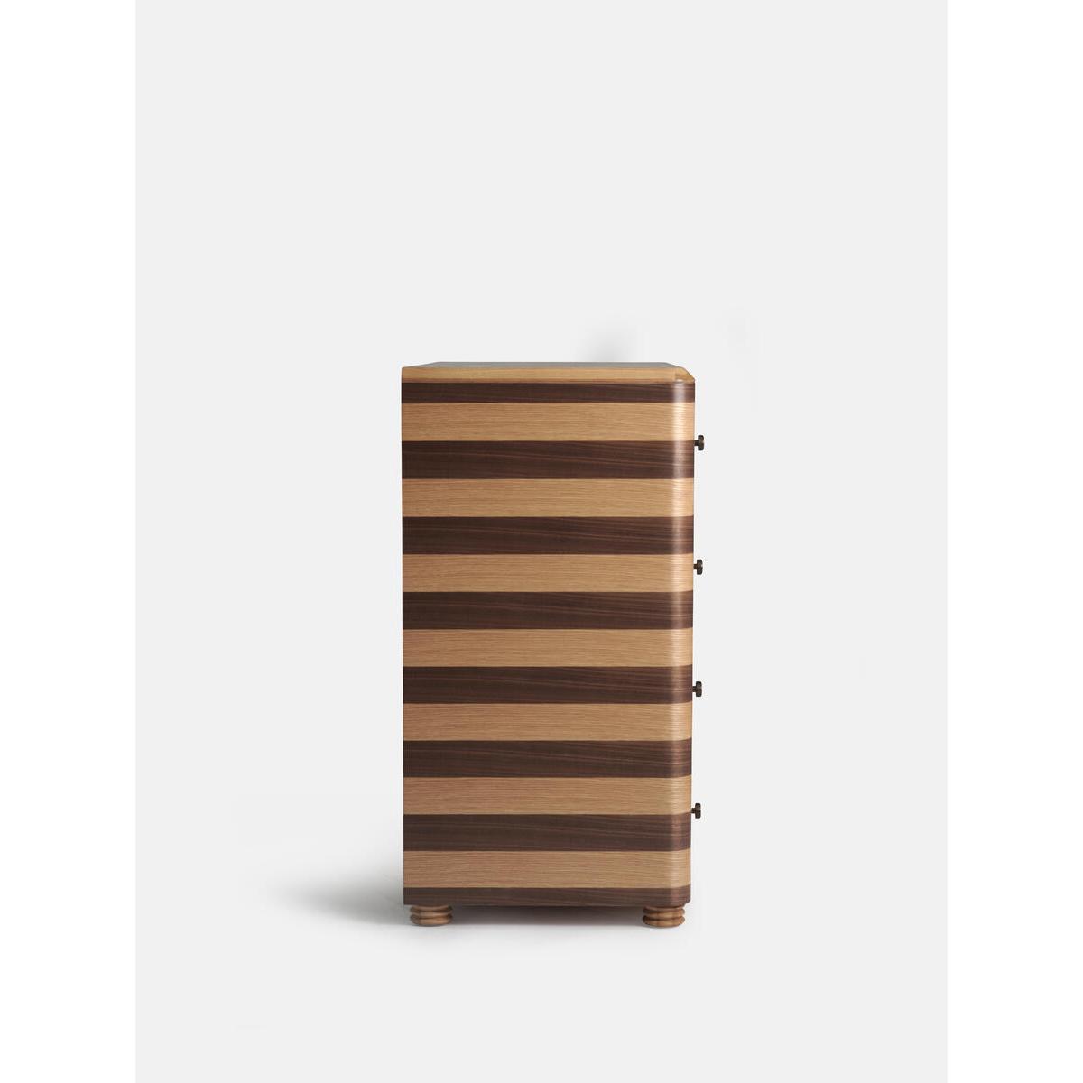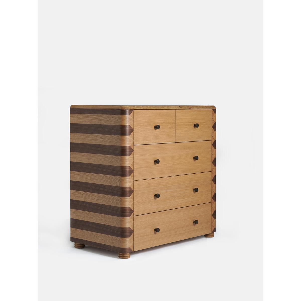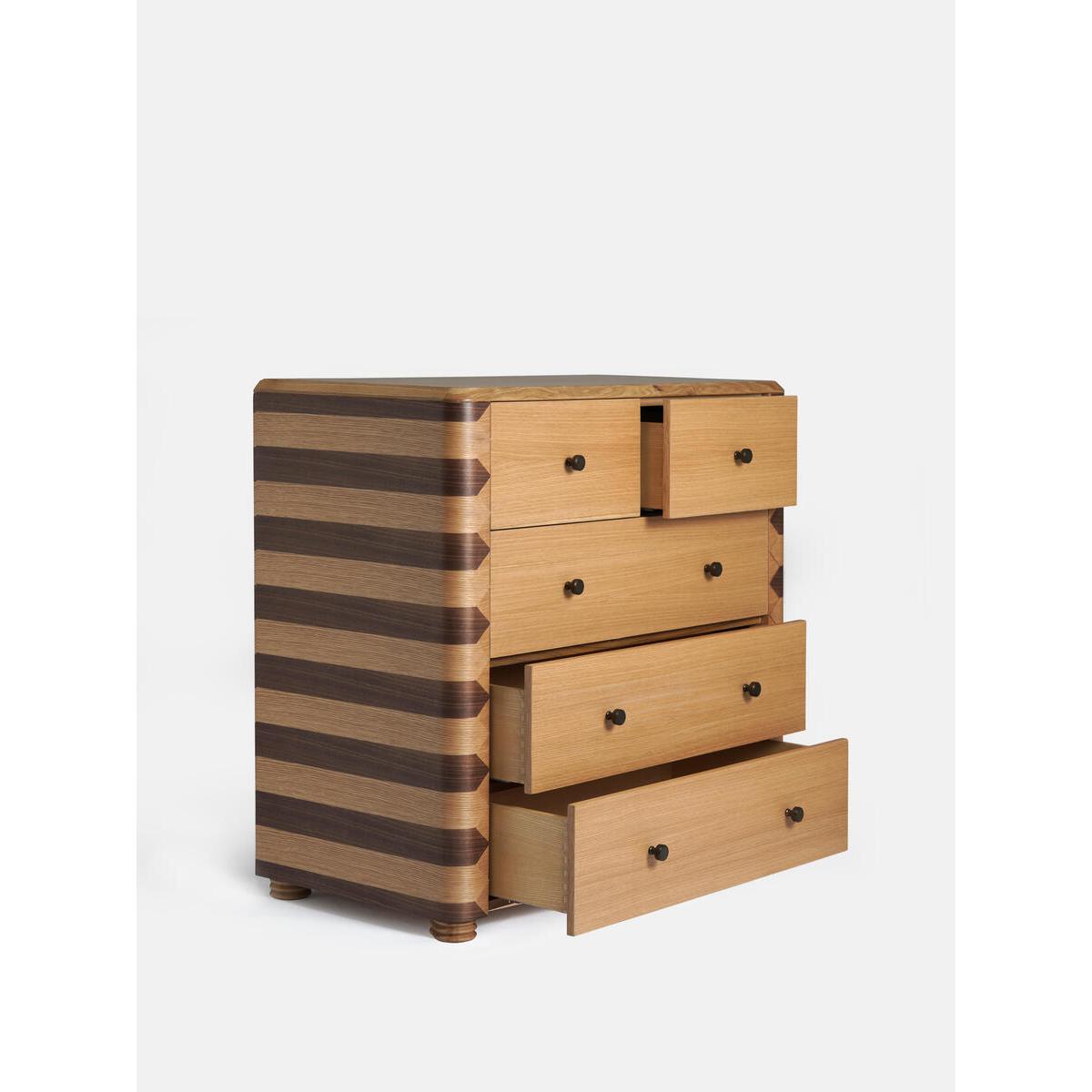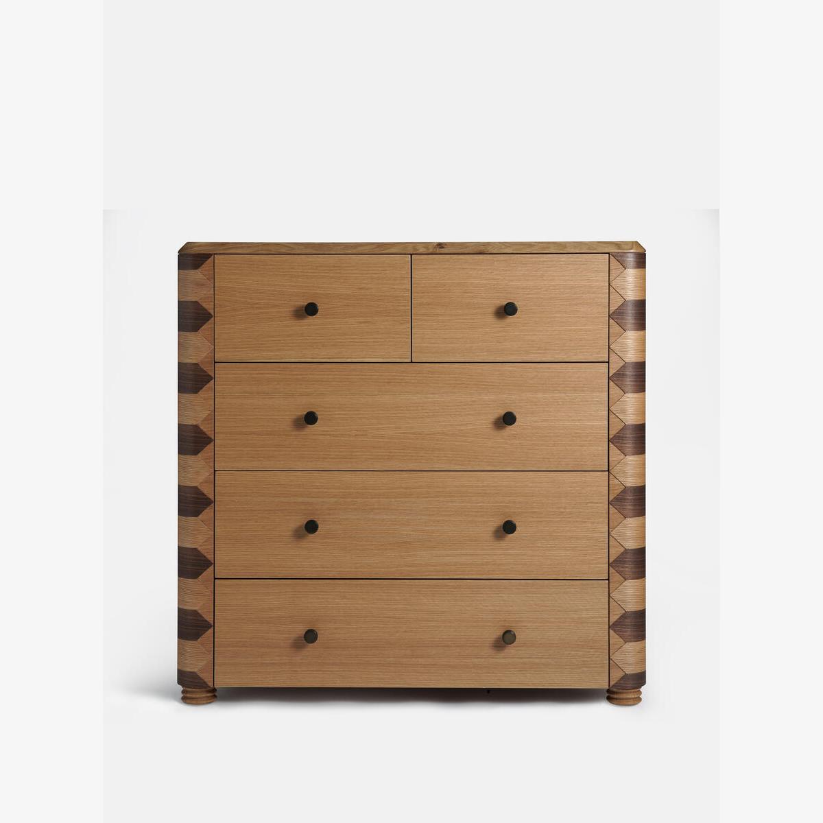 Inspired by our House in Rome, this dresser is crafted from solid oak and walnut with five spacious drawers and blackened brass handles for a streamlined shape. Its tactile, natural oak finish lends itself to a variety of interior settings, be they classic or contemporary. • Five drawer dresser • Blackened brass handles • Solid oak and ash • Inspired by Soho House Rome