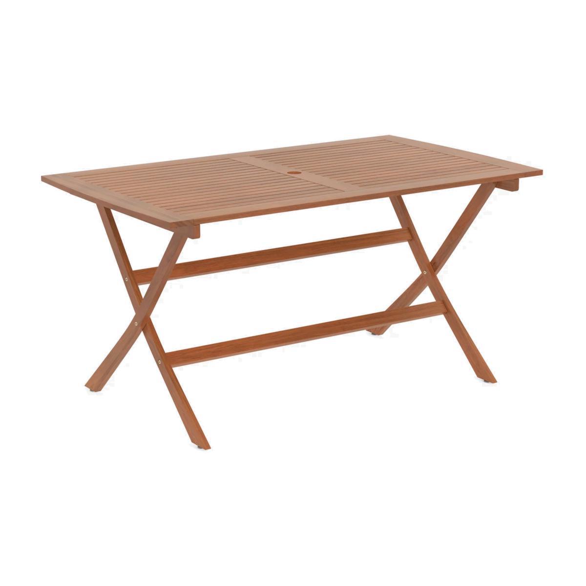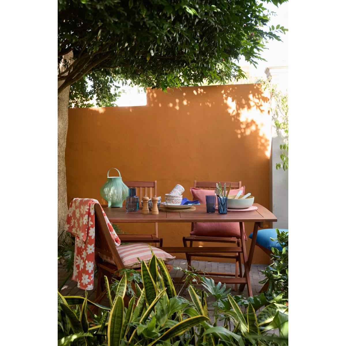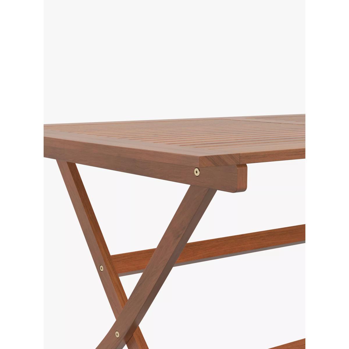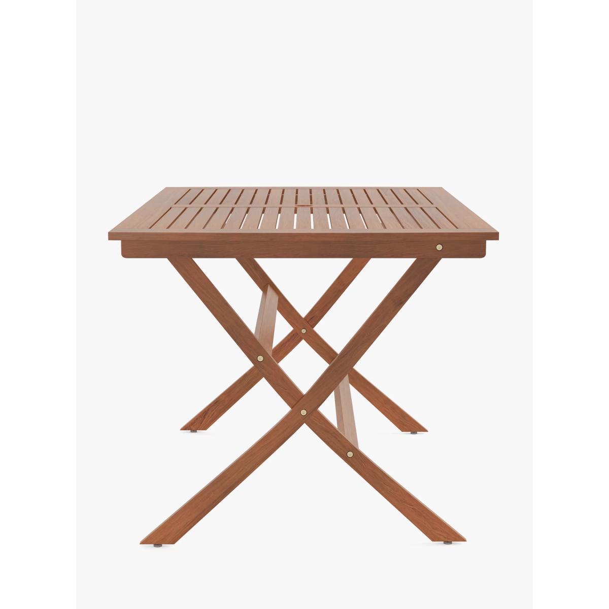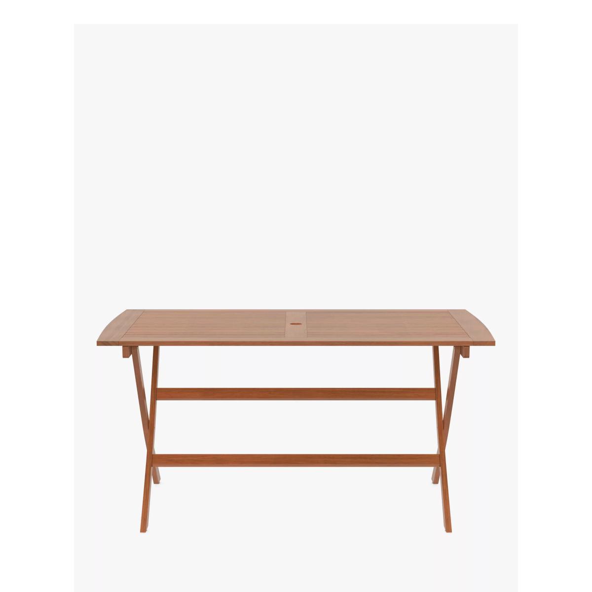 Made of beautifully finished eucalyptus wood, this weather-resistant rectangular garden dining table folds for easy storage. The FSC-certified eucalyptus wood is naturally moisture-resistant, hardy and long-lasting. Easy to assemble, the table comfortably seats up to six people. Key features: Rectangular dining table made of FSC-certified eucalyptus wood Folds for easy storage Weather resistant Includes a 5cm parasole hole Easy to maintain Easy to assemble By choosing this product you are supporting responsible management of the world's forests. The Forest Stewardship Council® (FSC®) is a global, not-for-profit organisation that helps take care of forests and the people and wildlife that call them home. To learn more, visit. Want to see it first? You may want to see and get a feel for the product in one of our shops before ordering. We'll be able to tell you where the range you'd like to view is on display. Choose the perfect outdoor furniture We have a selection of wooden furniture for you to choose from which will suit the home or garden. Below are a few options to consider when choosing your perfect outdoor furniture. Teak A premium and popular wood with an attractive appearance which ages beautifully. Strong, durable and resistant to rot and decay, this furniture requires little maintenance Eucalyptus Distinctive scent and appearance which darkens as it ages. Provides similar natural benefits to teak including moisture resistance, hardness and durability. It's plentiful in supply which makes the furniture an inexpensive choice. Acacia Naturally durable, this wood is incredibly hard and is unlikely to suffer damage during everyday use. It provides similar natural benefits to teak, yet unlike many other hardwoods, acacia is also relatively fast growing which minimises the environmental impact. With great prices and great design, our new brand offers style and quality for modern living today. Whatever you need, there's joy to be found in.