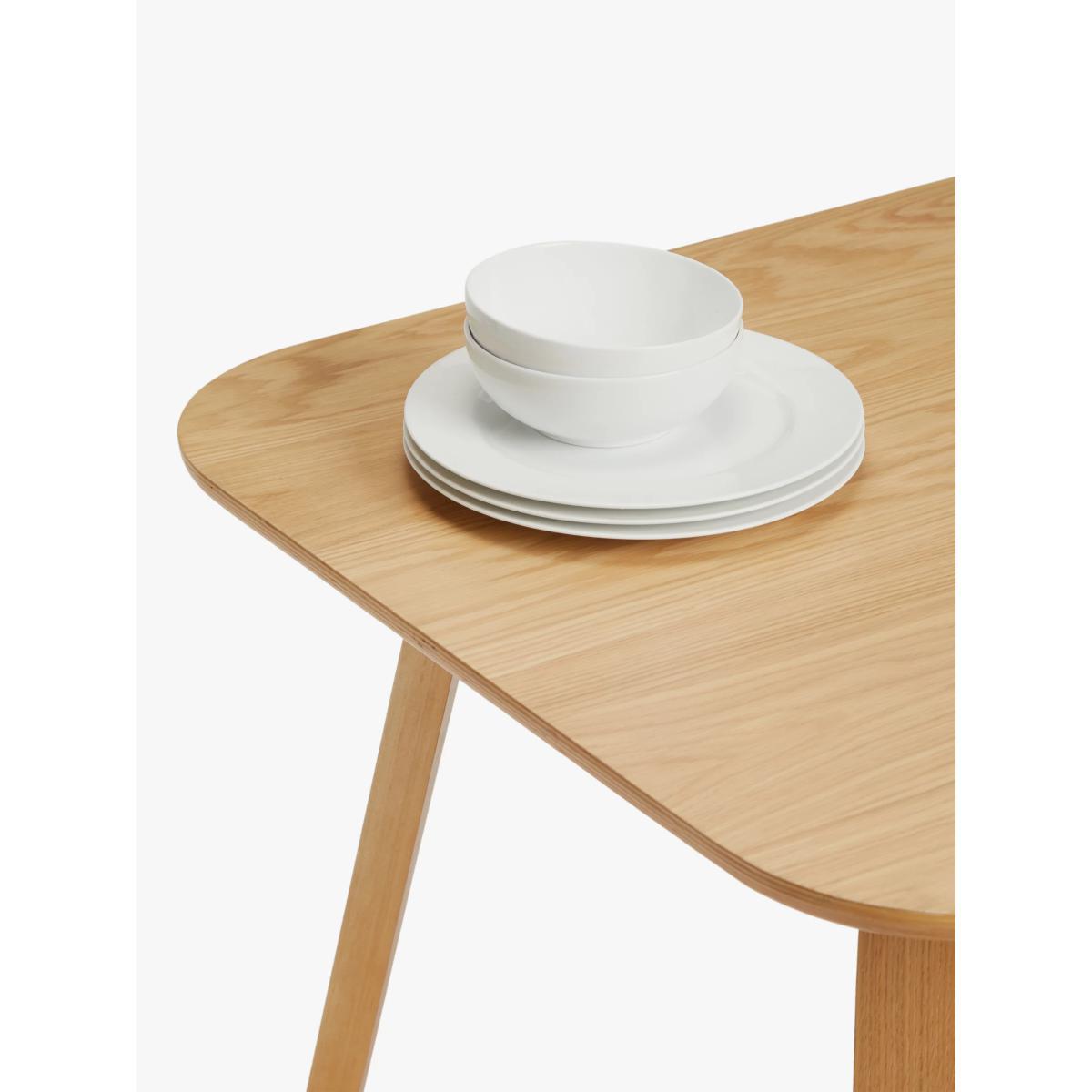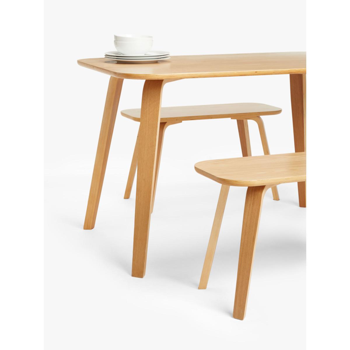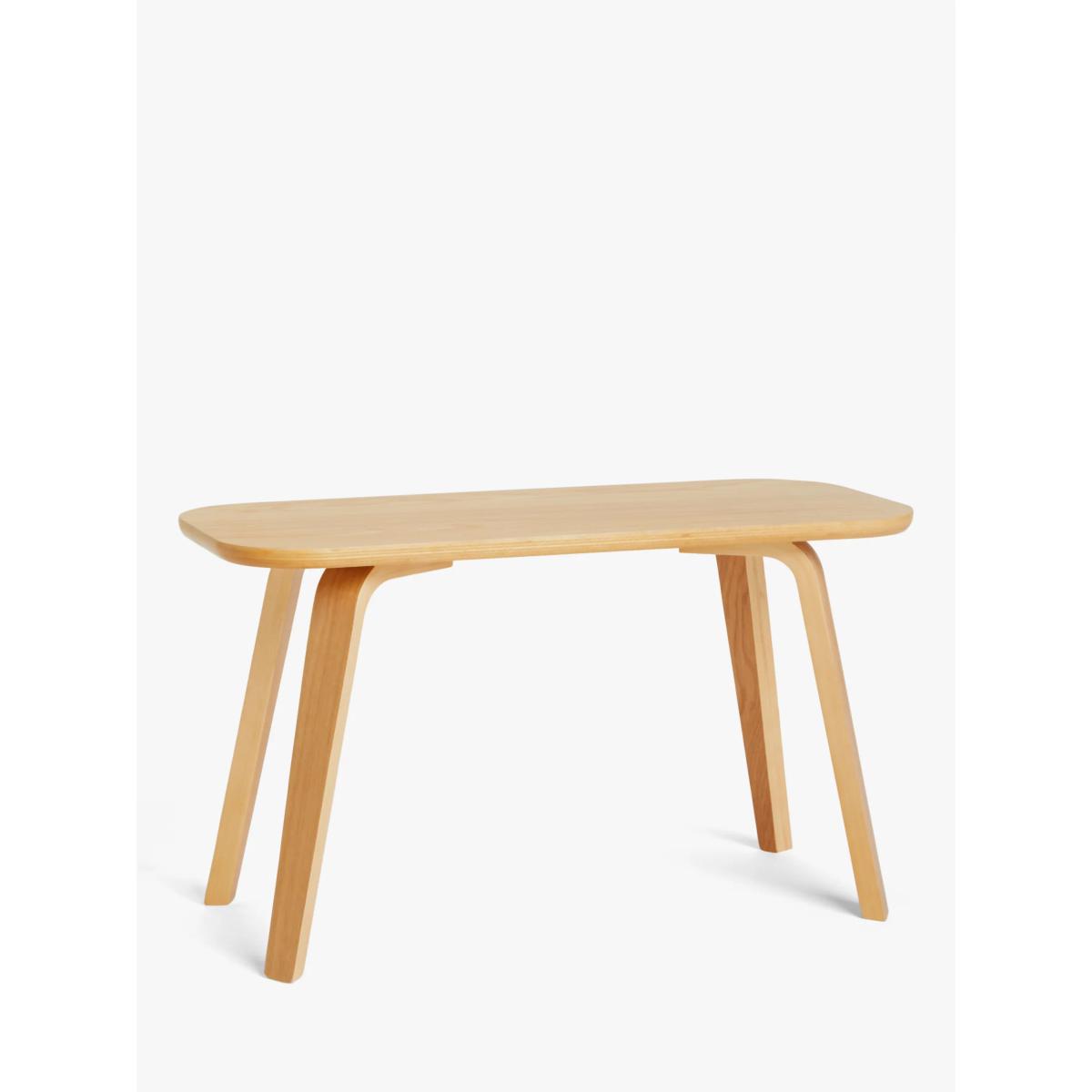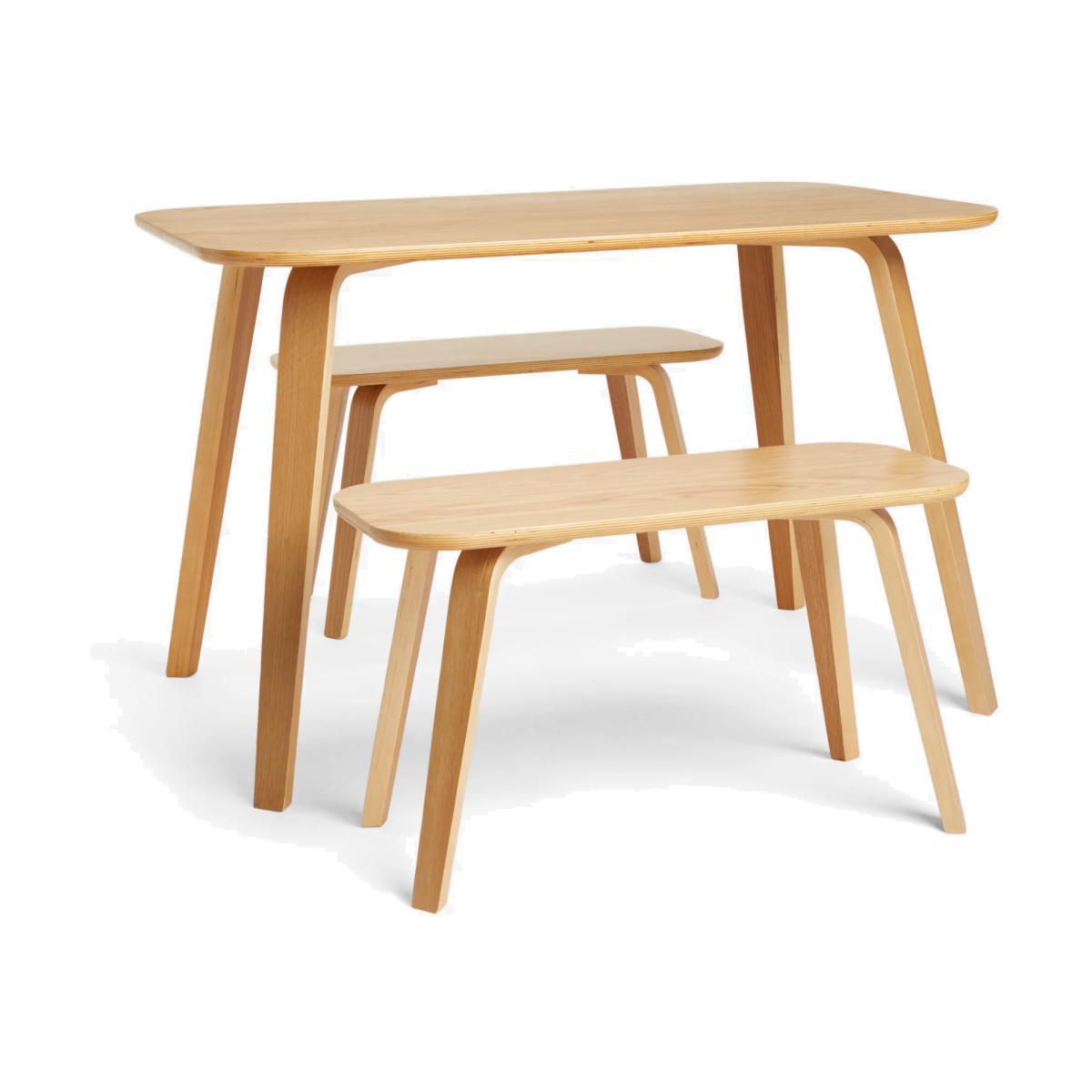 Create an inviting dining area with this practical dining table and bench set. It's a brilliant choice for smaller spaces as each bench is suitable for two people, so you can comfortably seat four people around the table. We've made both the table and bench from high-quality oak veener and plywood and kept the finish natural to create a warm look. We've also coated it in a lacquer for extra durability. Plus, steam-bent legs and rounded edges nod to Scandi-inspired design and help to create a softer style in your space. Want to see it first? You may want to see and get a feel for the furniture in one of our shops before ordering. We'll be able to tell you where the range you'd like to view is on display. With great prices and great design, our new brand offers style and quality for modern living today. Whatever you need, there’s joy to be found in.