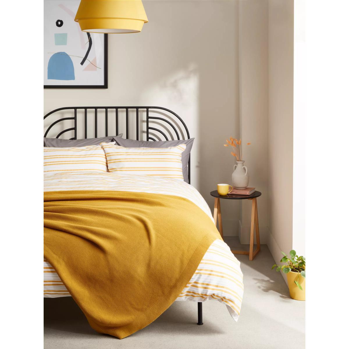 Bright and summery striped bedding made from a blend of polyester and cotton. It dries quickly, keeps its colour and size and needs minimal ironing. The single set comes with one standard pillowcase, while the double and king sets come with two standard pillowcases. With great prices and great design, our new brand offers style and quality for modern living today. Whatever you need, there’s joy to be found in. Have you thought about sheeting? Shop. Bedding sizes To fit duvet/pillow size (cm) Standard pillowcase, L75 x W50cm Single duvet cover, L200 x W135cm Double duvet cover, L200 x W200cm King duvet cover, L220 x W225cm