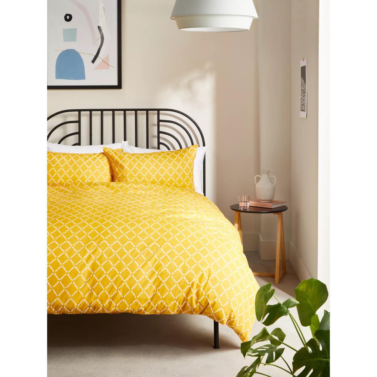 A colourful, diamond Ikat print made from a blend of polyester and cotton. It dries quickly, keeps its colour and size and needs minimal ironing. The single set comes with one standard pillowcase, while the double, king and super king sets come with two standard pillowcases. With great prices and great design, our new brand offers style and quality for modern living today. Whatever you need, there’s joy to be found in. Have you thought about sheeting? Shop. Bedding sizes To fit duvet/pillow size (cm) Standard pillowcase, L75 x W50cm Single duvet cover, L200 x W135cm Double duvet cover, L200 x W200cm King duvet cover, L220 x W225cm Super king duvet cover, L220 x W260cm