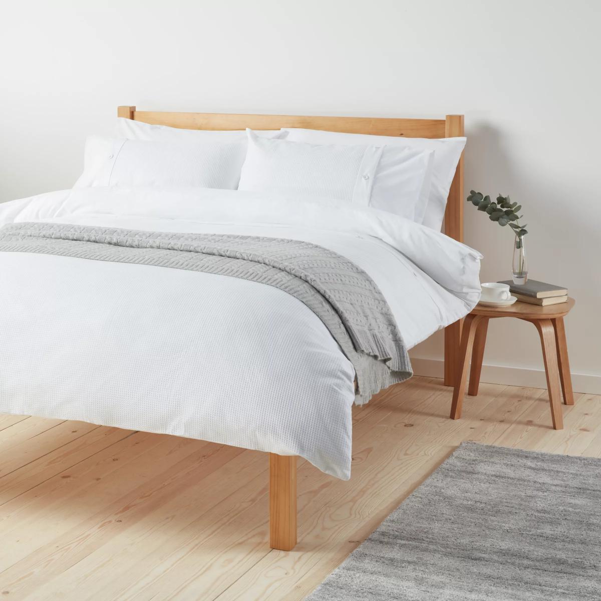This easy care bed linen is quick-drying and needs minimal ironing. Polycotton Our easy care blend of polyester and cotton has natural properties which make it easier to care for. It dries quickly, keeps its colour and size and needs minimal ironing. 180 Thread count This number refers to the number of threads per square inch. Typically, the higher the thread count, the softer and smoother the feel. The single set comes with one standard pillowcase, while the double, king and super king sets come with two standard pillowcases. Have you thought about sheeting? Shop. Bedding sizes To fit duvet/pillow size (cm) Standard pillowcase, L75 x W50cm Single duvet cover, L200 x W135cm Double duvet cover, L200 x W200cm King duvet cover, L220 x W225cm Super king duvet cover, L220 x W260cm With great prices and great design, our new brand offers style and quality for modern living today. Whatever you need, there’s joy to be found in.