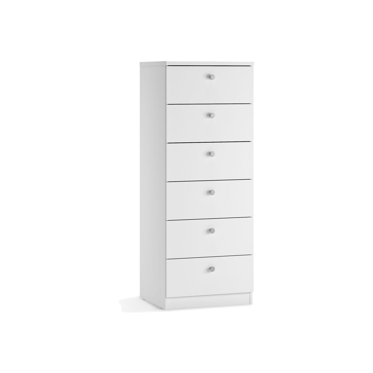 Mix It offers the flexibility to create your own contemporary, self-assembly bedroom furniture. Italian designed and manufactured, we have created this tall drawer chest bundle for you, however more colours and combinations can be created by mixing and matching pieces from the range. The full range is available in selected stores. This narrow chest of drawers is crafted from foil wrapped MDF and features six spacious drawers. Small chrome knob handles are attached to each drawer. Full assembly instructions are provided. Product features: Overall Dimensions: H131 x W50 x D45cm Composition: MDF, Chipboard, Foil, Metal