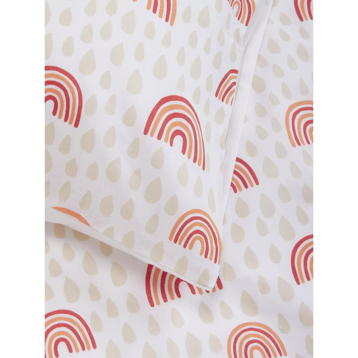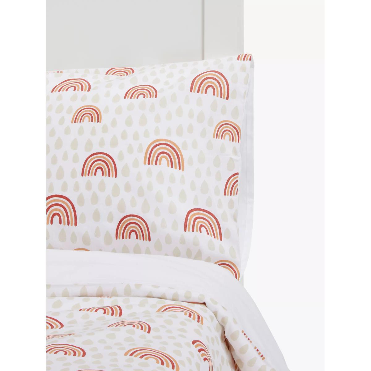 Liven up your nursery while ensuring a comfortable night's sleep for your little one with this duvet cover and pillow set from our collection. The set has one duvet cover and a matching junior pillowcase, both of which are covered in colourful rainbow print. Crafted from pure cotton for a breathable feel that won't irritate their skin, it has a 144 thread count to ensure the little one stays comfortable at all times. Please remember: Quilts, duvets and pillows are not suitable for children under 12 months due to the risk of overheating. The Better Cotton Initiative (BCI) is a not-for-profit organisation who exists to ‘make global cotton production better for the people who produce it, better for the environment it grows in, and better for the sector's future. BCI works with partners around the world such as WWF, Solidaridad and Cotton Connect to train farmers to produce cotton more sustainably. By buying cotton products from John Lewis, you're supporting the training of these farmers to use water efficiently, care for the health of the soil and natural habitats, reduce the use of the most harmful chemicals and apply principles of fair and decent work.