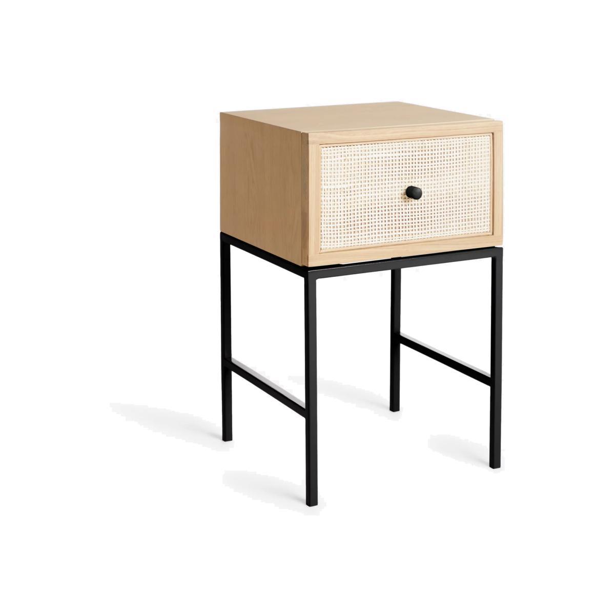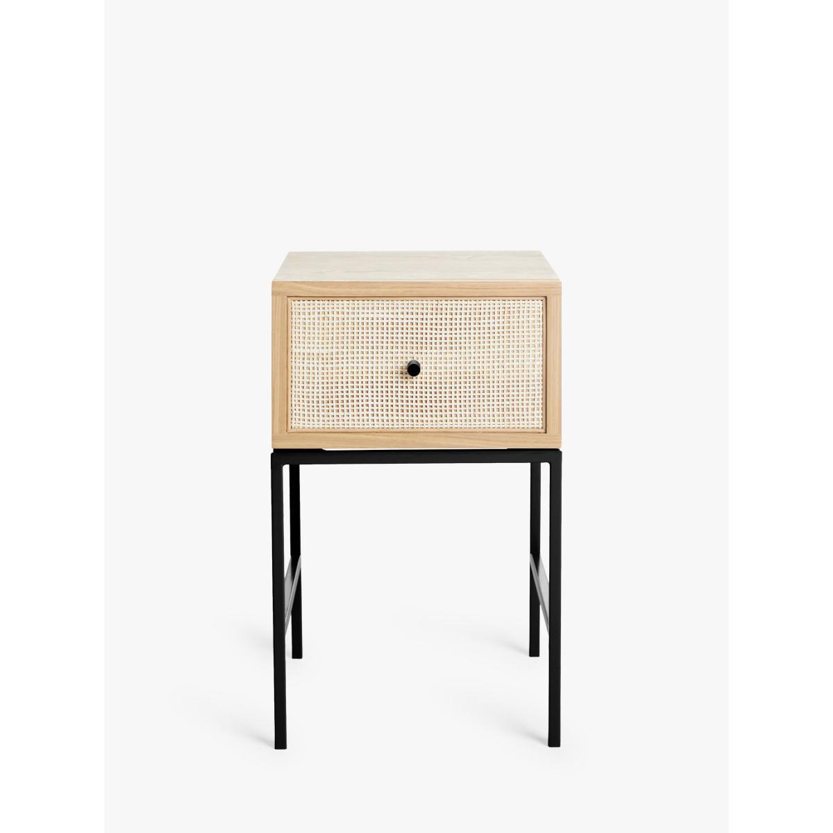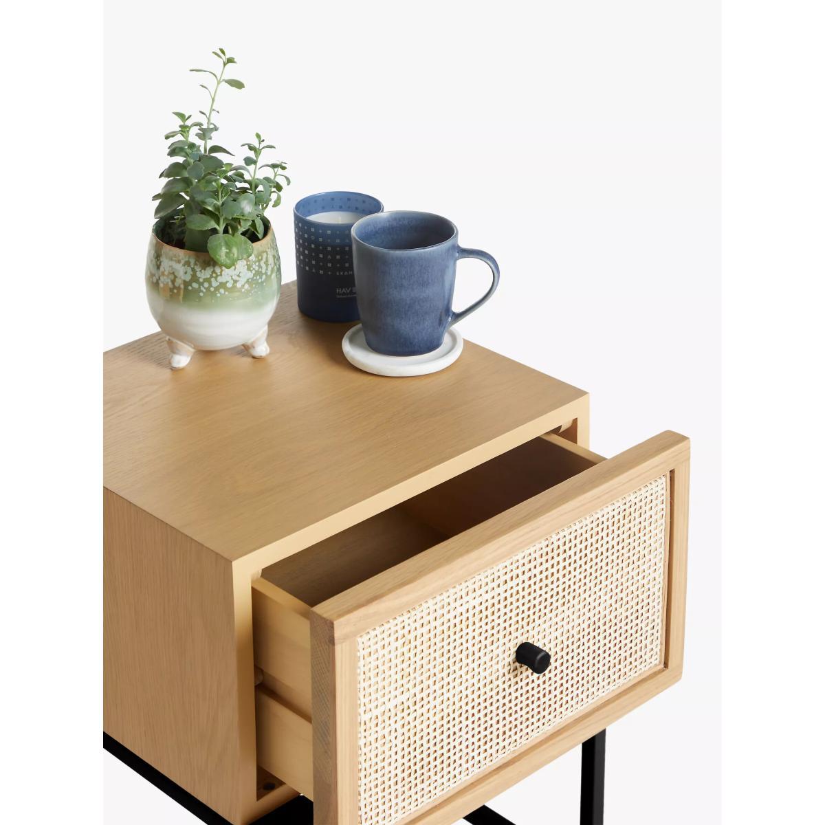 Compact, functional furniture that doesn't compromise on style. We've made this bedside table from a combination of high-quality timbers including: solid oak, pine wood and MDF, alongside a sturdy, yet minimalist metal frame. With one deep storage drawer, it's just the right size for your bedside essentials and the drawer front is designed with a rattan front which gives it a soft, Scandi-inspired edge. Want to see it first? You may want to see and get a feel for the furniture in one of our shops before ordering. We'll be able to tell you where the range you'd like to view is on display. With great prices and great design, our new brand offers style and quality for modern living today. Whatever you need, there’s joy to be found in.