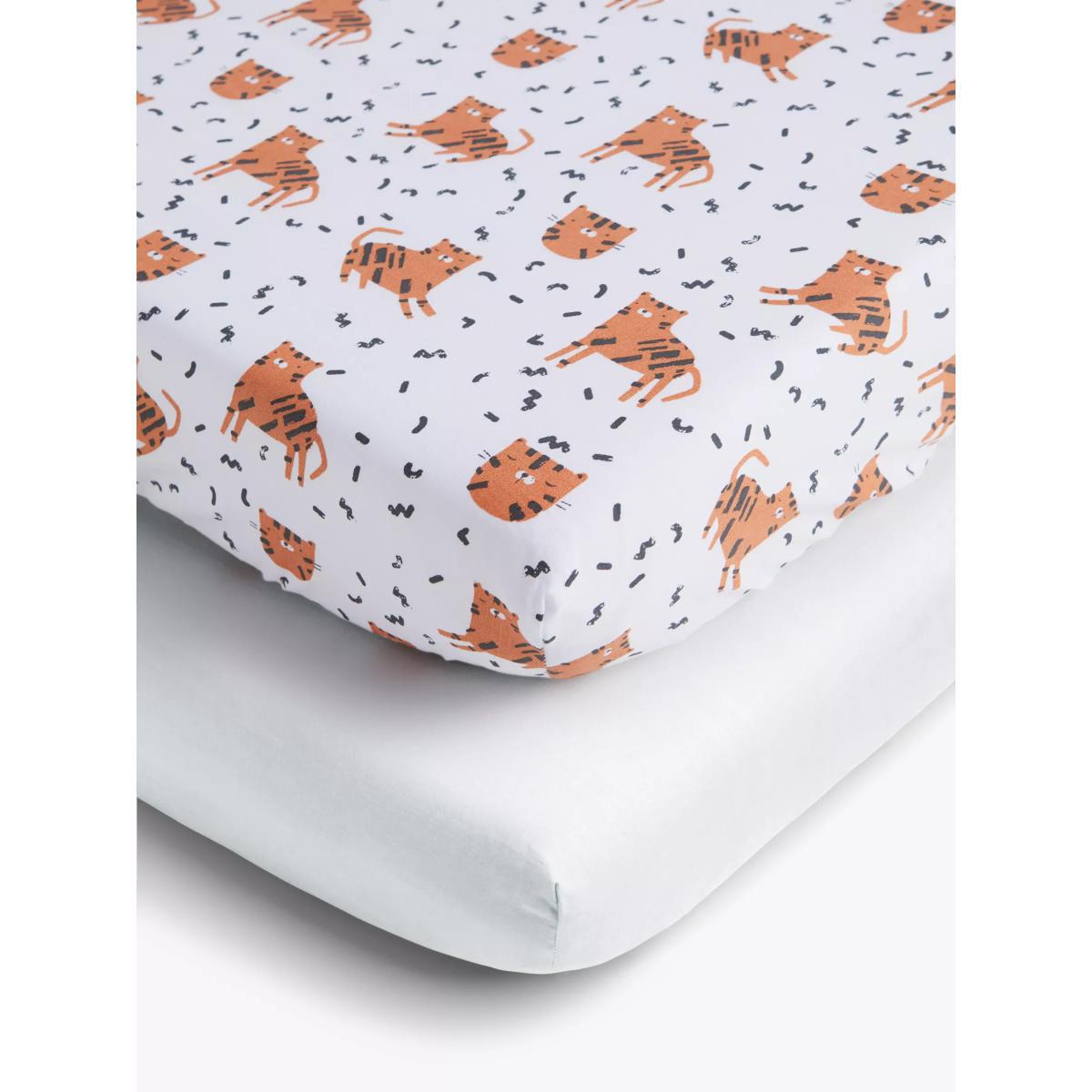 A key part of a good night's sleep, our fitted cot and cotbed sheets are made from soft and breathable cotton that is kind on delicate skin. The fitted design makes it easy to put on the mattress as well helps it stay on. This pack includes one sheet with a tiger print design and one plain sheet. With great prices and great design, our new brand offers style and quality for modern living today. Whatever you need, there's joy to be found in. The Better Cotton Initiative (BCI) is a not-for-profit organisation who exists to ‘make global cotton production better for the people who produce it, better for the environment it grows in, and better for the sector’s future. BCI works with partners around the world such as WWF, Solidaridad and Cotton Connect to train farmers to produce cotton more sustainably. By buying cotton products from John Lewis, you’re supporting the training of these farmers to use water efficiently, care for the health of the soil and natural habitats, reduce the use of the most harmful chemicals and apply principles of fair and decent work.