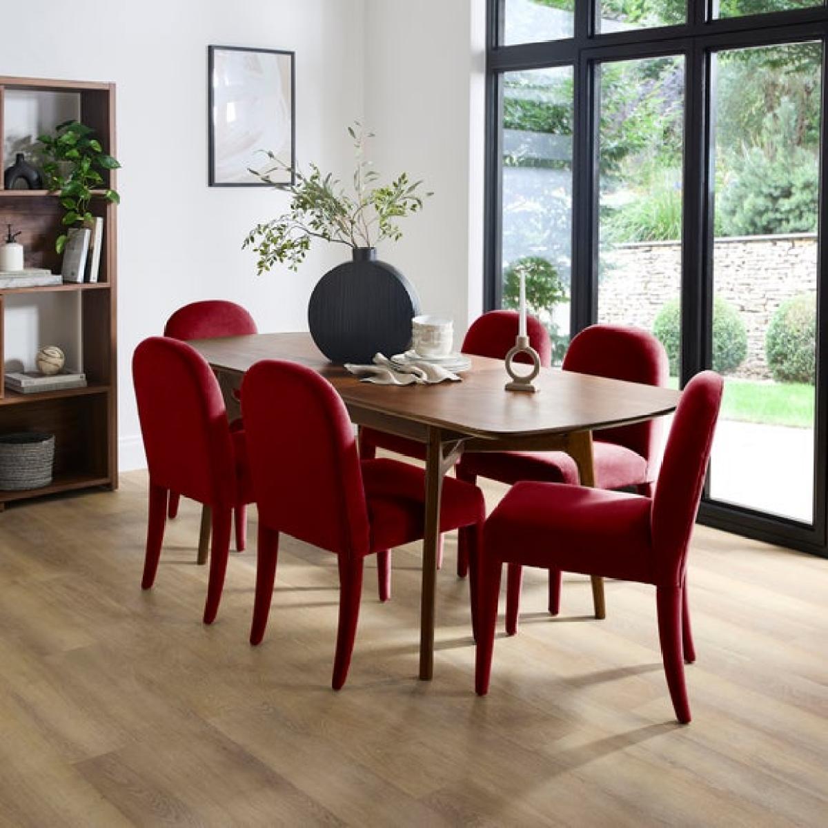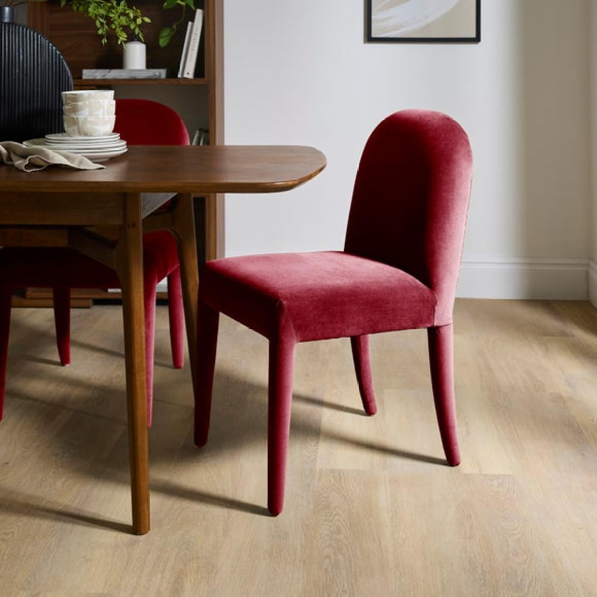 I love this velvet dining chair for its plush, inviting texture and its contemporary shape that blends well with both modern and traditional interiors. It works particularly well in schemes that incorporate rich colours or soft, muted palettes, adding a touch of luxury without feeling overly formal. Practical styling tips include pairing it with a wooden or glass table for contrast, or mixing different chairs for an eclectic look. Its padded seat and backrest make it comfortable for long dinners, making it a versatile choice for kitchens or dining rooms that prioritise comfort alongside style.