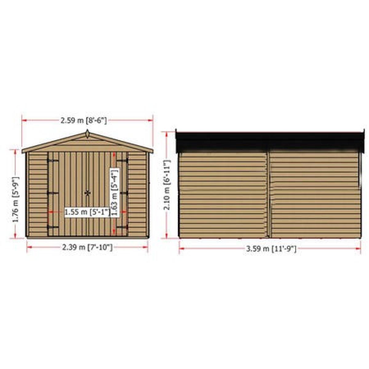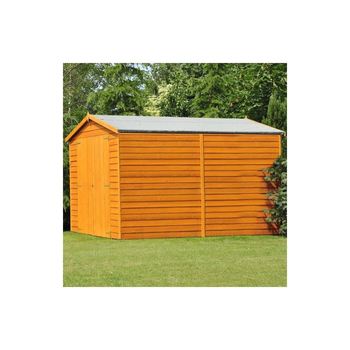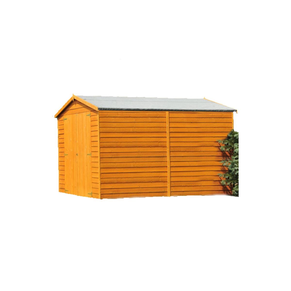 . Please note We are unable to deliver to Ireland (NI and ROI). Apologies for any inconvenience. Dimensions H210cm x W239cm x D359cm. The 12' x 8' double door overlap apex shed is a useful addition to any garden. The double doors in the 6' Gable and generous eaves height allow very easy access to the entire space. It is manufactured from high grade slow grown FSC approved European pine cladding boards over 34mm square framing. For extra security there are no windows in this model. The doors are fitted with a hasp and staple catch ready for your own padlock. Both roof and floor are constructed from solid sheet OSB. The building is dip treated with a basecoat ready for top coating by the customer immediately on installation. All fixings mineral roof felt and assembly instructions are provided. Following your order you will be contacted to select a delivery day and we can help with base information too. When measuring allowance should be made for the roof overhang and for access around the outside during subsequent treatment. For critical dimensions use the metric values; imperial dimensions are rounded for description only. On the morning of delivery you will be sent a live tracking link. Features. FSC certified timber. Overlap pine boards. Made in Britain from high-grade pine. Attractive rustic appearance12-month guarantee. Assembly required..