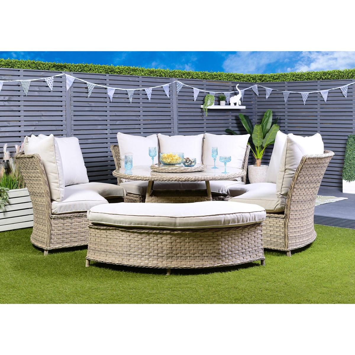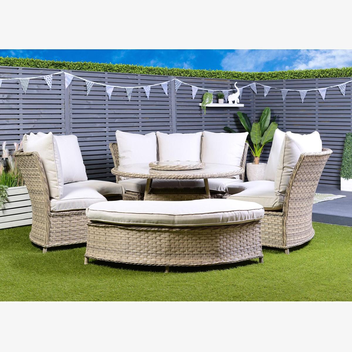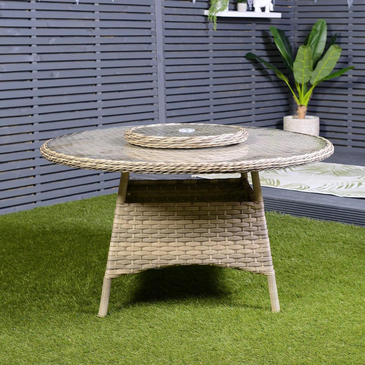 This luxuriously comfortable Apollo 5 Piece Round Lounge Set is the perfect addition to your garden, helping you to sit back and relax in style. Crafted with an aluminium frame resistant to rust, the table and chairs set is finished with wide, flat wicker and mixed woven round wicker for a rustic effect that will look stunning on any patio or situated amongst the grass in your garden. The soft, sumptuous seats are covered with fire and waterproof coating for your convenience, whilst the spacious table features a lazy susan to help you easily serve drinks and food. The stunning natural cream finish brings a light air to your outdoor space, helping you feel relaxed and comfortable when hosting BBQs, garden parties, and more.