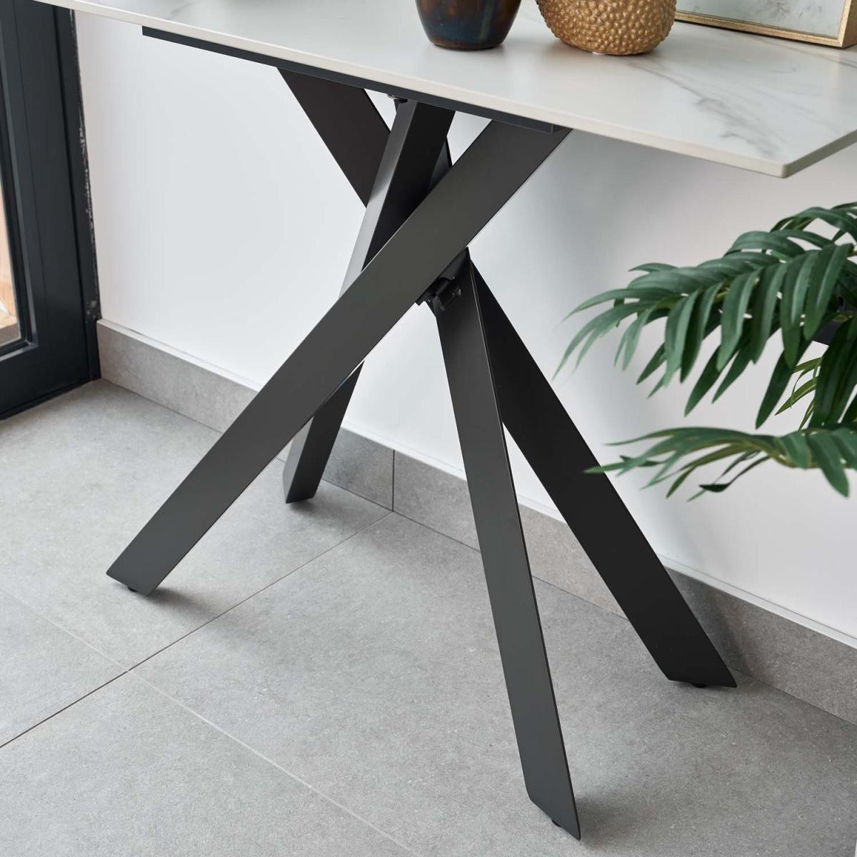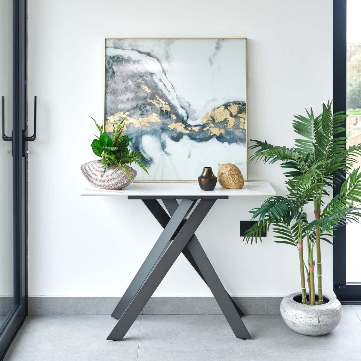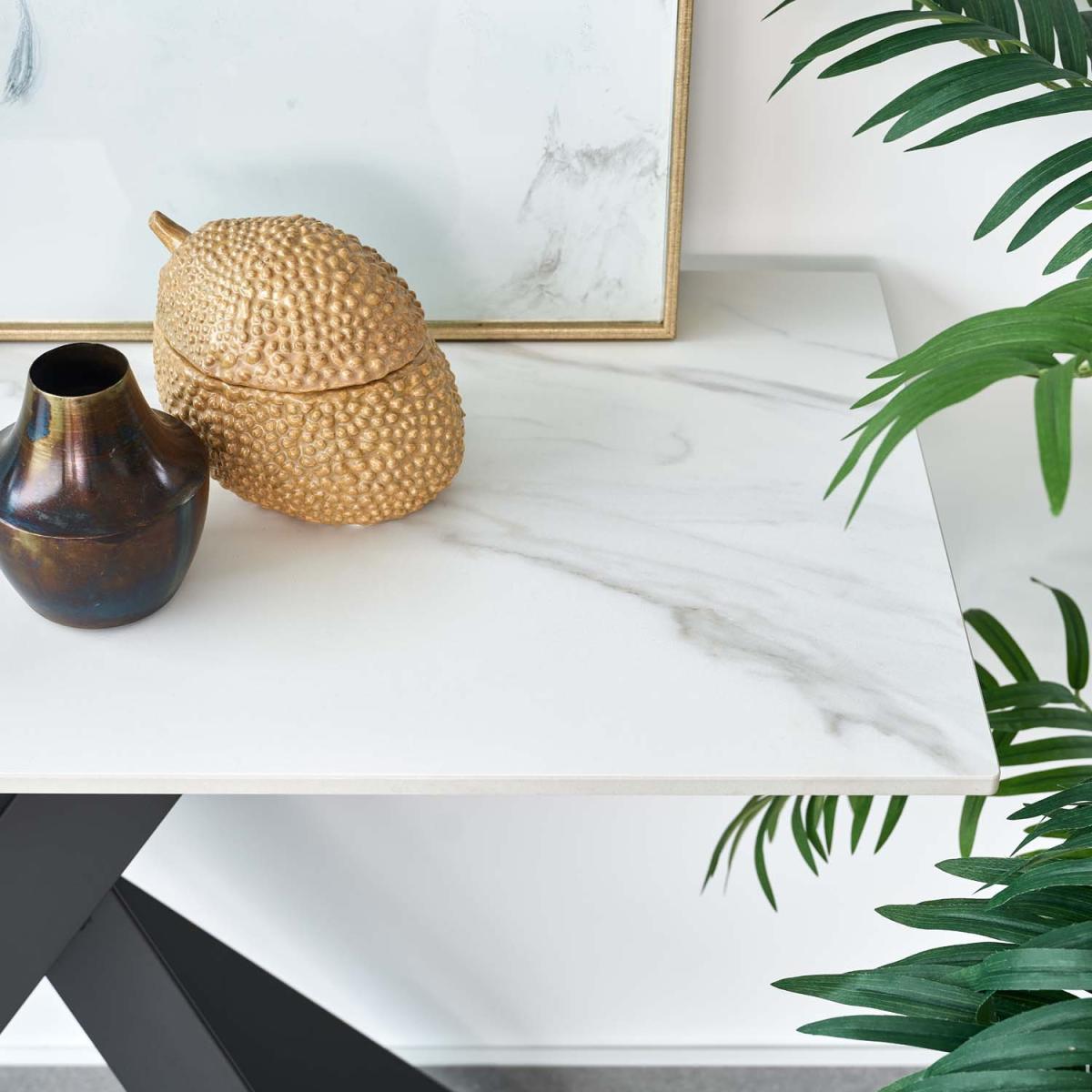 The Apollo console table is perfect for modern living spaces. The sintered stone top creates a white marble effect, while the dark grey powder coated metal legs cross over one another for the quintessential contemporary piece. The wipe-clean surface makes it the ideal practical living room accessory, while still providing a stylish addition to your home.