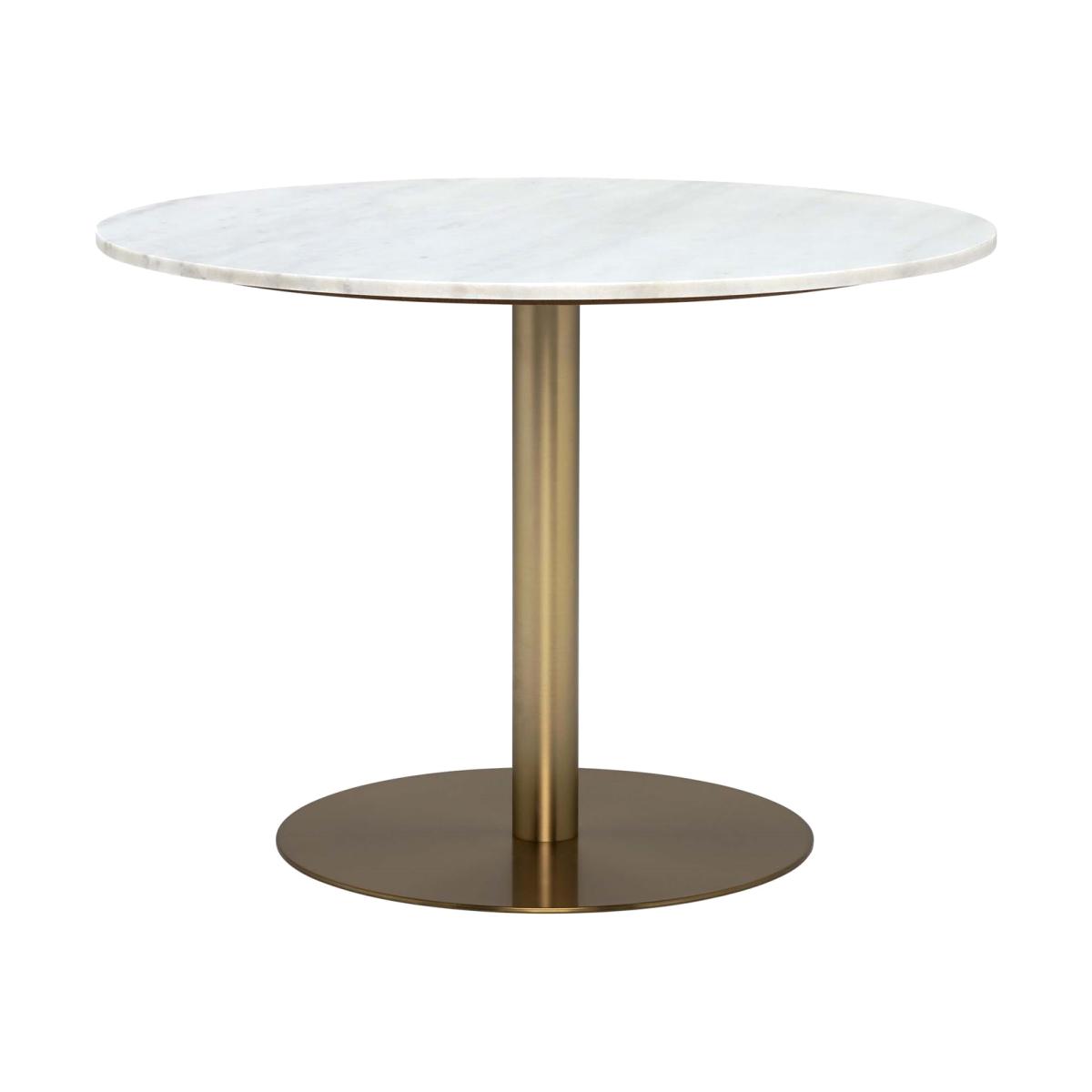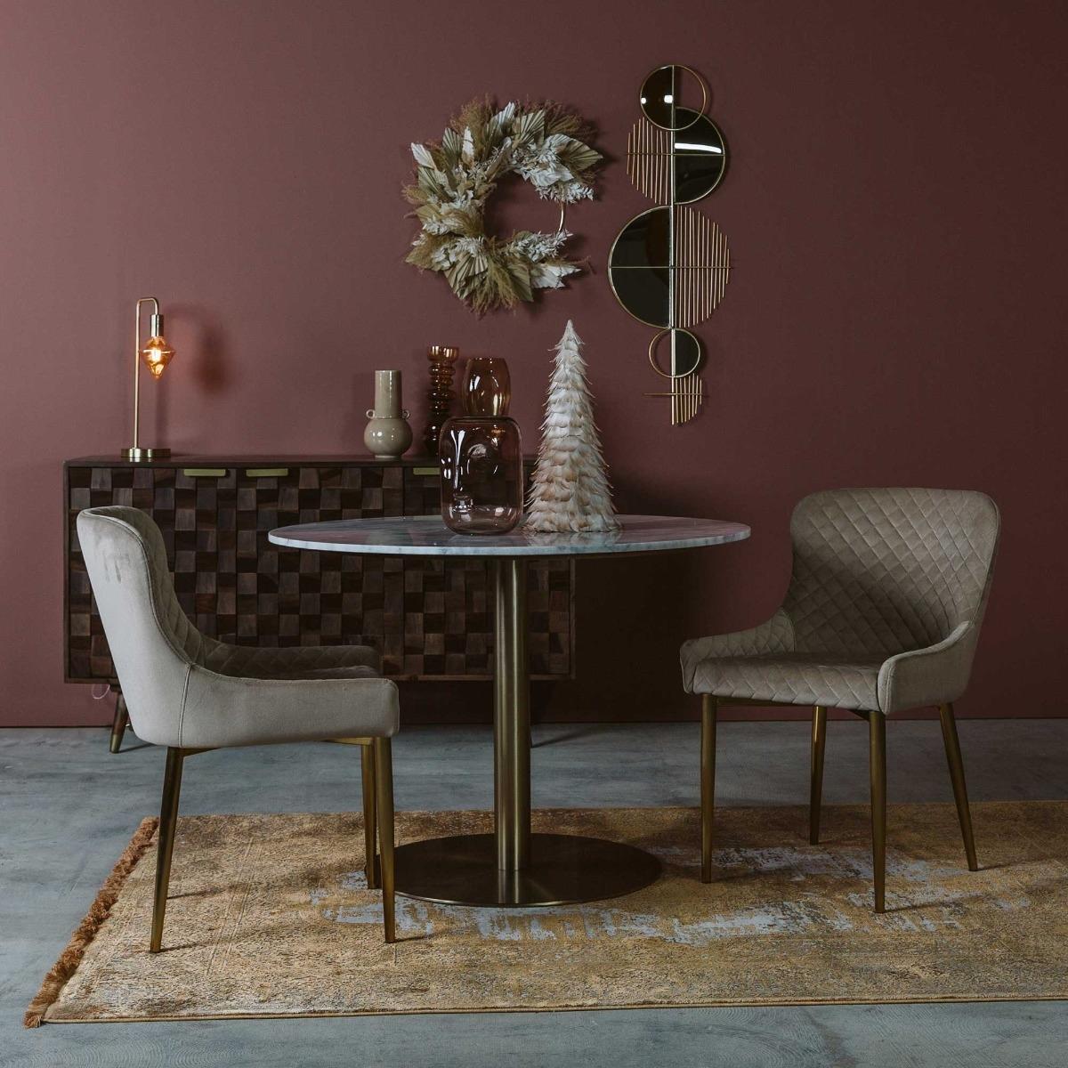 Design. Chic and modern, the Apollo Dining Table is a lovely piece that will look great in a modern home. Marble is a much sought-after trends which will remain timeless and packs an aesthetical punch when paire. D with brass. Combined and contrasting materials create a contemporary look in your dining room and the. Round design makes for easy. Socializing. At dinner times. Take your dining space to another level by pairing the Apollo Dining Table with a velvet dining chair, enhancing the contemporary feel of this piece and creating an inviting ambience.
