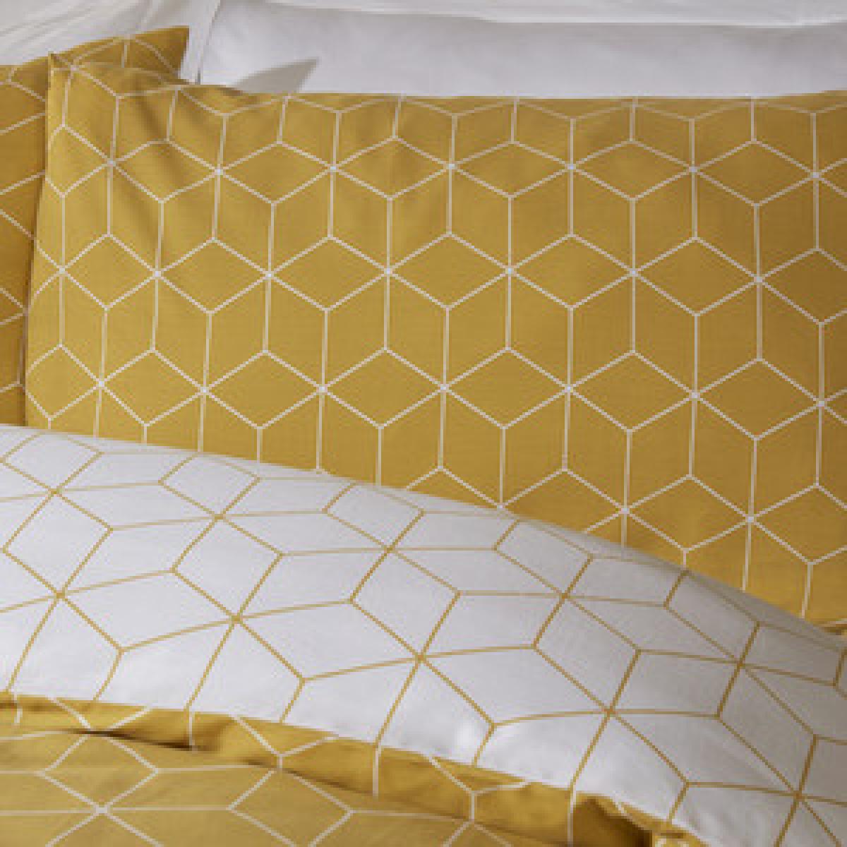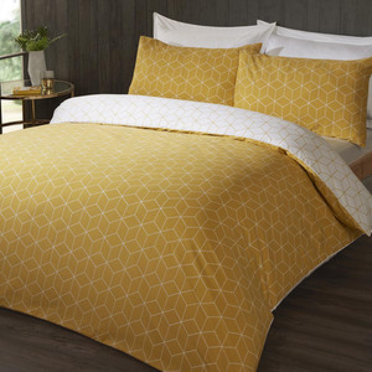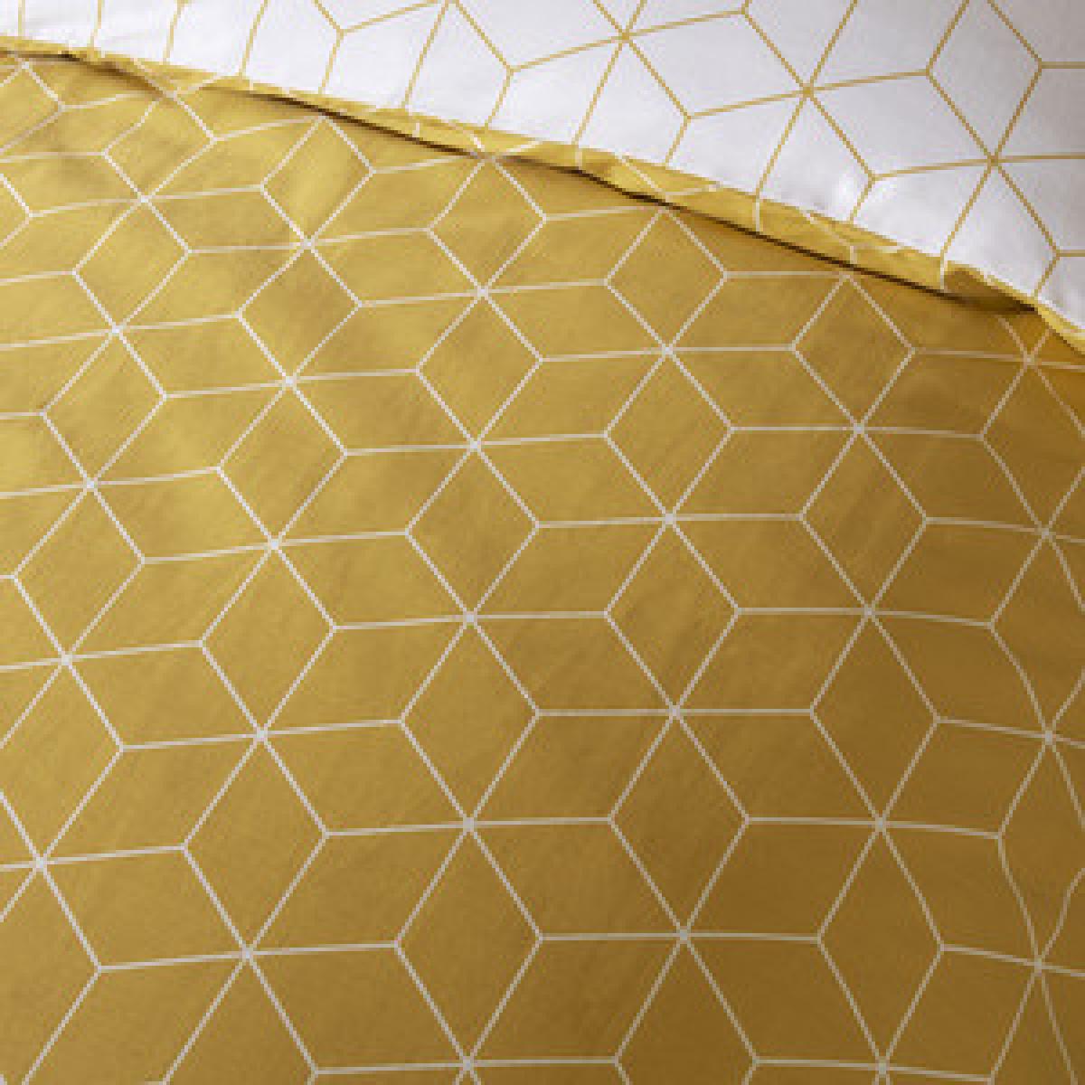 Give your bedroom an on-trend restyle with this Apollo Geo Duvet Cover and Pillowcase Set, displaying a modern geometric cube pattern in white atop a colourful base. The reverse of this stylish bedding set displays the same pattern printed in inverted colours and matching pillowcases help finish off the contemporary look.