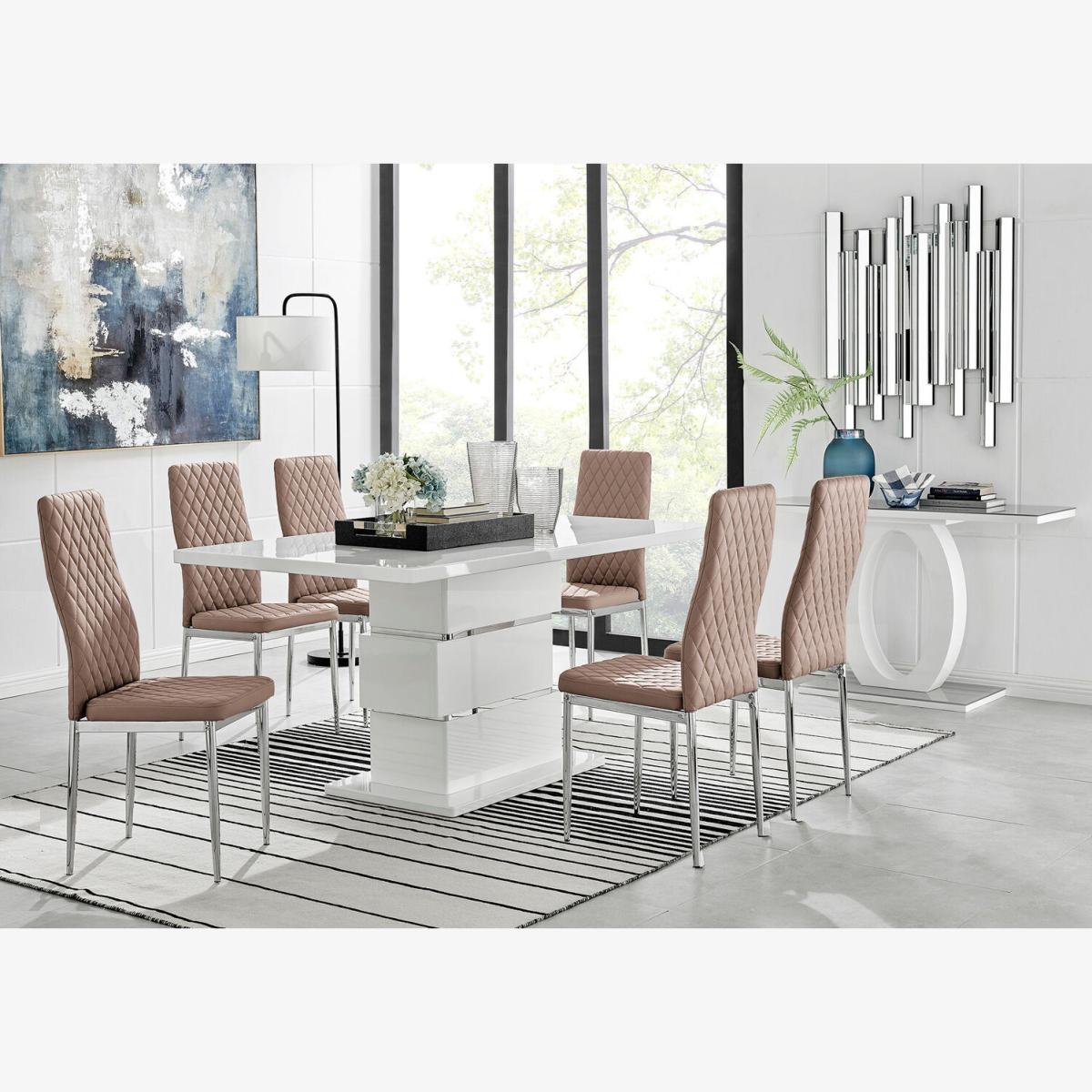 Want a dining table that really makes a statement Then look no further than the stunning Apollo high gloss dining table. The slick white high gloss base and table support creates a stunning aesthetic, whilst two lustrous bands of chrome metal add a unique finishing touch to the table design. Sitting on top of the support is a large 160x90cm white high gloss surface, which is very spacious and allows plenty of room for dining with guests. The high gloss surfaces are easy wipeclean allowing the table to look brand new for years to come! Exuding both quality and style this dining table really is a must have! Upholstered in soft faux leather and finished with diamond pattern stitching the Milan dining chairs would seamlessly fit in with most dining spaces, whilst not compromising on either style or comfort. The stylish chrome leg and hatched leather combination gives this chair a contemporary edge, whilst it's simple design allows for practical everyday usage. The chairs are made from high quality faux leather and are ergonomically designed for maximum comfort and support. They feature soft touch faux leather with a deep foam seat cushion and plastic feet to protect the floor from any damage! At an unbeatable price you cannot go wrong with these chairs!