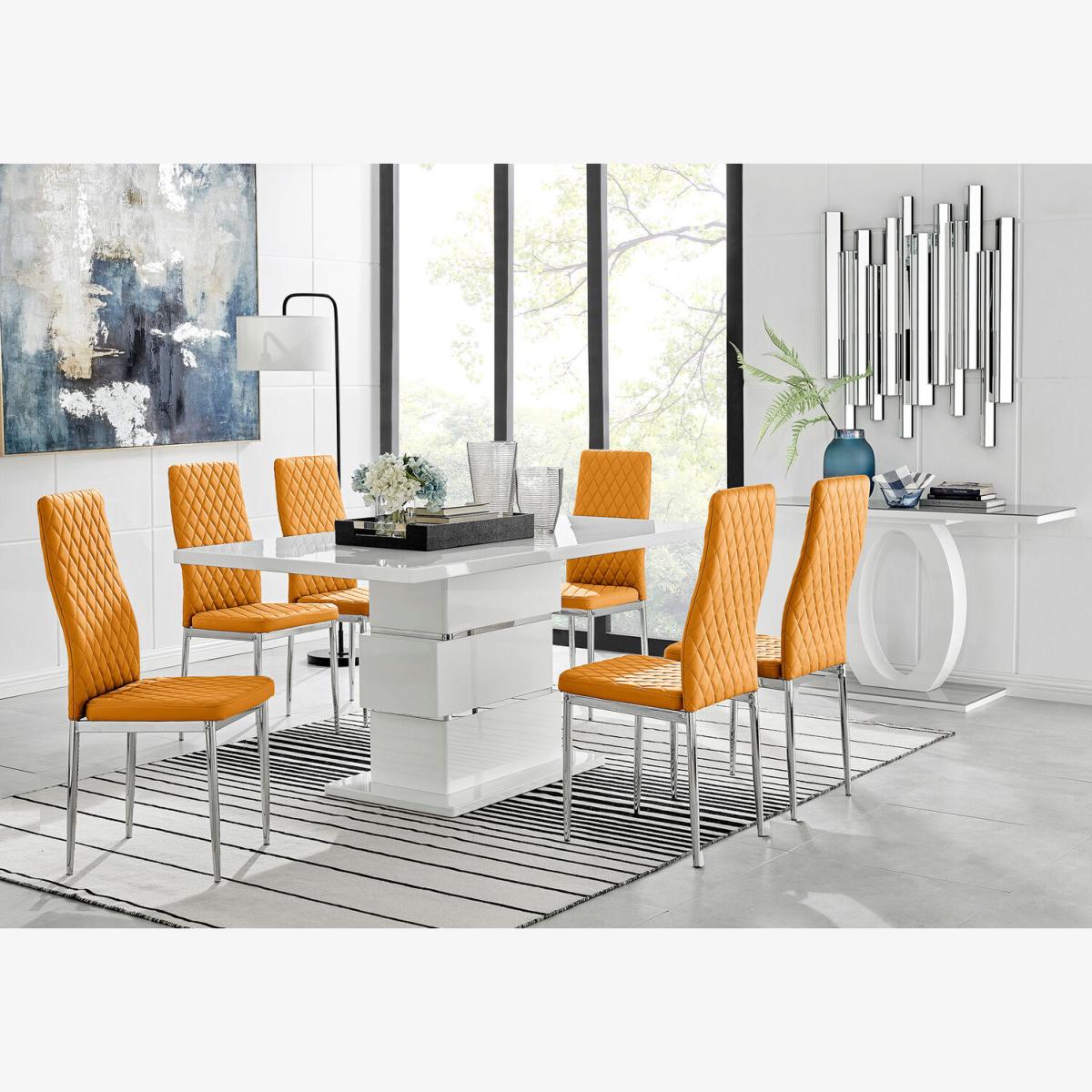 Want a dining table that really makes a statement Then look no further than the stunning Apollo high gloss dining table. The slick white high gloss base and table support creates a stunning aesthetic, whilst two lustrous bands of chrome metal add a unique finishing touch to the table design. Sitting on top of the support is a large 160x90cm white high gloss surface, which is very spacious and allows plenty of room for dining with guests. The high gloss surfaces are easy wipeclean allowing the table to look brand new for years to come! Exuding both quality and style this dining table really is a must have! Upholstered in soft faux leather and finished with diamond pattern stitching the Milan dining chairs would seamlessly fit in with most dining spaces, whilst not compromising on either style or comfort. The stylish chrome leg and hatched leather combination gives this chair a contemporary edge, whilst it's simple design allows for practical everyday usage. The chairs are made from high quality faux leather and are ergonomically designed for maximum comfort and support. They feature soft touch faux leather with a deep foam seat cushion and plastic feet to protect the floor from any damage! At an unbeatable price you cannot go wrong with these chairs!