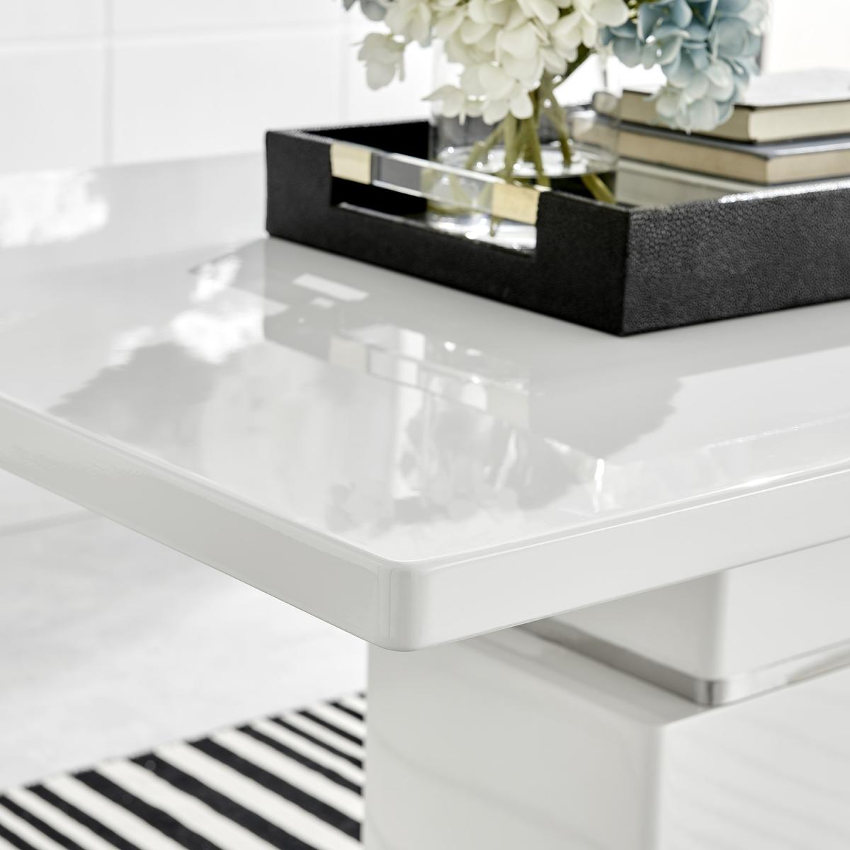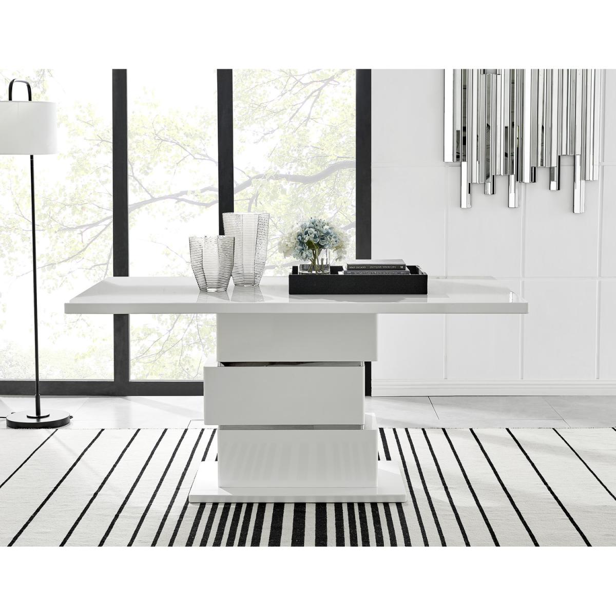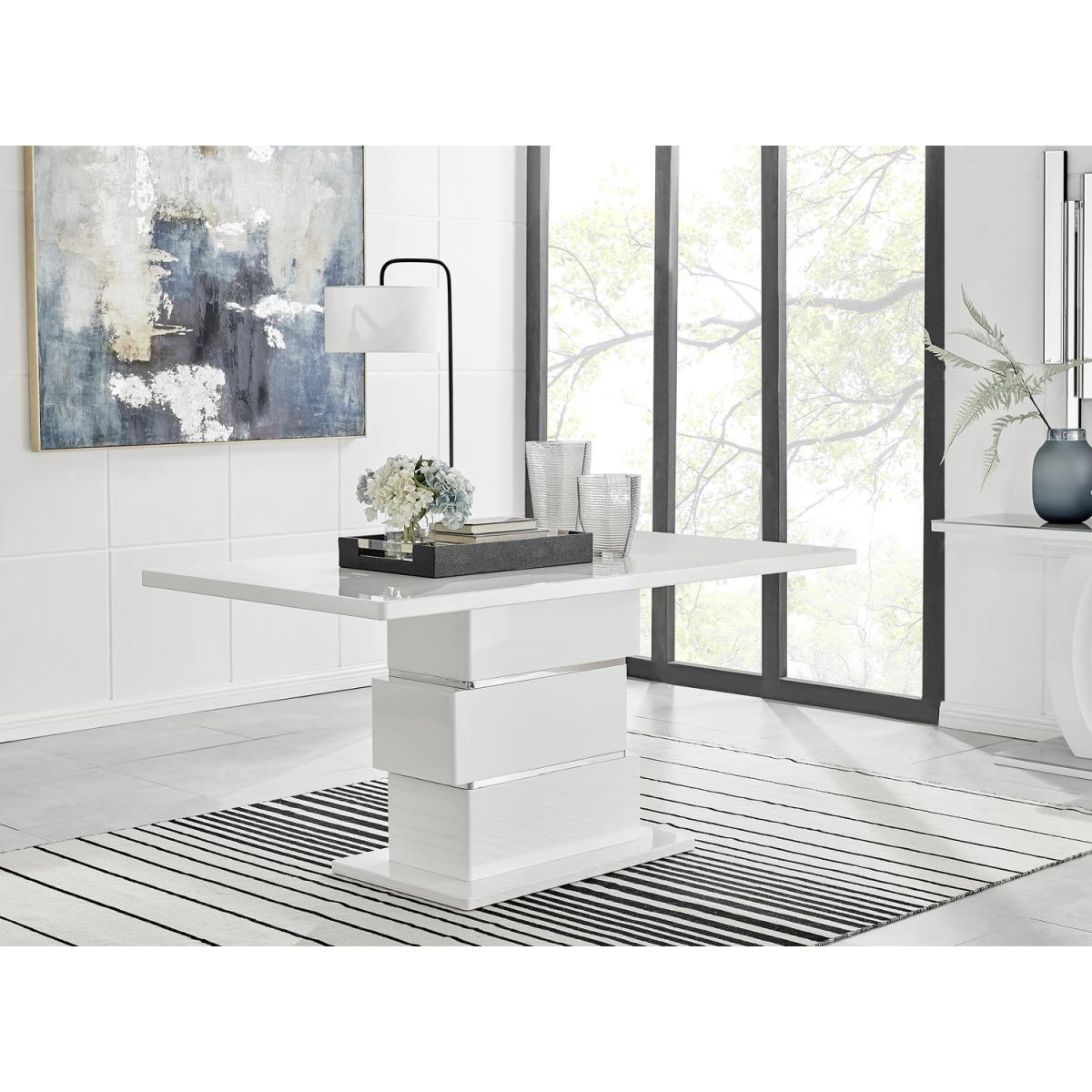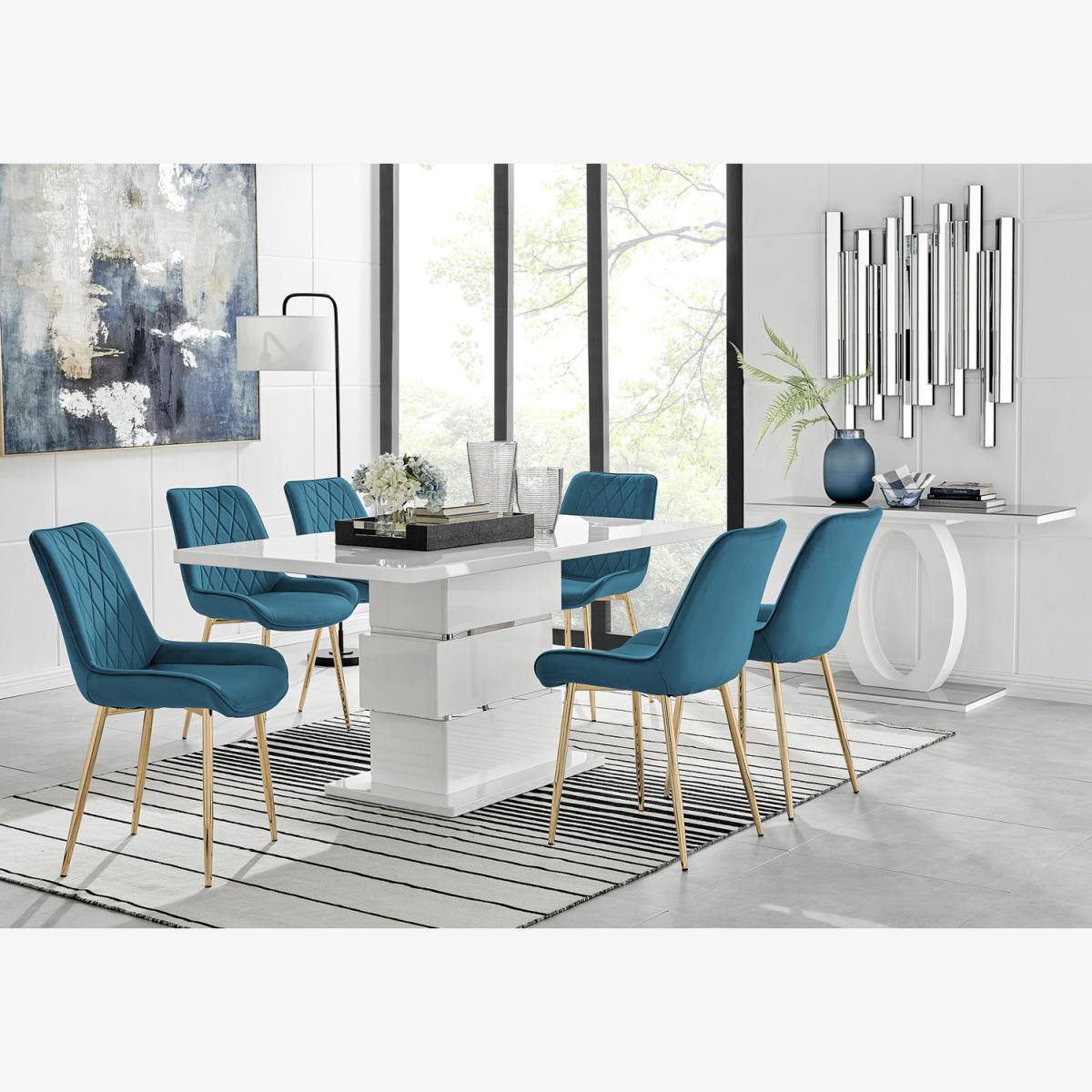Want a dining table that really makes a statement? Then look no further than the stunning Apollo high gloss and glass dining table set. The slick white high gloss base and table support creates a stunning aesthetic, whilst two lustrous bands of chrome metal add a unique finishing touch to the table design. Sitting on top of the support is a 160x90cm high gloss surface, which is very spacious and allows plenty of room for dining with guests. The high gloss surfaces are easy wipe clean allowing the table to look brand new for years to come! Combined with our luxurious velvet upholstered Pesaro dining chairs, this set will shout luxury and style! With a nod to the Mid-century modern design era, the Pesaro chairs feature gorgeous textured diamond stitching with an ergonomically designed curved seat pad blending seamlessly to the supporting medium-high backrest. Sat atop elegant slightly tapered gold effect legs, these chairs perfectly complement this luxury dining set.